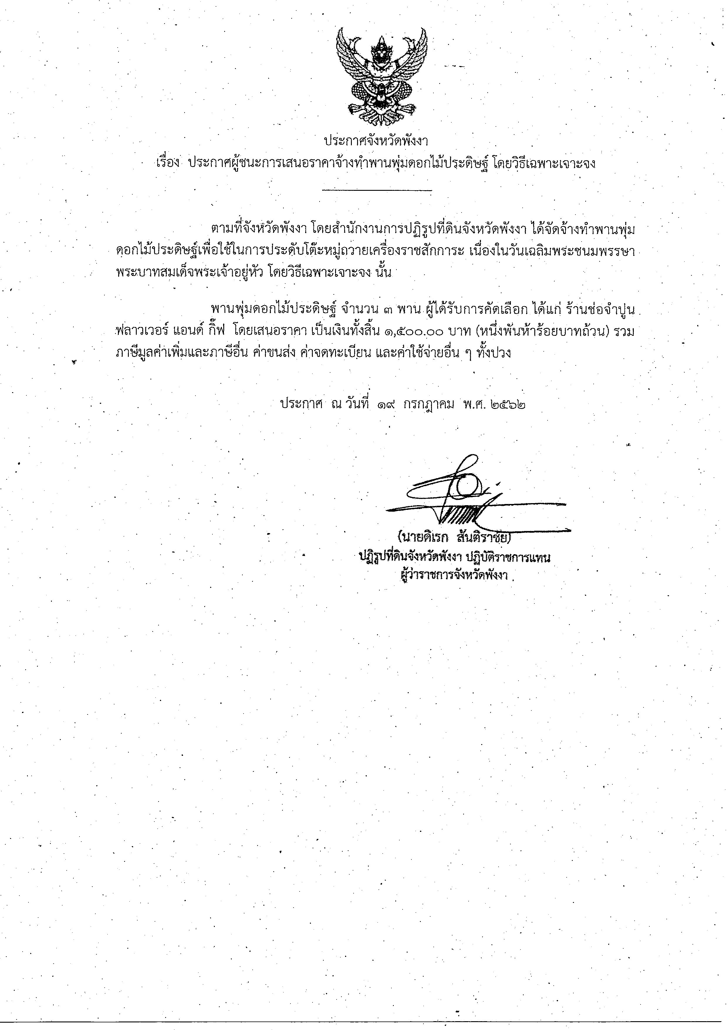 ประกาศผู้ชนะการเสนอราคาจ้างทำพานพุ่มดอกไม้ประดิษฐ์ โดยวิธีเฉพาะเจาะจง