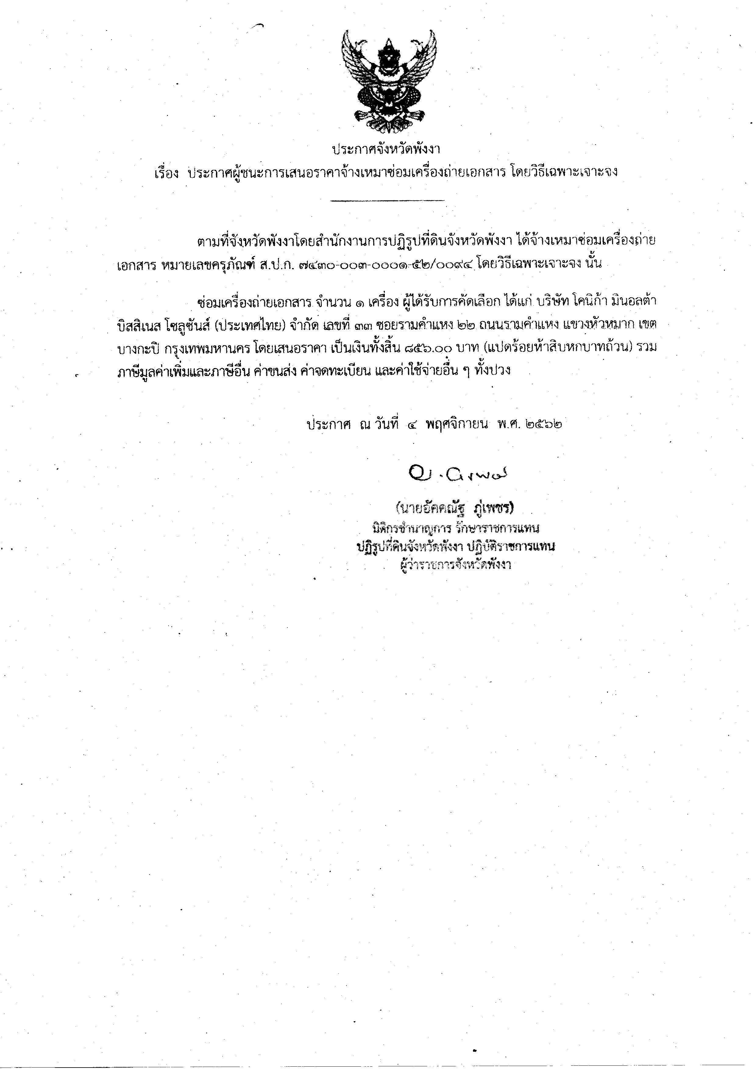 ประกาศผู้ชนะการเสนอราคาจ้างเหมาซ่อมเครื่องถ่ายเอกสาร โดยวิธีเฉพาะเจาะจง