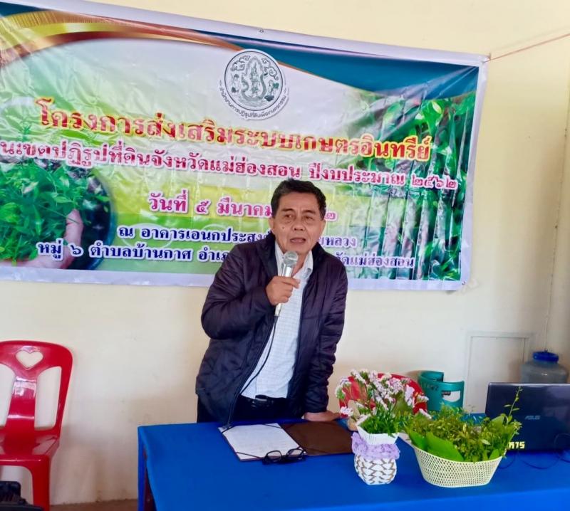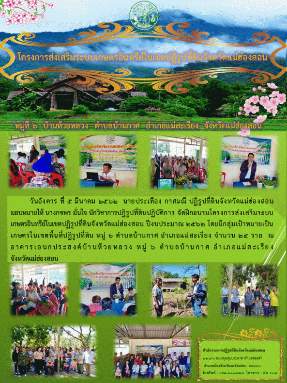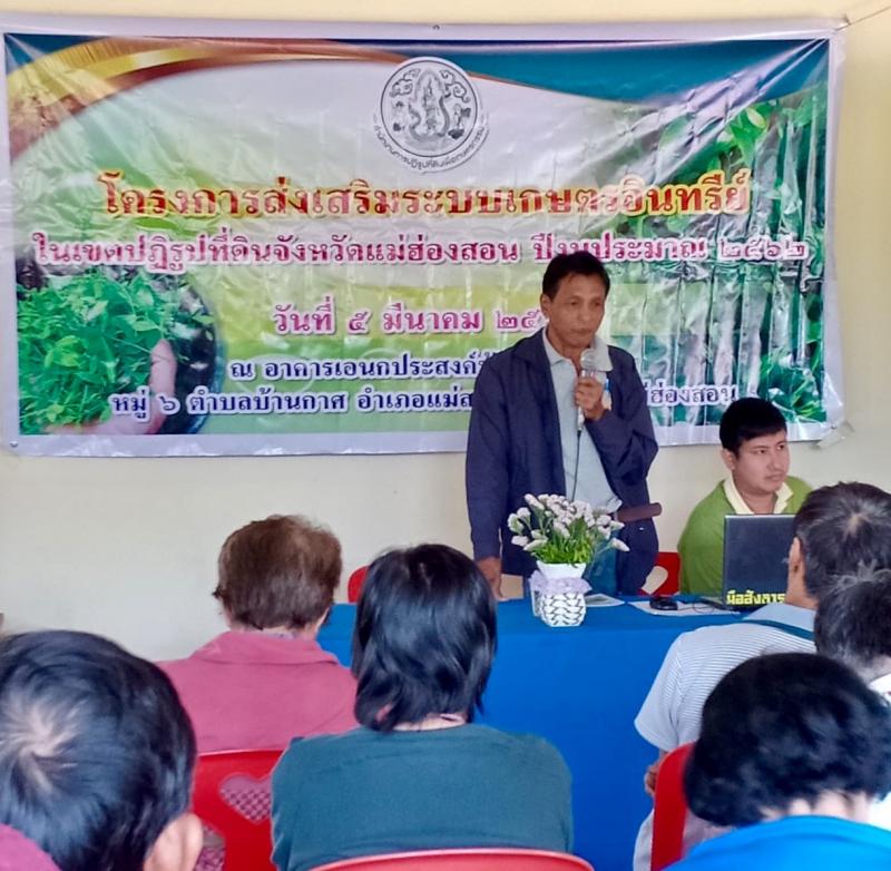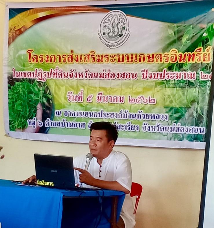 วันอังคาร ที่ 5 มีนาคม 2562 นายประเทือง กาศมณี ปฏิรูปที่ดินจังหวัดแม่ฮ่องสอน มอบหมายให้ นางกชพร มั่นใจ นักวิชาการปฏิรูปที่ดินปฏิบัติการ ดำเนินการฝึกอบรมโครงการส่งเสริมระบบเกษตรอินทรีย์ในเขตปฏิรูปที่ดินจังหวัดแม่ฮ่องสอน ประจำปีงบประมาณ 2562 โดยมีเกษตรกรกลุ่มเป้าหมายเป็นกลุ่มผู้ปลูกผักหวานป่า ในพื้นที่เขตปฏิรูปที่ดิน หมู่ที่ 6 ตำบลบ้านกาศ อำเภอแม่สะเรียง จำนวน 25 ราย ณ อาคารเอนกประสงค์บ้านห้วยหลวง หมู่ที่ 6 ตำบลบ้านกาศ อำเภอแม่สะเรียง จังหวัดแม่ฮ่องสอน