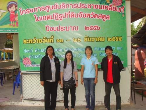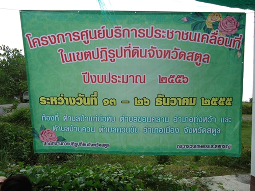 สำนักงานการปฏิรูปที่ดินจังหวัดสตูล ได้ออกศูนย์บริการประชาชนเคลื่อนที่ ปีงบประมาณ 2556 ระหว่างวันที่ 13 - 26 ธันวาคม 2555 เวลา 13.00 - 15.00 น. ท้องที่ ตำบลขอนคลาน ตำบลป่าแก่บ่อหิน ตำบลควนขัน และตำบลบ้านควน เพื่อบริการประชาชนในด้านการให้คำปรึกษาและติดตามการทำประโยชน์ของเกษตรกรในเขตปฏิรูปที่ดินจังหวัดสตูล