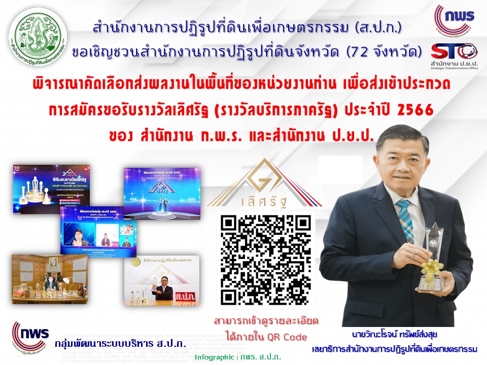 วันศุกร์ที่ 13 มกราคม 2566 เวลา 14.00 – 16.00 น. กลุ่มพัฒนาระบบบริหาร ส.ป.ก. (กพร. ส.ป.ก.) โดยผู้อำนวยการกลุ่มพัฒนาระบบบริหาร (นางสาวกานดา ศากยะโรจน์) พร้อมด้วยเจ้าหน้าที่ ได้จัดให้มีการประชุมชี้แจงการคัดเลือกผลงานการปฏิรูปที่ดิน เพื่อส่งประกวดรางวัลเลิศรัฐ ประจำปี พ.ศ. 2566 ผ่านระบบออนไลน์ (ระบบ ZOOM Meeting) ให้กับเจ้าหน้าที่ ส.ป.ก. ส่วนกลาง และภูมิภาค ตามที่สำนักงาน ก.พ.ร. ได้เปิดให้ส่วนราชการพิจารณาคัดเลือกส่งผลงานในพื้นที่ของหน่วยงาน เพื่อส่งเข้าประกวดการสมัครขอรับรางวัลเลิศรัฐ (รางวัลบริการภาครัฐ) ประจำปี 2566 ใน 3 สาขา ได้แก่ 1) สาขาคุณภาพการบริหารจัดการภาครัฐ 2) สาขาบริการภาครัฐ 3) สาขาการบริหารราชการแบบมีส่วนร่วม เพื่อส่งเสริมให้หน่วยงานของรัฐพัฒนาคุณภาพการให้บริการ และประชาชนได้รับการบริการที่สะดวก รวดเร็ว โปร่งใส และมีความพึงพอใจ ซึ่งได้แจ้งเวียนหน่วยงานพิจารณาคัดเลือกผลงานการปฏิรูปที่ดินที่ประสงค์สมัครขอรับรางวัลฯ เพื่อใช้เป็นผลงานตามตัวชี้วัดที่ 11 ของ ส.ป.ก. จังหวัด นั้น