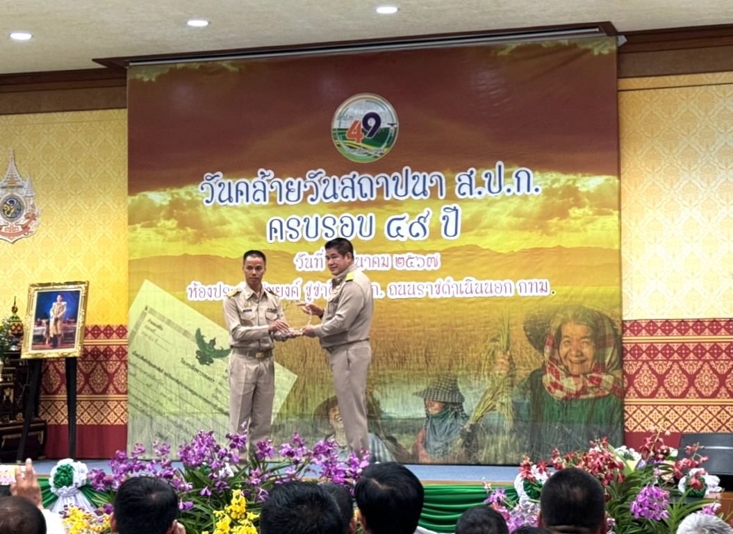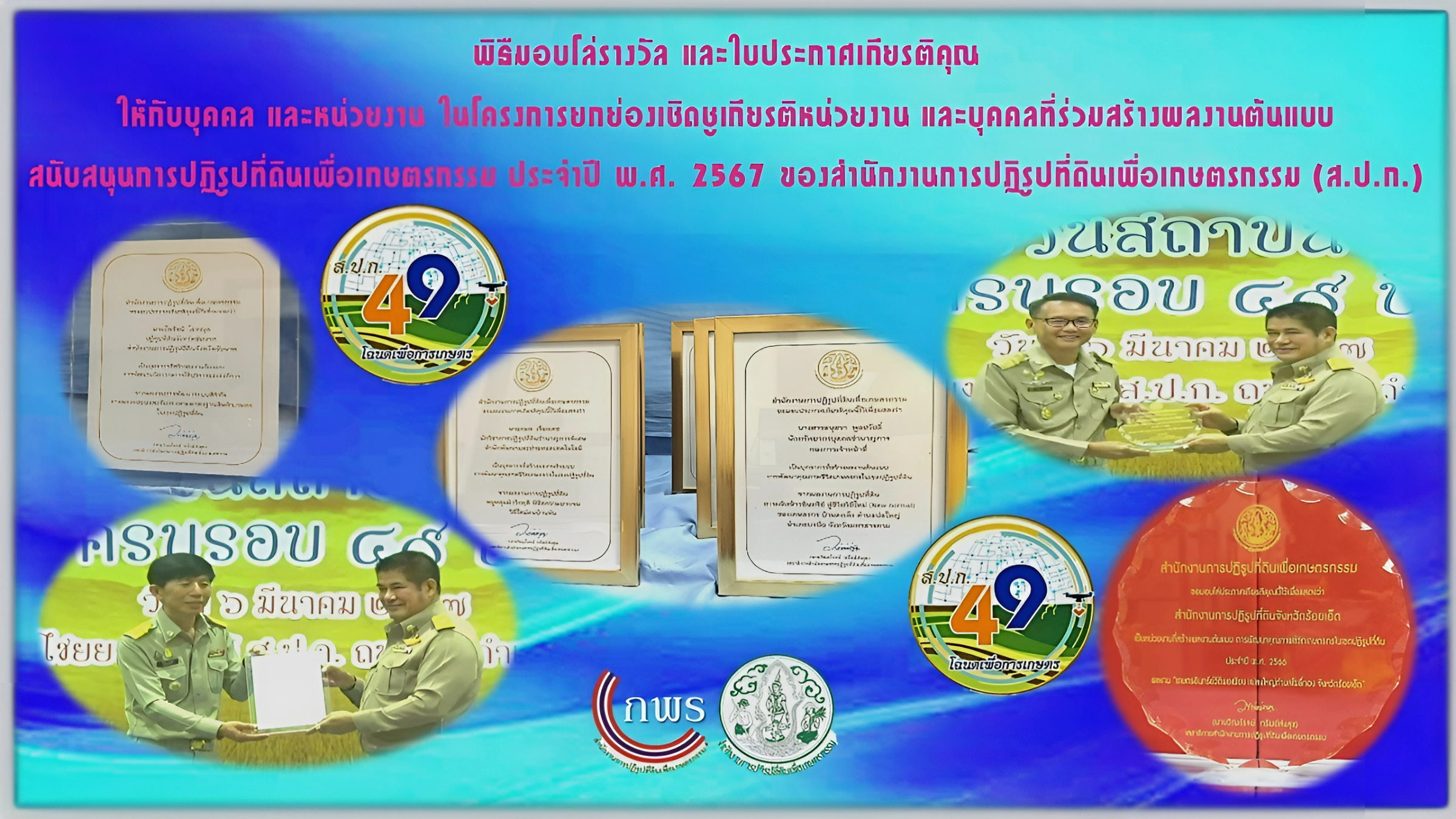โดยพิธีมอบโล่รางวัล พร้อมใบประกาศเกียรติคุณให้กับบุคคล และหน่วยงานในโครงการยกย่องเชิดชูเกียรติหน่วยงานและบุคคลที่ร่วมสร้างผลงานต้นแบบ สนับสนุนการปฏิรูปที่ดินเพื่อเกษตรกรรม ประจำปี พ.ศ. 2567 ของสำนักงานการปฏิรูปที่ดินเพื่อเกษตรกรรม (ส.ป.ก.) ในครั้งนี้จัดขึ้น ณ ห้องประชุมไชยยงค์ ชูชาติ ส.ป.ก. ถนนราชดำเนินนอก กรุงเทพฯ ภายในงานวันคล้ายวันสถาปนาสำนักงานการปฏิรูปที่ดินเพื่อเกษตรกรรม ครบรอบ 49 ปี