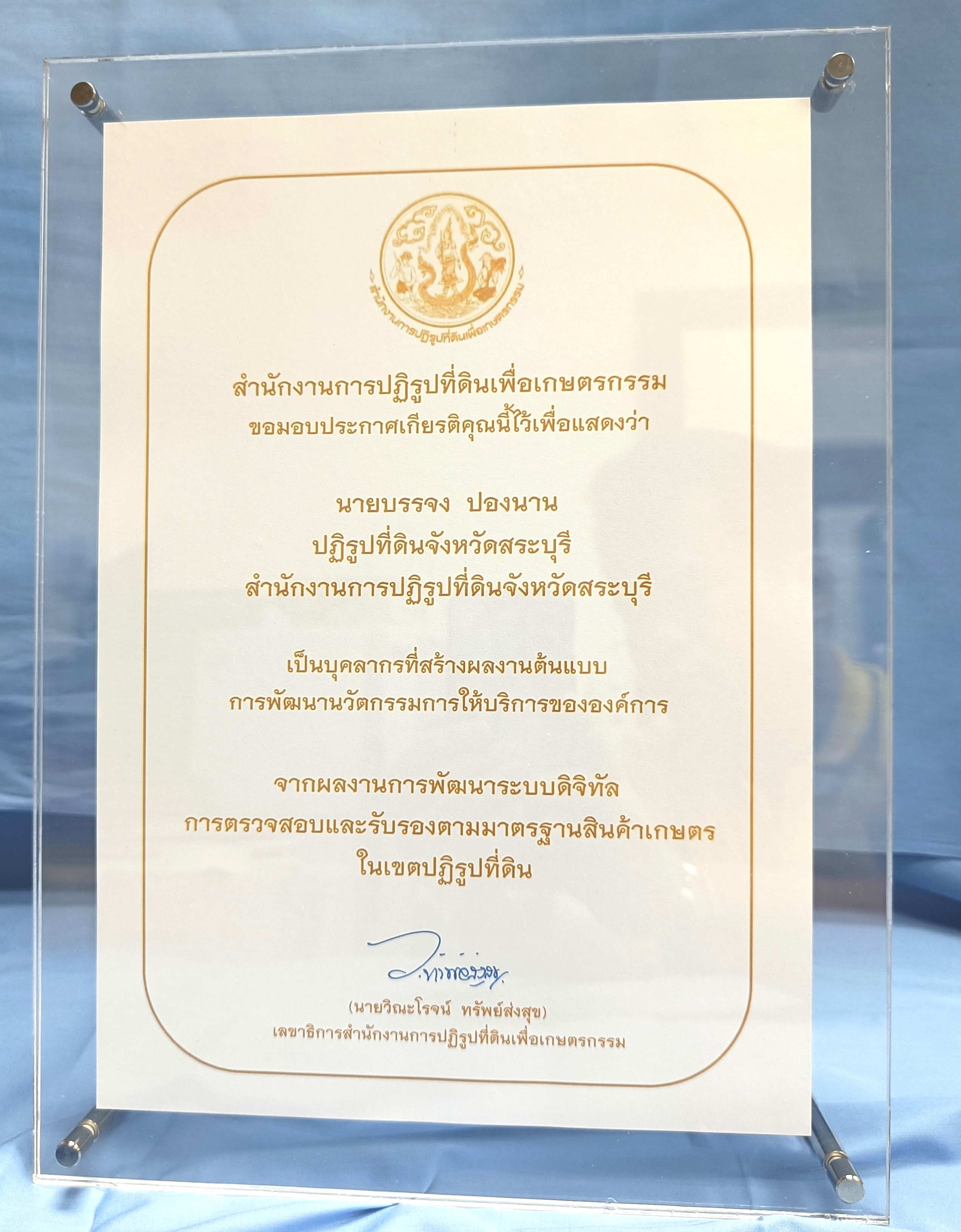 วันพุธที่ 6 มีนาคม 2567 เวลา 09.30 น. สำนักงานการปฏิรูปที่ดินเพื่อเกษตรกรรม (ส.ป.ก.) ได้จัดพิธีมอบโล่รางวัล พร้อมใบประกาศเกียรติคุณให้กับบุคคล และหน่วยงาน ในโครงการยกย่องเชิดชูเกียรติหน่วยงานและบุคคลที่ร่วมสร้างผลงานต้นแบบ สนับสนุนการปฏิรูปที่ดินเพื่อเกษตรกรรม ประจำปี พ.ศ. 2567 ของ ส.ป.ก. โดยมีท่าน รัฐมนตรีว่าการกระทรวงเกษตรและสหกรณ์ (ร้อยเอก ธรรมนัส พรหมเผ่า ) ให้เกียรติเดินทางมาเป็นประธานในพิธี พร้อมมอบโล่รางวัล และใบประกาศเกียรติคุณให้กับเจ้าหน้าที่ ส.ป.ก. พร้อมด้วยรัฐมนตรีช่วยว่าการกระทรวงเกษตรและสหกรณ์ (นายไชยา พรหมา) และรัฐมนตรีช่วยว่าการกระทรวงเกษตรและสหกรณ์ (นายอนุชา นาคาศัย) รวมทั้งปลัดกระทรวงเกษตรและสหกรณ์ (นายประยูร อินสกุล) พร้อมด้วยผู้บริหารกระทรวงเกษตรและสหกรณ์ และหน่วยงานภายนอก เดินทางมาร่วมงานในครั้งนี้ด้วย โดยตามที่คณะทำงานพิจารณาผลงานการปฏิรูปที่ดินเพื่อส่งประกวดรับรางวัล ของ สำนักงานการปฏิรูปที่ดินเพื่อเกษตรกรรม (ส.ป.ก.) ได้ส่งเสริมให้หน่วยงาน และบุคลากรในสังกัดของ ส.ป.ก. พัฒนาคุณภาพการให้บริการ เพื่อให้ผู้รับบริการและผู้มีส่วนได้ส่วนเสีย ได้รับการบริการที่สะดวก รวดเร็ว โปร่งใส และมีความพึงพอใจ เพื่อให้เกิดขวัญกำลังใจแก่หน่วยงาน และบุคลากร ของ ส.ป.ก. และเป็นแบบอย่างที่ดีในการดำเนินงานกับหน่วยงานและบุคลากรอื่นๆ ของ ส.ป.ก. จึงเห็นควรให้มีการมอบประกาศเกียรติคุณ แก่หน่วยงาน และบุคลากรที่เกี่ยวข้องและมีส่วนร่วมสร้างผลงานต้นแบบ สนับสนุนการปฏิรูปที่ดินเพื่อเกษตรกรรม ประจำปีงบประมาณ พ.ศ. 2567 เพื่อยกย่องและสร้างขวัญและกำลังใจให้ หน่วยงาน และบุคลากร ในการพัฒนาคุณภาพการให้บริการ ส่งเสริมให้บุคลากรมีการแสดงออกถึงความผูกพันต่อองค์กร รวมทั้งเป็นการส่งเสริมให้ หน่วยงาน และบุคลากร มีส่วนร่วม สร้างการทำงานเป็นทีม (Teamwork) มีความกระตือรือร้น ในการปฏิบัติราชการ และส่งเสริมให้ หน่วยงาน และบุคลากร ให้ความสำคัญกับการปฏิบัติงานที่ส่งเสริมให้เกิดความยั่งยืนในการปฏิรูปที่ดิน และสามารถรองรับการเปลี่ยนแปลงที่รวดเร็วได้ นั้น