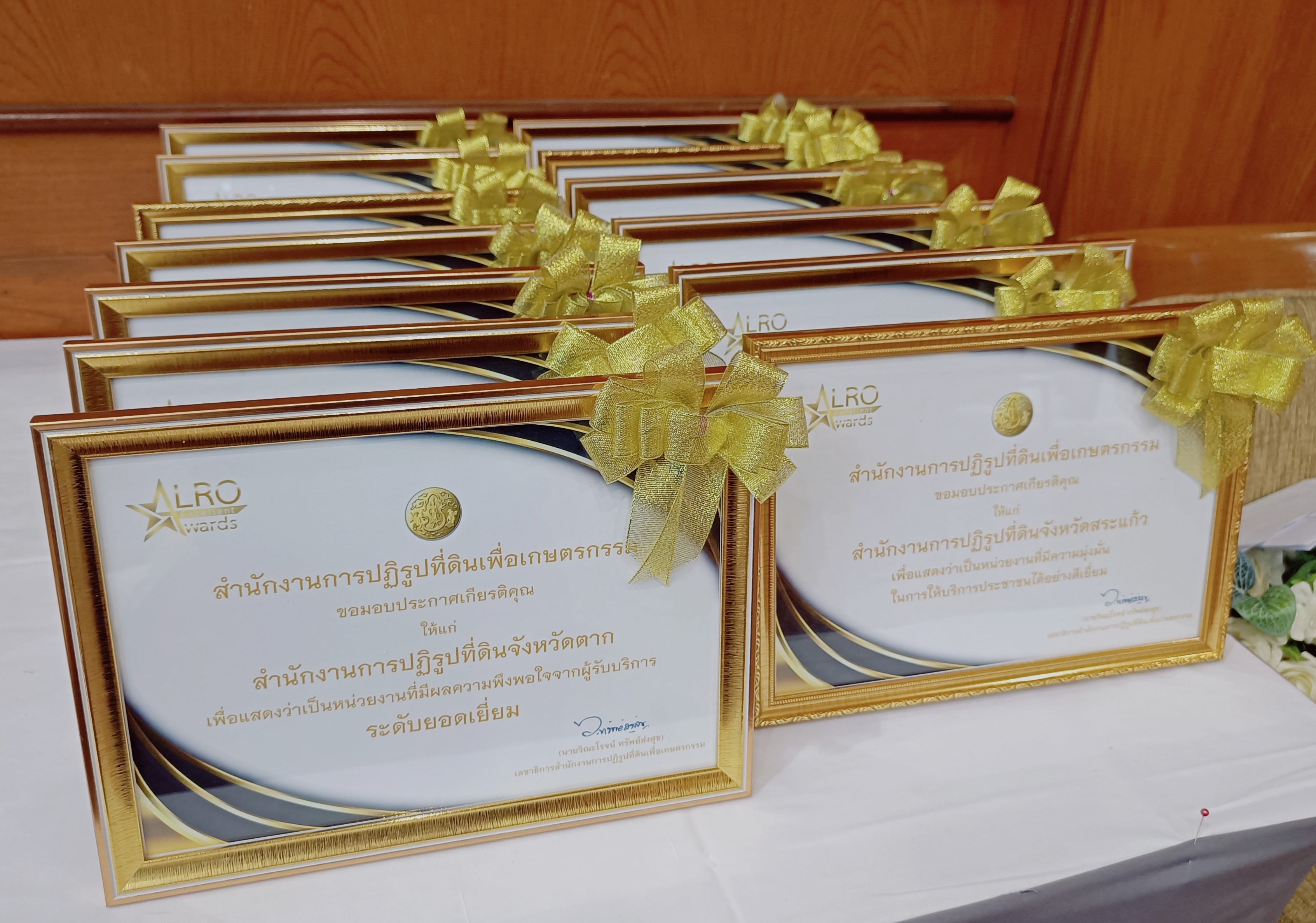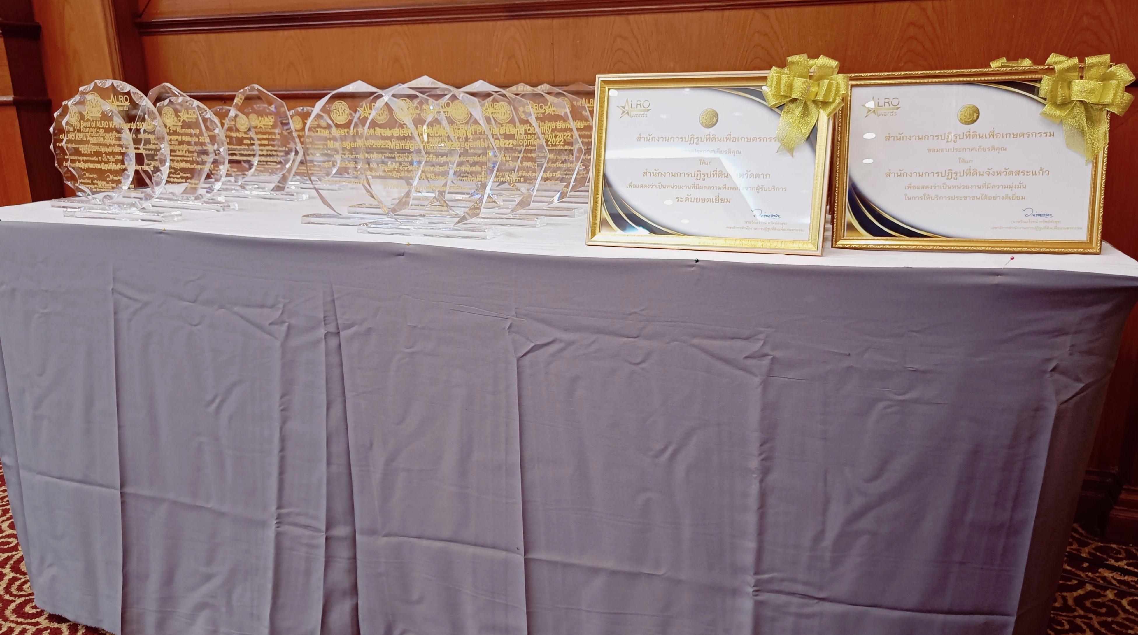 11 รางวัล The Best of Public Land Management 2022 รางวัลสาขาการดำเนินงานตามพันธกิจ ส.ป.ก. (ALRO Mission) (เสนอโดยเจ้าภาพตัวชี้วัด) สำนักงานการปฏิรูปที่ดินจังหวัดสระแก้ว (ผลงานด้านการจัดที่ดินรัฐดีเด่น (กลุ่มที่ 3 จังหวัดที่มีแผนงาน 500 ราย ขึ้นไป) ปี พ.ศ. 2565)