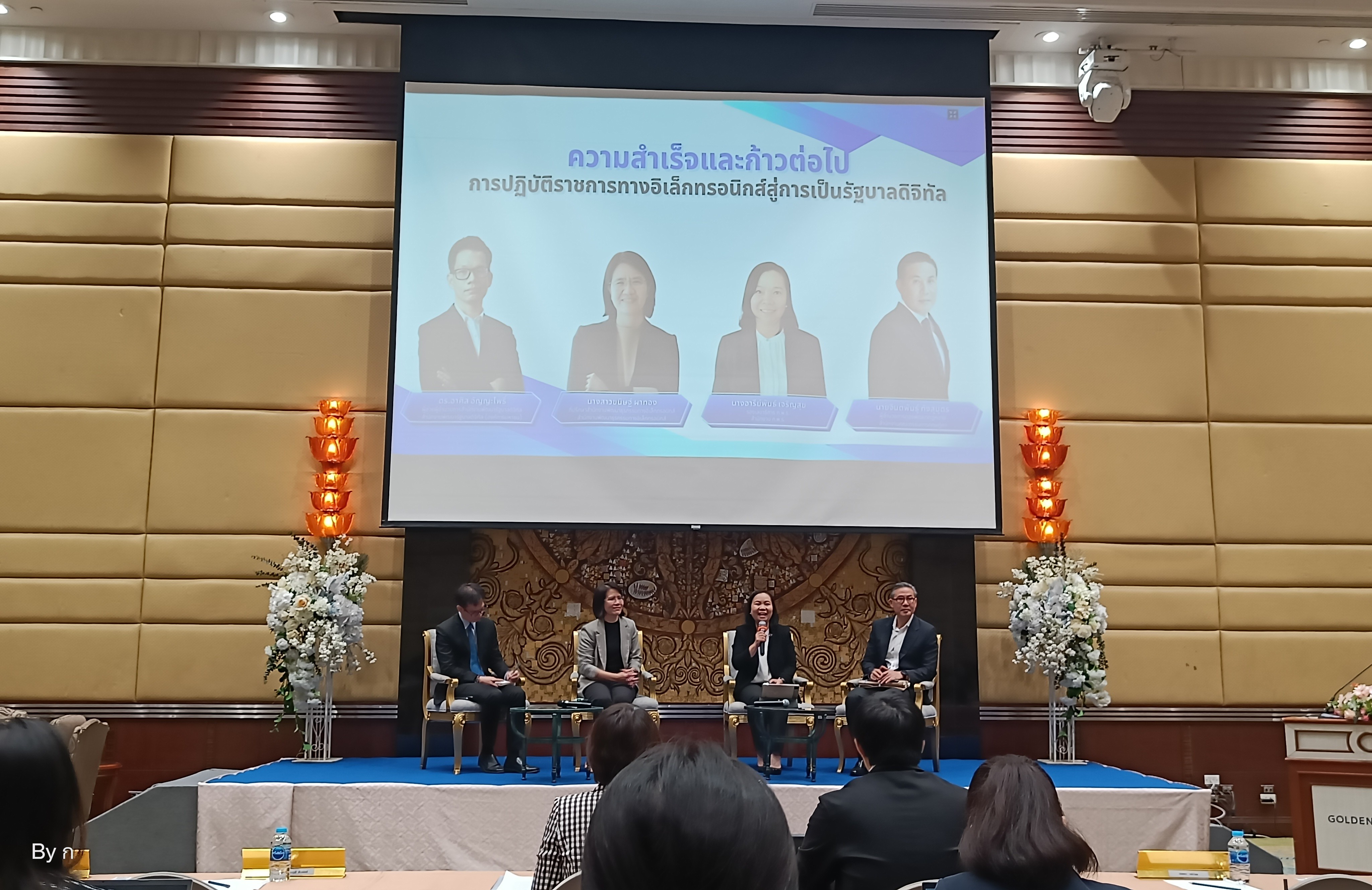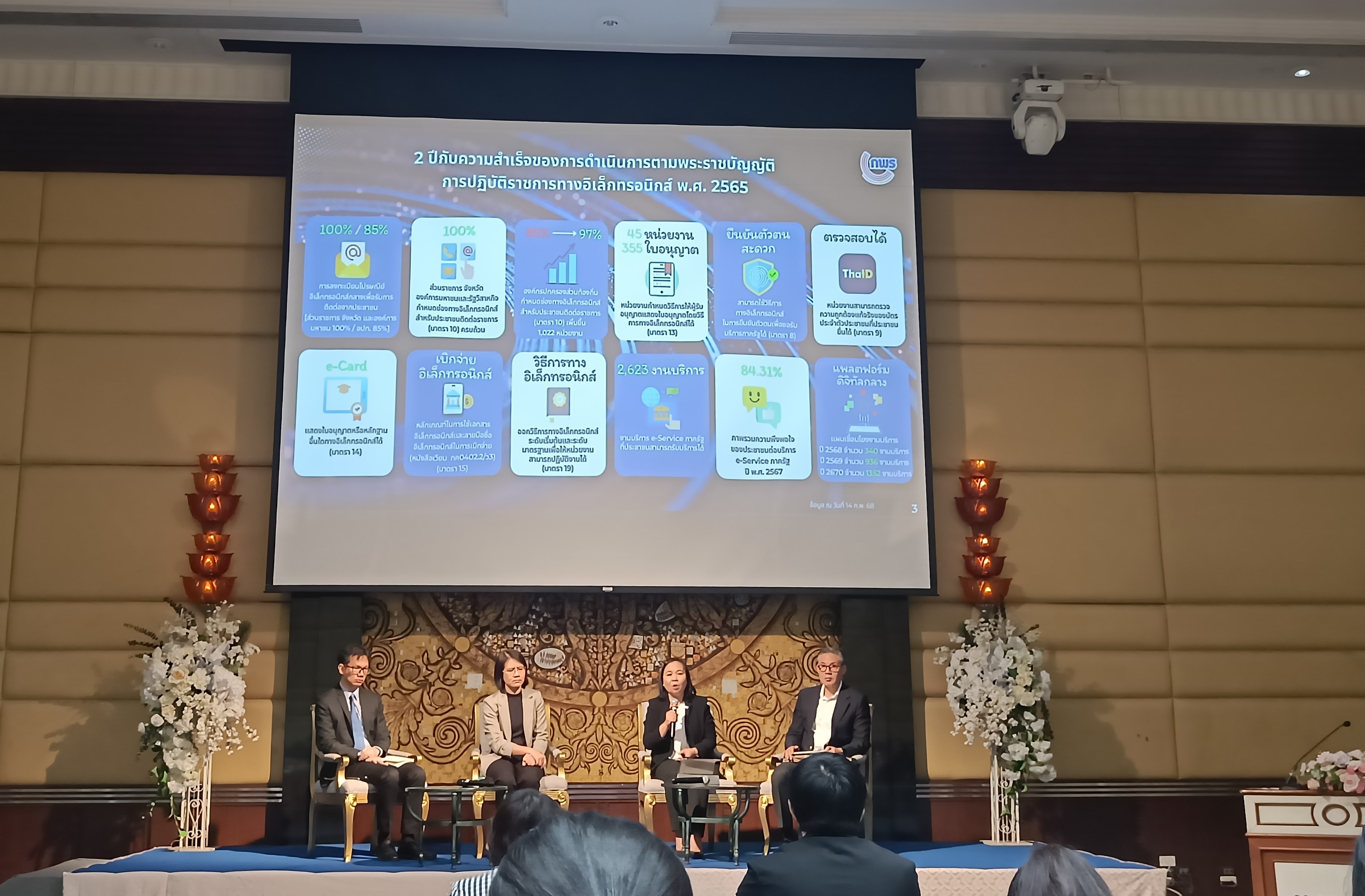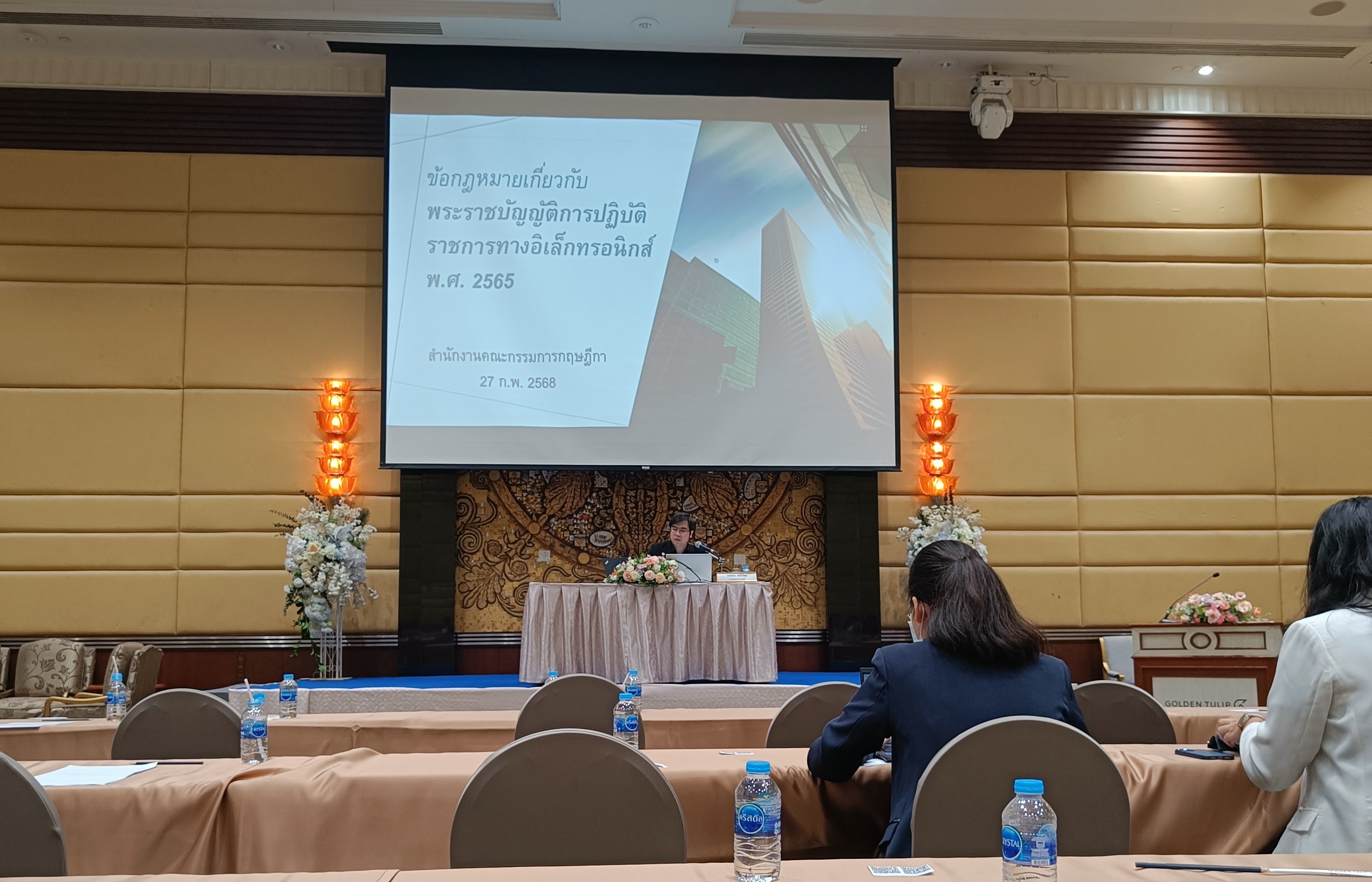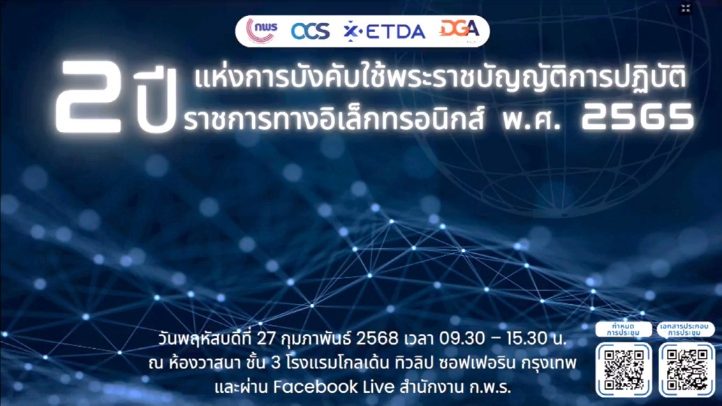 วันพฤหัสบดีที่ 27 กุมภาพันธ์ 2568 เวลา 09.30 น. สำนักงานคณะกรรมการพัฒนาระบบราชการ (สำนักงาน ก.พ.ร.) ได้จัดการประชุม และเชิญเข้าร่วมประชุม 2 ปี แห่งการบังคับใช้พระราชบัญญัติการปฏิบัติราชการทางอิเล็กทรอนิกส์ พ.ศ. 2565 โดยได้รับเกียรติจากทางท่าน รองเลขาธิการ ก.พ.ร. (นางอารีย์พันธ์ เจริญสุข) เป็นประธานกล่าวเปิดการประชุม และร่วมเวทีเปิดการเสวนา พร้อมกับทางท่าน ผู้อำนวยการกองพัฒนากฎหมาย สำนักคณะกรรมการกฤษฎีกา (นายจินตพันธุ์ กังสุบุตร) / ที่ปรึกษาสำนักงานพัฒนาธุรกรรมทางอิเล็ทรอนิกส์สำนักงานพัฒนาธุรกรรมทางอิเล็กทรอนิกส์ (นางสาวขนิษฐ์ ผาทอง) และผู้ช่วยผู้อำนวยการสำนักงานพัฒนารัฐบาลดิจิทัล สำนักงานพัฒนารัฐบาลดิจิทัล (องค์การมหาชน) (ดร.อาศิส อัญญะโพธิ์) ร่วมการเสวนาในเรื่อง ทิศทางและการขับเคลื่อน ความสำเร็จและก้าวต่อไปการปฏิบัติราชการทางอิเล็กทรอนิกส์สู่การเป็นรัฐบาลดิจิทัล จากที่ได้มีการประกาศ พระราชบัญญัติการปฏิบัติราชการทางอิเล็กทรอนิกส์ พ.ศ 2565 ซึ่งมีการประกาศในราชกิจจานุเบกษาเมื่อวันที่ 12 ตุลาคม 2565 และใช้บังคับทุกมาตราตั้งแต่วันที่ 10 มกราคม 2566 เป็นต้นมา ซึ่งขณะนี้กฎหมายมีผลบังคับใช้มาตลบ 2 ปีแล้ว โดยมีทางสำนักงาน ก.พ.ร. / สำนักงานคณะกรรมการกฤษฏีกา / สำนักงานพัฒนาธุรกรรมทางอิเล็กทรอนิกส์ และสำนักงานพัฒนารัฐบาลดิจิทัล (องค์การมหาชน) ร่วมขับเคลื่อนดำเนินการ โดยในการ 4 หน่วยงาน ที่ร่วมขับเคลื่อน ได้กำหนด จัดการประชุม และเชิญส่วนราชการ องค์การมหาชน และหน่วยงานอื่นๆ เข้าร่วมประชุม 2 ปี แห่งการบังคับใช้พระราชบัญญัติการปฏิบัติราชการทางอิเล็กทรอนิกส์ พ.ศ. 2565 เพื่อประชาสัมพันธ์และเผยแพร่ผลการดำเนินการของหน่วยงานของรัฐตามที่กฎหมายกำหนดภายหลังจากที่กฎหมายมีผลบังคับใช้ รวมทั้งให้ภาครัฐและภาคส่วนต่างๆ ที่เกี่ยวข้องทราบถึงทิศทางและแนวทางการขับเคลื่อนการปฏิบัติราชการทางอิเล็กทรอนิกส์ในระยะต่อไป นั้น