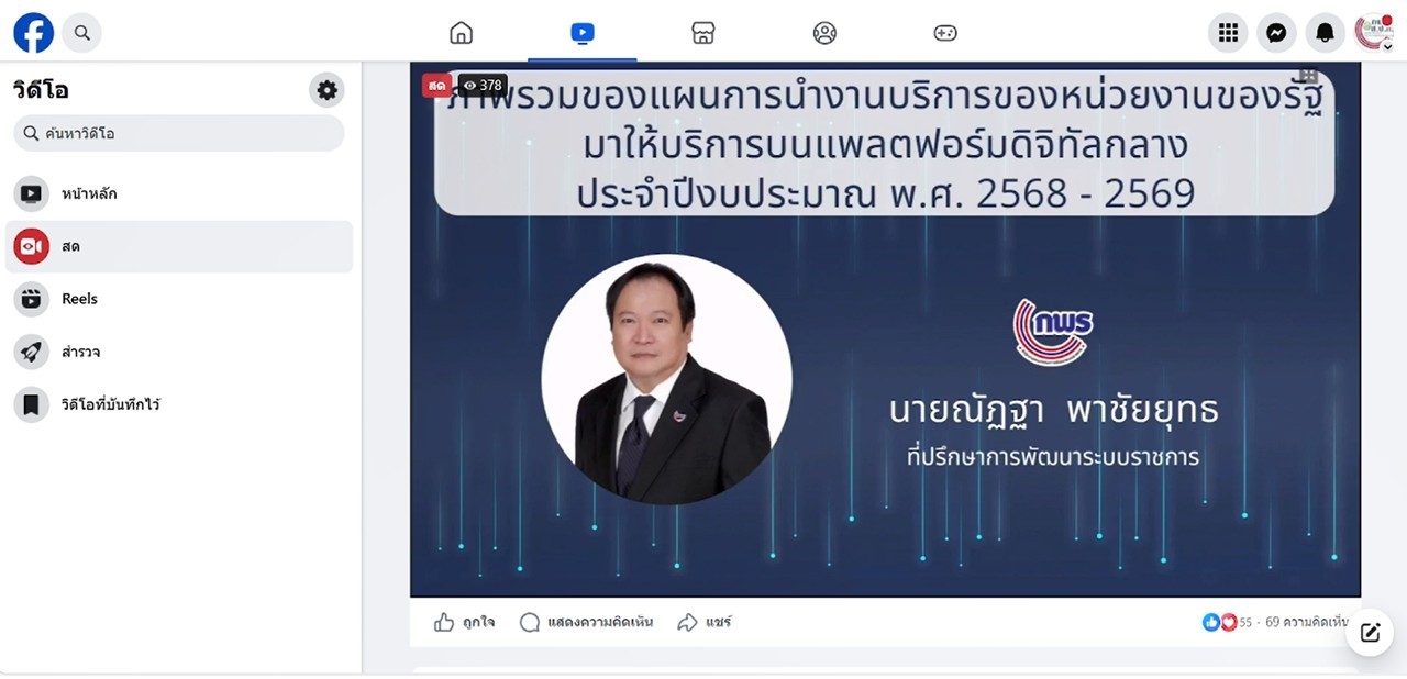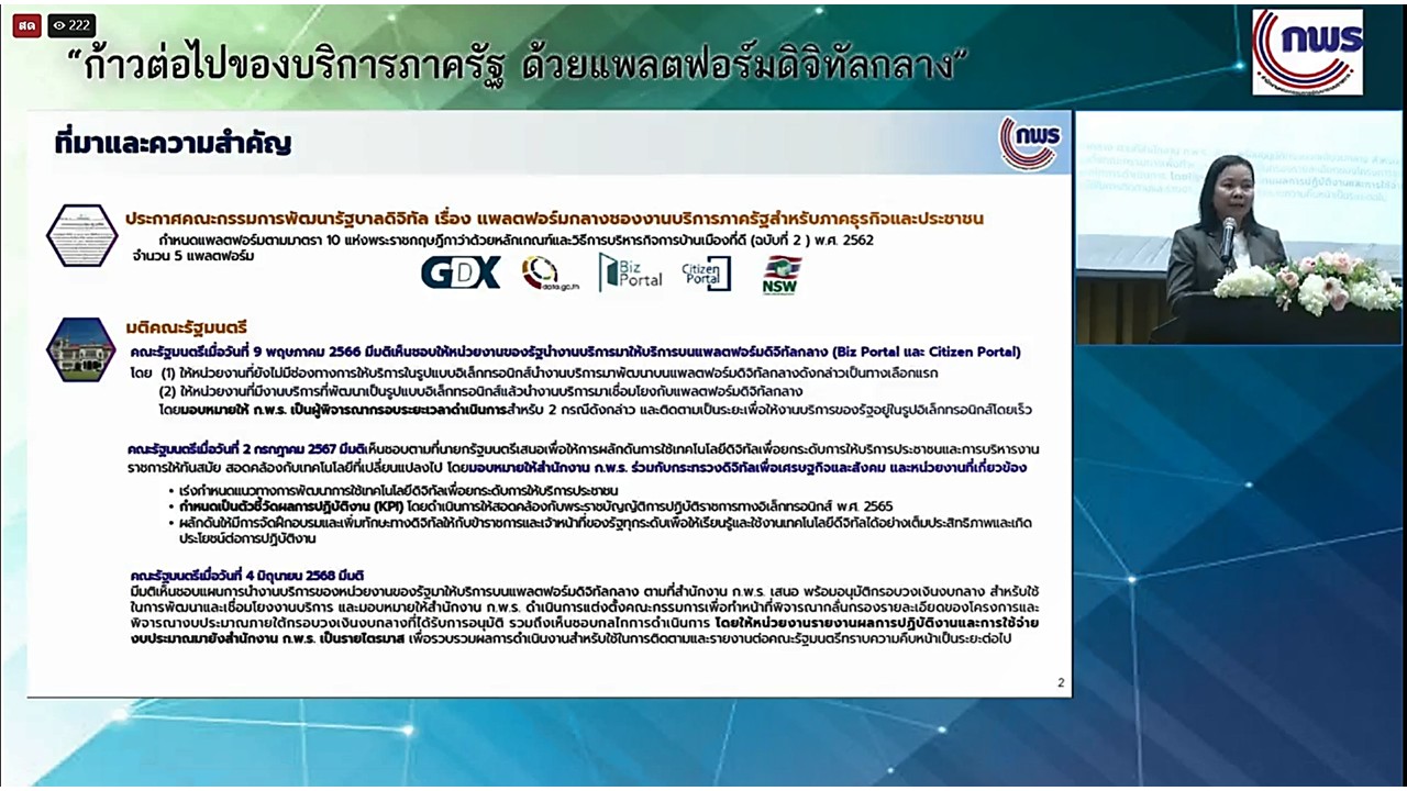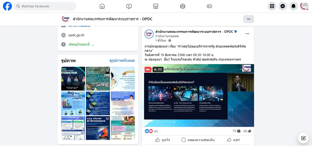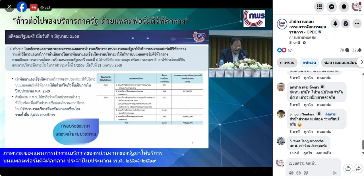 ด้วยสำนักงานคณะกรรมการพัฒนาระบบราชการ - OPDC (สำนักงาน ก.พ.ร.) เชิญส่วนราชการเข้าร่วมประชุมสัมมนาเรื่อง “ก้าวต่อไปของบริการภาครัฐ ด้วยแพลตฟอร์มดิจิทัลกลาง” โดยตามมติคณะรัฐมนตรีในคราวประชุมเมื่อวันที่ 4 มิถุนายน 2568 ที่มีมติเห็นชอบในหลักการกรอบระยะเวลา และวงเงินงบประมาณของแผนฯ รวมทั้งกลไกการดำเนินการ ตามที่สำนักงาน ก.พ.ร. เสนอ โดยให้หน่วยงานรายงานผลการปฏิบัติงานไปยังสำนักงาน ก.พ.ร. เป็นรายไตรมาส เพื่อรวบรวมผลการดำเนินงานสำหรับใช้ในการติดตามและรายงานต่อคณะรัฐมนตรีทราบความคืบหน้าเป็นระยะต่อไป มายังหน่วยงานเพื่อทราบและดำเนินการในส่วนที่เกี่ยวข้อง ทางสำนักงาน ก.พ.ร. จึงได้มีการกำหนดจัดประชุมสัมมนาเรื่อง “ก้าวต่อไปของบริการภาครัฐ ด้วยแพลตฟอร์มดิจิทัลกลาง” ในวันอังคารที่ 19 สิงหาคม 2568 เวลา 09.30 – 16.00 น. ผ่านสื่ออิเล็กทรอนิกส์ (Facebook Live : สำนักงานคณะกรรมการพัฒนาระบบราชการ – OPDC) เพื่อสร้างการรับรู้และความเข้าใจในการขับเคลื่อนแผนการนำงานบริการของหน่วยงานของรัฐมาให้บริการบนแพลตฟอร์มดิจิทัลกลาง ตลอดจนชี้แจงแนวทางในการพัฒนางานบริการของหน่วยงานมาให้บริการบนแพลตฟอร์มดิจิทัลกลางในปีงบประมาณ พ.ศ. 2569 โดยการประชุมสัมมนาดังกล่าวฯ ได้รับเกียรติจากทางท่าน รองเลขาธิการสำนักงาน ก.พ.ร. (นางอารีย์พันธ์ เจริญสุข) กล่าวเปิดการประชุม และกล่าวความเป็นมาพร้อมวัตถุประสงค์ของการจัดทำแผนการนำงานบริการของหน่วยงานของรัฐมาให้บริการบนแพลตฟอร์มดิจิทัลกลาง พร้อมนี้มีการมากล่าวในเรื่องภาพรวมของแผนการนำงานบริการของหน่วยงานของรัฐมาให้บริการบนแพลตฟอร์มดิจิทัลกลาง ประจำปีงบประมาณ พ.ศ. 2568 – 2569 โดยที่ปรึกษาการพัฒนาระบบราชการ (นายณัฏฐา พาชัยยุทธ) รวมทั้งมีการเสวนาหัวข้อ : ทิศทางในการพัฒนาและการเชื่อมโยงงานบริการของหน่วยงานของรัฐมาให้บริการบนแพลตฟอร์มดิจิทัลกลางและทิศทางของการให้บริการแพลตฟอร์มดิจิทัลกลางในอนาคต โดยผู้แทนสำนักงาน ก.พ.ร. ผู้แทนสำนักงานคณะกรรมการดิจิทัลเพื่อเศรษฐกิจและสังคมแห่งชาติ ผู้แทนสำนักงานพัฒนารัฐบาลดิจิทัล (องค์การมหาชน) และผู้แทนสำนักงานพัฒนาธุรกรรมทางอิเล็กทรอนิกส์ ทั้งนี้มีการมาให้ความรู้ในการพัฒนา e-Service ภาครัฐเพื่อตอบโจทย์การให้บริการประชาชนโดยสะดวกถ้วนหน้า โดยผู้แทนสำนักงานพัฒนาวิทยาศาสตร์และเทคโนโลยีแห่งชาติ และผู้แทนศูนย์เทคโนโลยีอิเล็กทรอนิกส์และคอมพิวเตอร์แห่งชาติ (NECTEC) พร้อมมีการกล่าวถึงแนวทางและวิธีการเชิงเทคนิคในการพัฒนางานบริการชองหน่วยงานมาให้บริการบนแพลตฟอร์มดิจิทัลกลาง ใน