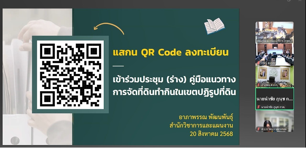 ในการนี้ทางท่าน ผู้เชี่ยวชาญด้านการปฏิรูปที่ดิน (นางสาวอาภาพรรณ พัฒนพันธุ์) ผู้จัดทำร่างคู่มือ และทาง ผู้อำนวยการกลุ่มพัฒนาระบบบริหาร ส.ป.ก. (นางสาวกานดา ศากยะโรจน์) ผู้ช่วยคณะกรรมการและเลขานุการ ได้กำหนด และเชิญทางคณะทำงาน กำกับ ตืดตาม ร่วมบูรณาการงานจัดที่ดินของ ส.ป.ก. พร้อมด้วยทางเจ้าหน้าที่ที่เกี่ยวข้องทั้งทาง ส.ป.ก. ส่วนกลาง และทาง ส.ป.ก. ภูมิภาค (72 จังหวัด) เพื่อเข้าร่วมประชุมรับฟังการชี้แจงรายละเอียด (ร่าง) คู่มือแนวทางการจัดที่ดินทำกินในเขตปฏิรูปที่ดิน ผ่านสื่ออิเล็กทรอนิกส์ (ระบบ Zoom Meeting) ในวันพุธที่ 20 สิงหาคม 2568 เวลา 09.30 – 12.00 น. เพื่อได้ให้ข้อคิดเห็น และข้อเสนอแนะ ในการจัดทำร่างคู่มือดังกล่าวฯ ให้มีความครบถ้วนสมบูรณ์ในส่วนรายละเอียด ข้อมูล ขั้นตอน และเนื้อหา โดยการประชุมในครั้งนี้เป็นการประชุมผ่านสื่ออิเล็กทรอนิกส์ เพื่อเป็นการลดระยะเวลาของการเดินทาง และค่าใช้จ่าย รวมทั้งสามารถเข้าถึงได้รวดเร็ว ทุกที่ ร่วมทั้งเป็นการลดความเสี่ยง และป้องกันกรณีการแพร่ระบาดของโรคติดเชื้อไวรัสโคโรนา 2019 (COVID – 19) พร้อมลดความแออัดของการมารวมตัวเข้าร่วมประชุมกันในห้องประชุมเป็นจำนวนมาก และลดความเสี่ยงของการเดินทางมาเข้าร่วมประชุม เพื่อให้เป็นไปตามมาตรการเฝ้าระวังของการแพร่ระบาดของโรคติดเชื้อไวรัสโคโรนา 2019 (COVID – 19) พร้อมเฝ้าระวังภัยพิบัติต่างๆ ที่อาจจะเกิดขึ้นได้ เช่น แผ่นดินไหว น้ำท่วม เป็นต้น ในส่วนของทางผู้เชี่ยวชาญฯ ผู้อำนวยการกลุ่มพัฒนาระบบบริหาร ผู้อำนวยการกลุ่มวิจัยและพัฒนาการปฏิรูปที่ดิน สวผ. และทางเจ้าหน้าที่ กพร. ส.ป.ก. เข้าร่วมการประชุมชี้แจง ณ ห้องควบคุมการประชุมออนไลน์ ห้องประชุมสุทธิพร จีระพันธุ ชั้น 1 ส.ป.ก. ถนนราชดำเนินนอก กรุงเทพฯ