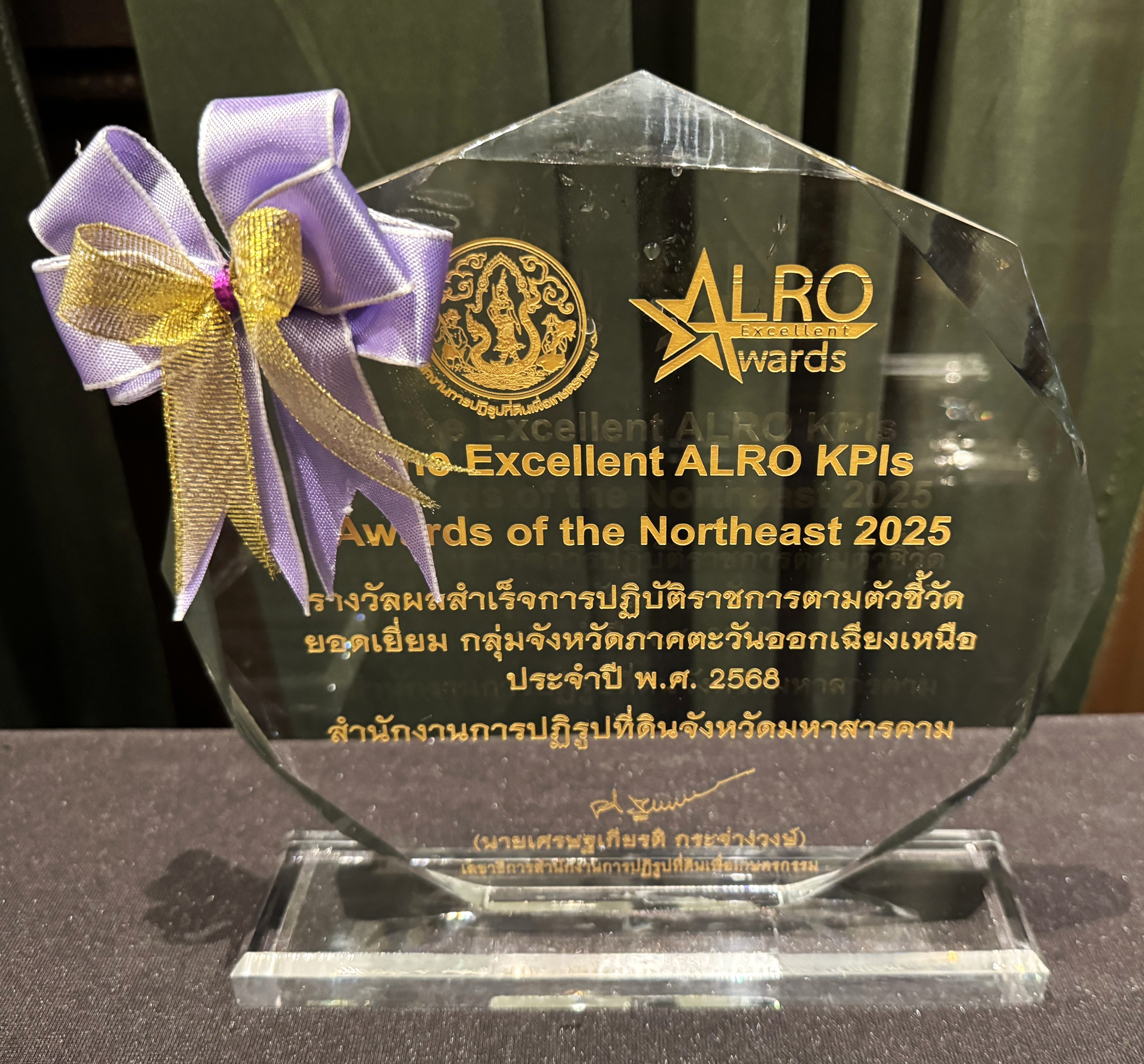 10 รางวัลผลสำเร็จการปฏิบัติราชการตามตัวชี้วัดรองอันดับหนึ่ง กลุ่มจังหวัดภาคตะวันออกเฉียงเหนือ ประจำปี พ.ศ. 2568 (The 1st Runner-up of ALRO KPIs Awards of the Northeast 2025) ได้แก่ สำนักงานการปฏิรูปที่ดินจังหวัดหนองคาย
