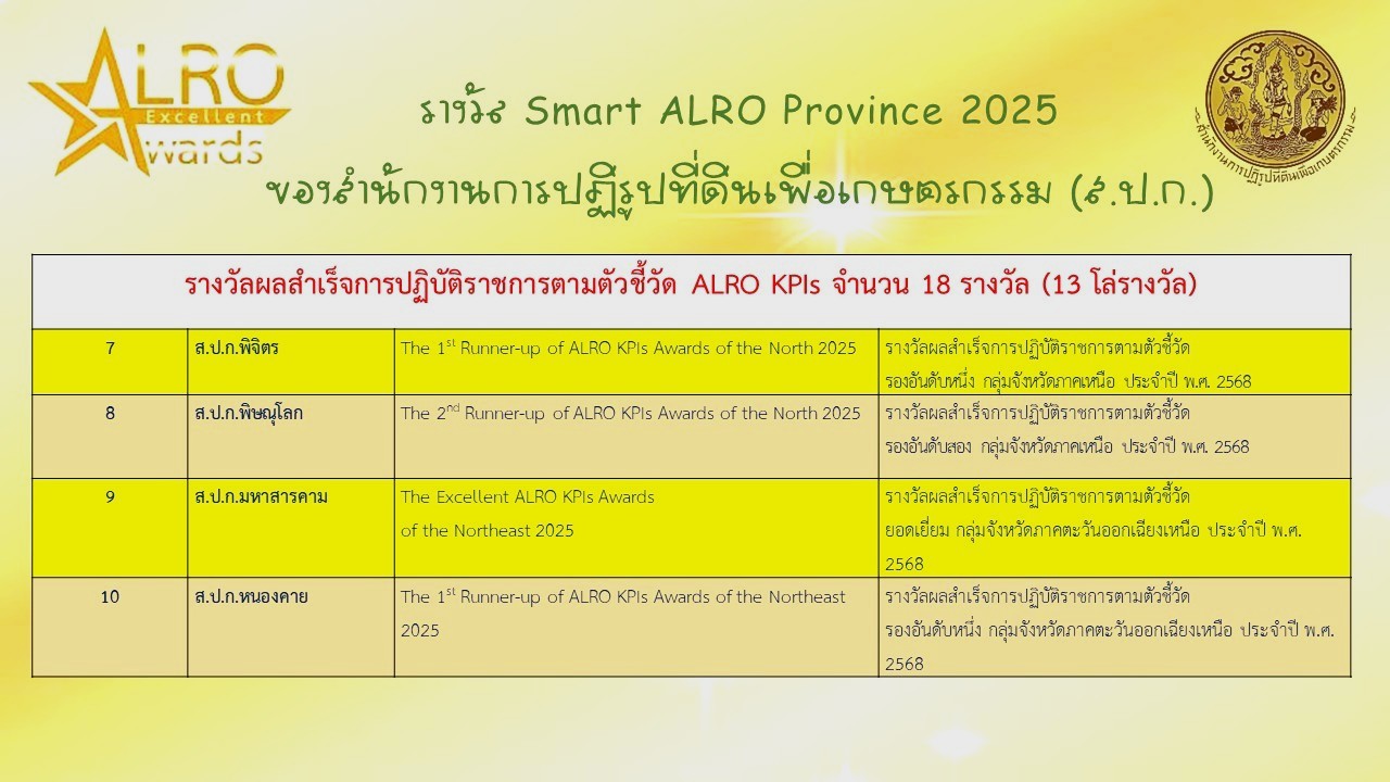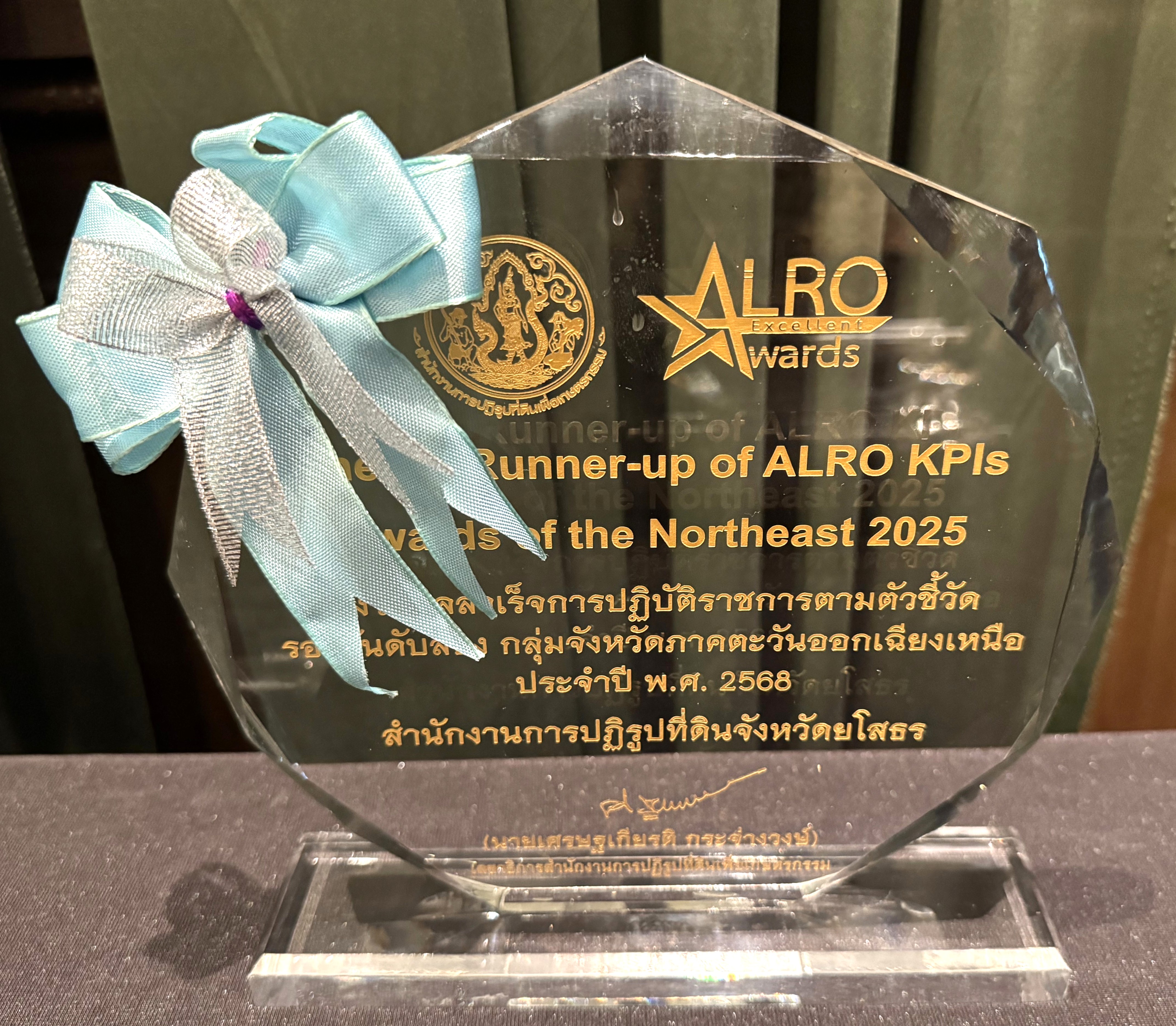 11 รางวัลผลสำเร็จการปฏิบัติราชการตามตัวชี้วัดรองอันดับสอง กลุ่มจังหวัดภาคตะวันออกเฉียงเหนือ ประจำปี พ.ศ. 2568 (The 2nd Runner-up of ALRO KPIs Awards of the Northeast 2025) ได้แก่ สำนักงานการปฏิรูปที่ดินจังหวัดยโสธร