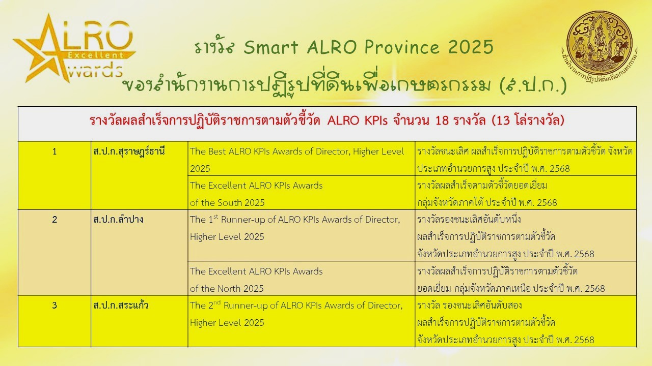 4 รางวัลชนะเลิศ ผลสำเร็จการปฏิบัติราชการตามตัวชี้วัด จังหวัดประเภทอำนวยการต้น ประจำปี พ.ศ. 2568 (The Best ALRO KPIs Awards of Director, Primary Level 2025) และรางวัลผลสำเร็จการปฏิบัติราชการตามตัวชี้วัดยอดเยี่ยม กลุ่มจังหวัดภาคกลาง ประจำปี พ.ศ. 2568 (The Excellent ALRO KPIs Awards of the Central Region 2025) ได้แก่ สำนักงานการปฏิรูปที่ดินจังหวัดสระแก้ว