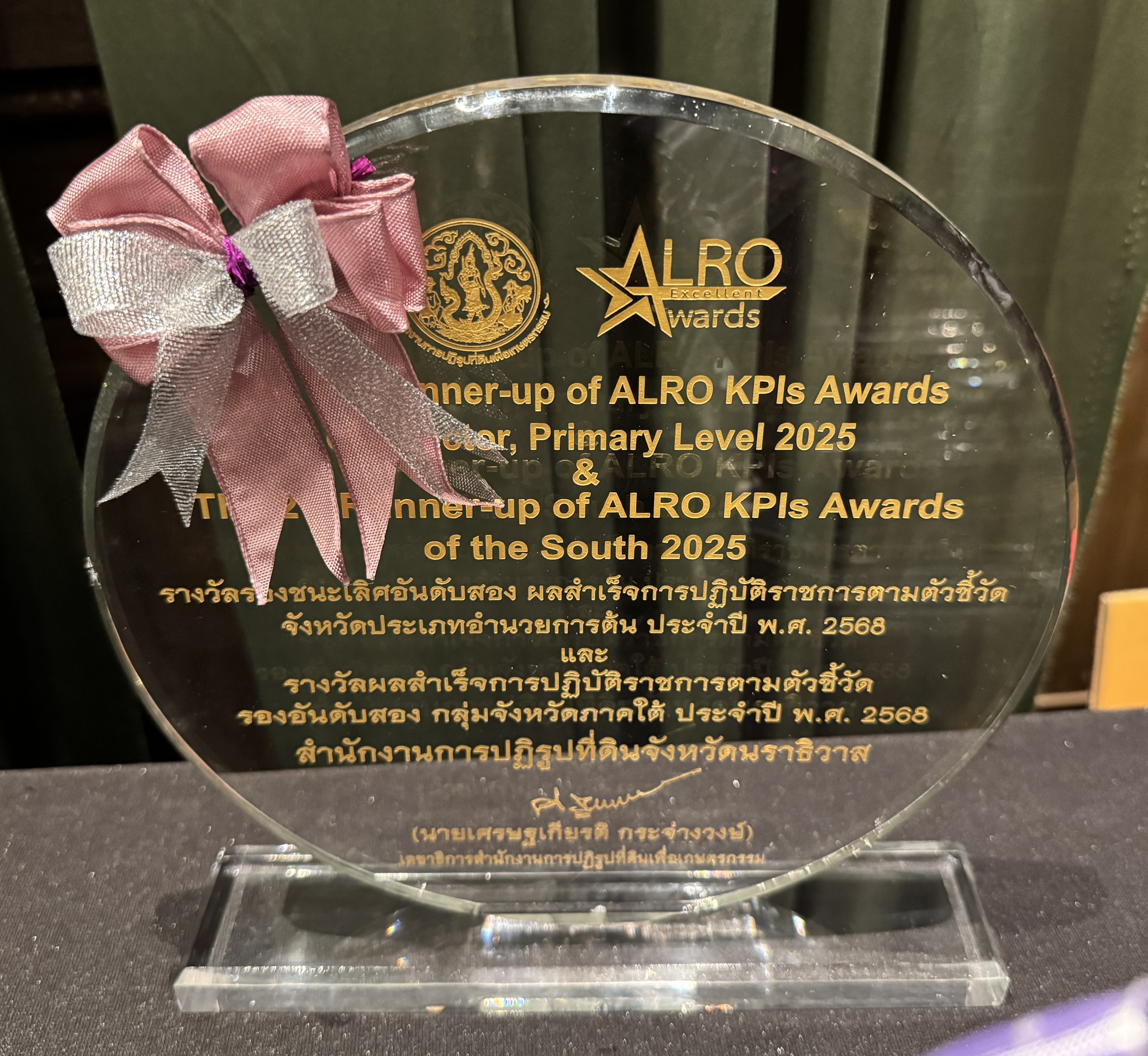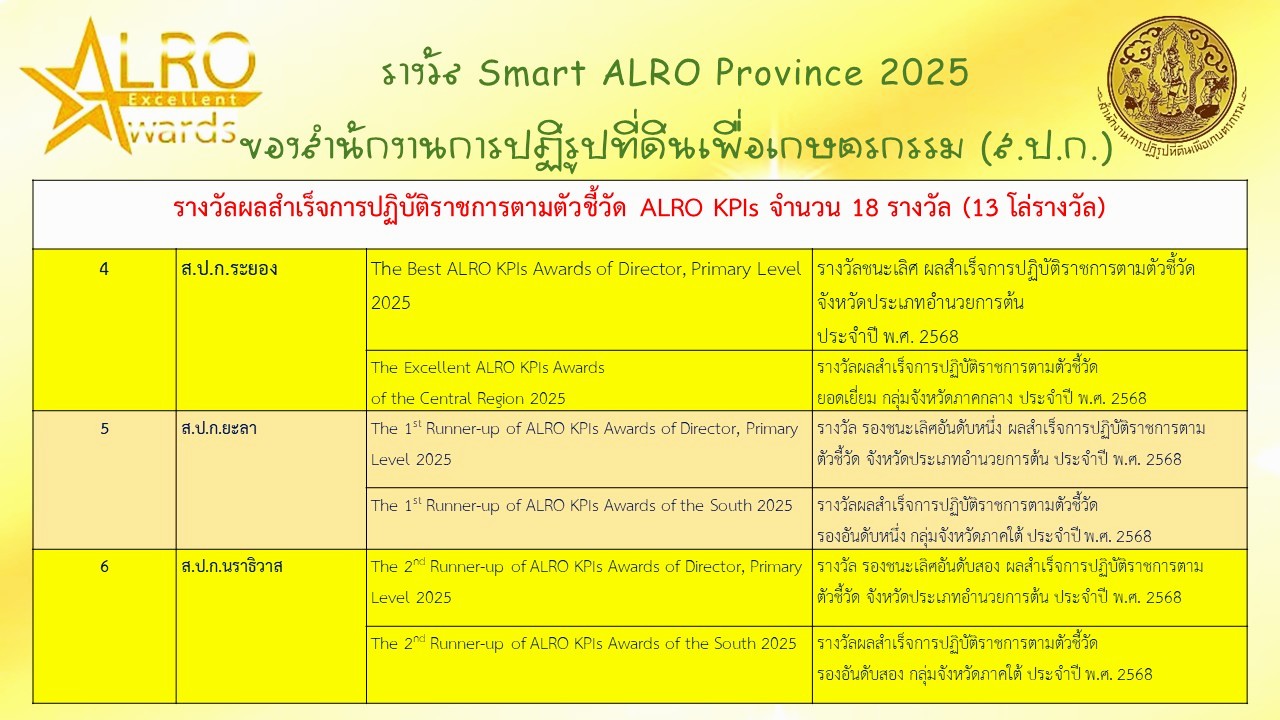 5 รางวัลรองชนะเลิศอันดับหนึ่ง ผลสำเร็จการปฏิบัติราชการตามตัวชี้วัด จังหวัดประเภทอำนวยการต้น ประจำปี พ.ศ. 2568 (The 1st Runner-up of ALRO KPIs Awards of Director, Primary Level 2025) และรางวัลผลสำเร็จการปฏิบัติราชการตามตัวชี้วัดรองอันดับหนึ่ง กลุ่มจังหวัดภาคใต้ ประจำปี พ.ศ. 2568 (The 1st Runner-up of ALRO KPIs Awards of the South 2025) ได้แก่ สำนักงานการปฏิรูปที่ดินจังหวัดยะลา