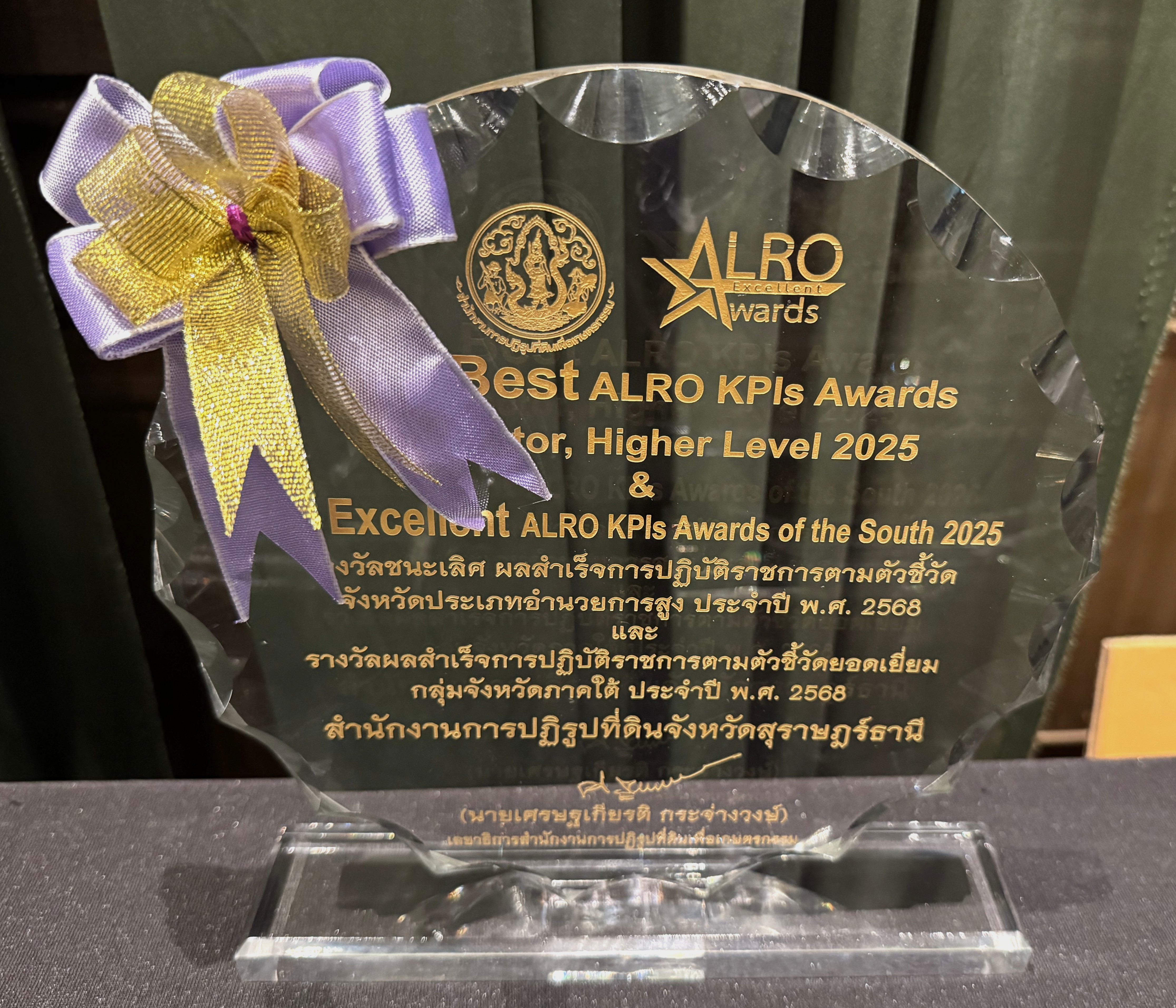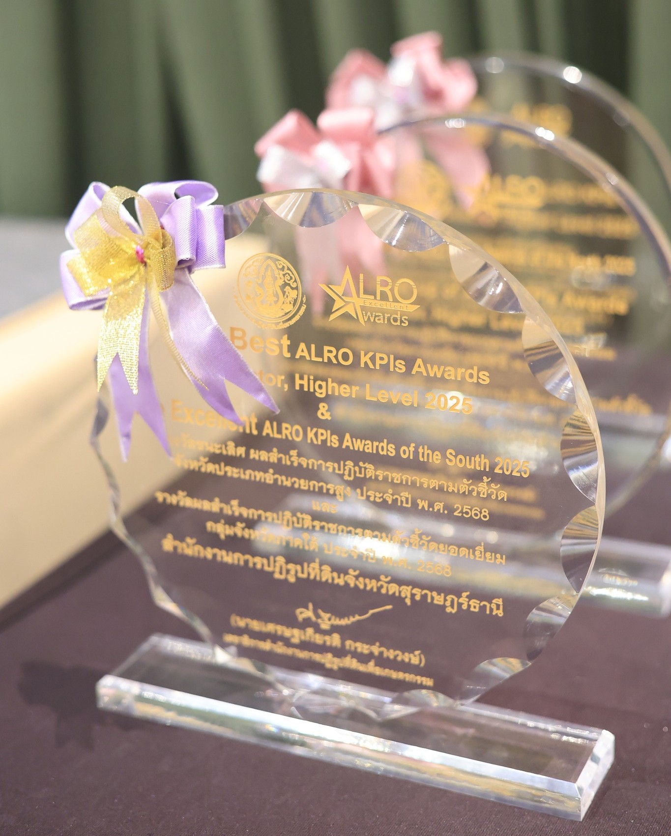 1 รางวัลชนะเลิศ ผลสำเร็จการปฏิบัติราชการตามตัวชี้วัด จังหวัดประเภทอำนวยการสูง ประจำปี พ.ศ. 2568 (The Best ALRO KPIs Awards of Director, Higher Level 2025) และรางวัลผลสำเร็จตามตัวชี้วัดยอดเยี่ยม กลุ่มจังหวัดภาคใต้ ประจำปี พ.ศ. 2568 (The Excellent ALRO KPIs Awards of the South 2025) ได้แก่ สำนักงานการปฏิรูปที่ดินจังหวัดสุราษฎร์ธานี