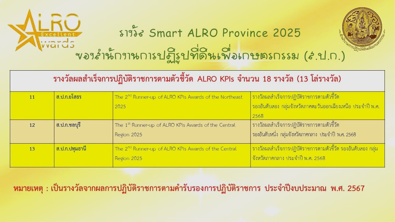 12 รางวัลผลสำเร็จการปฏิบัติราชการตามตัวชี้วัดรองอันดับหนึ่ง กลุ่มจังหวัดภาคกลาง ประจำปี พ.ศ. 2568 (The 1st Runner-up of ALRO KPIs Awards of the Central Region 2025) ได้แก่ สำนักงานการปฏิรูปที่ดินจังหวัดชลบุรี