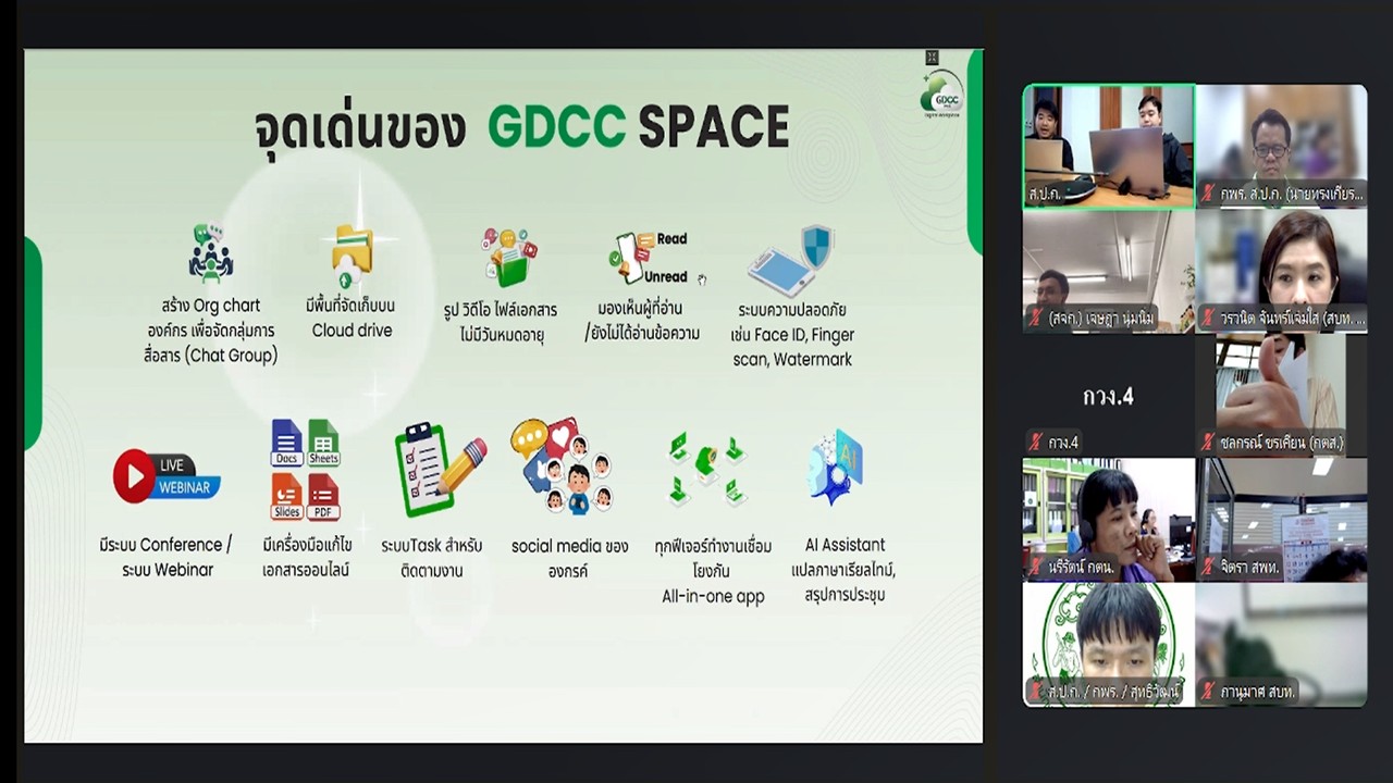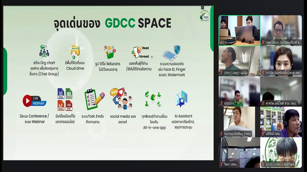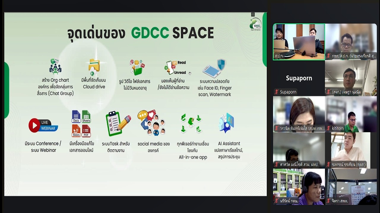 ตามที่ สำนักงานการปฏิรูปที่ดินเพื่อเกษตรกรรม (ส.ป.ก.) ได้มีการขับเคลื่อนการพัฒนาและยกระดับการทำงานร่วมกันของเจ้าหน้าที่ภายในองค์กร เพื่อให้การดำเนินงานบริการของหน่วยงานให้สามารถให้บริการได้ในรูปแบบ e-Service จึงได้จัดอบรมเชิงปฏิบัติการเกี่ยวกับการใช้งานซอฟต์แวร์ GDCC Space Plus จากทีมวิทยากร GDCC Space Team โดยซอฟต์แวร์ดังกล่าวฯ เป็นซอฟต์แวร์สำหรับการทำงานร่วมกันภายในองค์กรผ่านเครื่องมือต่างๆ (Work Collaboration) ภายใต้โครงการพัฒนาระบบคลาวด์กลางภาครัฐ (Government Data Center and Cloud service : GDCC) โดยมีฟีเจอร์หลัก เช่น การแชท, การจัดเก็บข้อมูลบนคลาวด์ (Drive), และการประชุมทางวิดีโอ เพื่อให้การทำงานร่วมกันของทีมมีประสิทธิภาพมากขึ้น จึงจัดให้มีการอบรมในครั้งนี้ขึ้นเพื่อให้มีความเข้าใจในการใช้งานซอฟต์แวร์ สำหรับผู้ใช้งานภายในหน่วยงานของ ส.ป.ก. โดยได้รับเกียรติจากทางท่าน รองเลขาธิการ ส.ป.ก. (นายวัฒนา มังธิสาร) มากล่าวเปิดการฝึกอบรมเชิงปฏิบัติการในครั้ง และได้มอบหมายให้ทาง ผู้อำนวยการกลุ่มระบบคอมพิวเตอร์และเครือข่าย (ว่าที่ พ.ต.จักรกฤช ชุติมาโชติ) ศูนย์เทคโนโลยีสารสนเทศและการสื่อสาร ส.ป.ก. ดำเนินการในส่วนของการจัดอบรมเชิงปฏิบัติการเกี่ยวกับการใช้งานซอฟต์แวร์ GDCC Space Plus ต่อไป โดยการอบรมในครั้งนี้จัดขึ้น ในวันพุธที่ 22 ตุลาคม 2568 เวลา 14.00 – 16.30 น. เป็นในรูปแบบผ่านการอบรมสื่ออิเล็กทรอนิกส์ (ระบบออนไลน์ Zoom Meeting) ซึ่งในการจัดอบรมในครั้งนี้เพื่อเป็นการสร้างการรับรู้ การใช้งาน และให้ผู้ใช้งานภายในองค์กร เจ้าหน้าที่ ส.ป.ก. ทั้งส่วนกลาง และภูมิภาค ได้มีความรู้ ความเข้าใจ สามารถใช้งานได้อย่างถูกต้อง เพื่อให้สอดคล้องกับการดำเนินงานรัฐบาลอิเล็กทรอนิกส์ให้บรรลุเป็นหมายของกรมฯ ด้วย