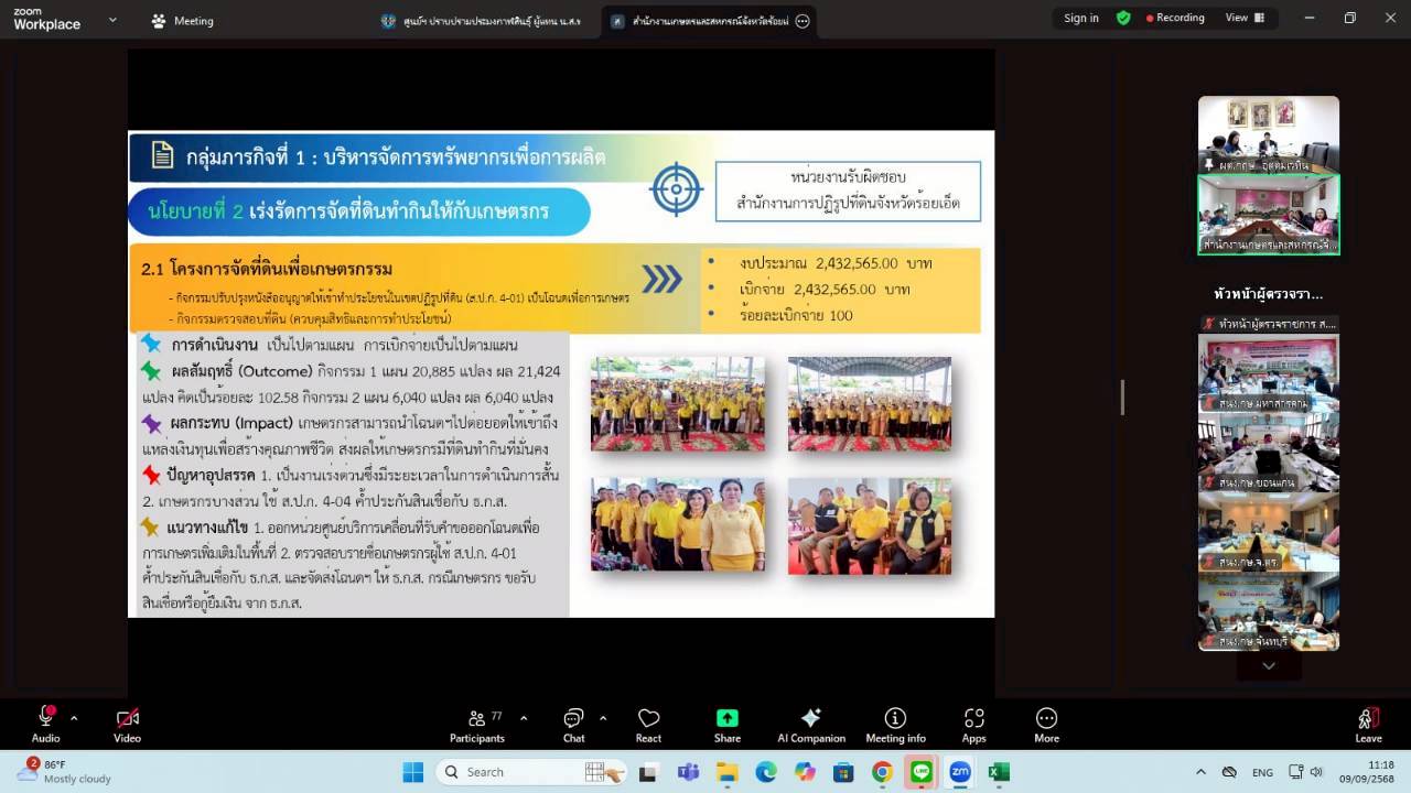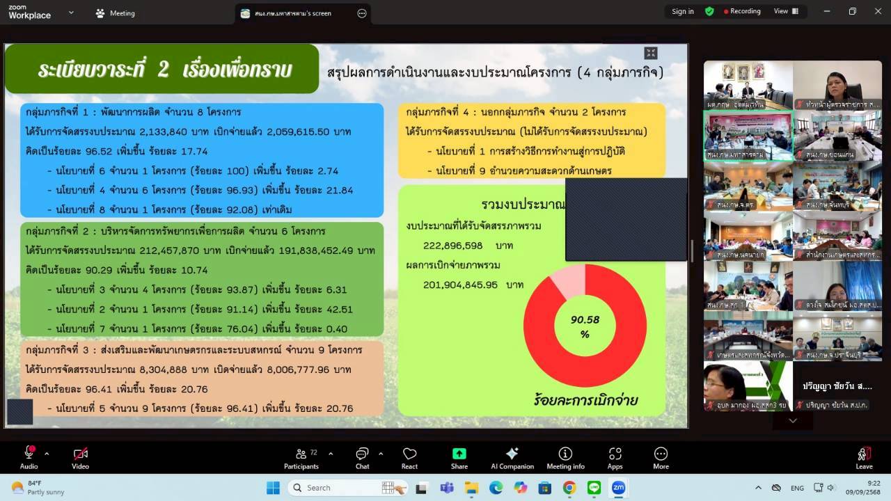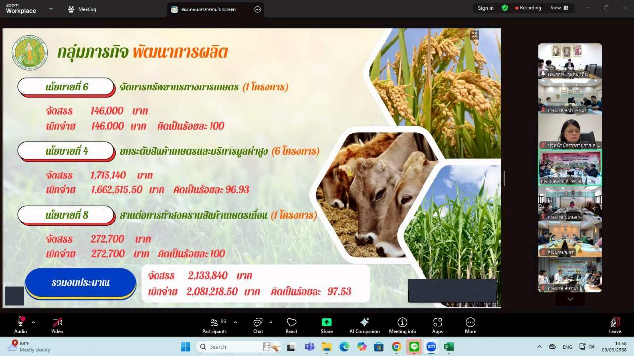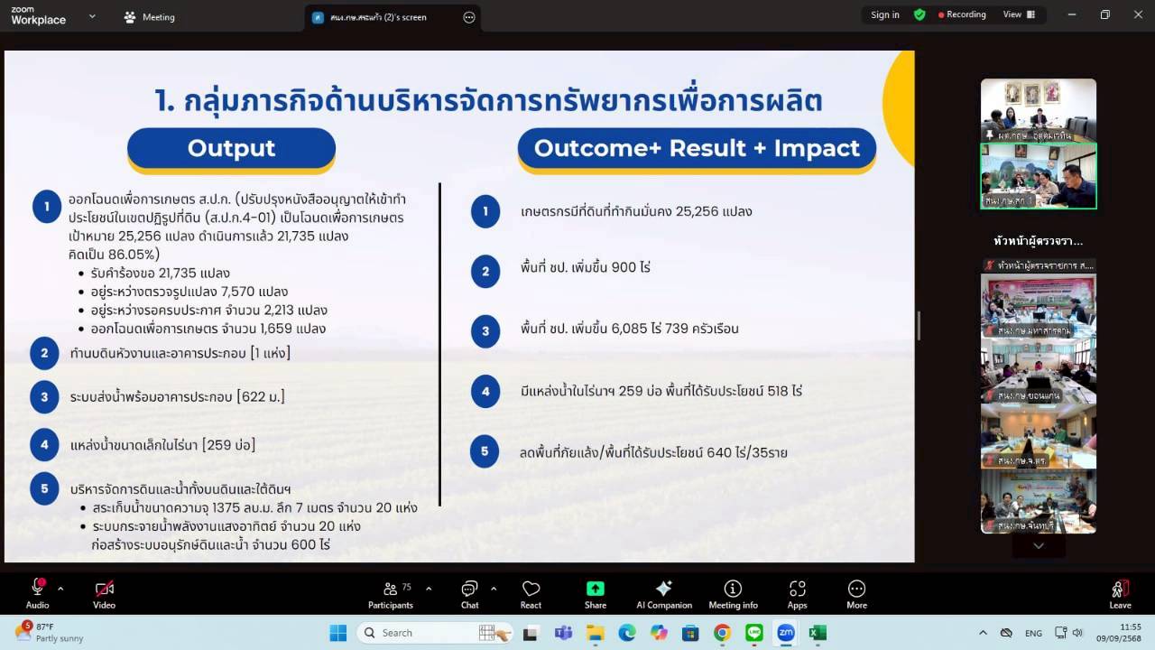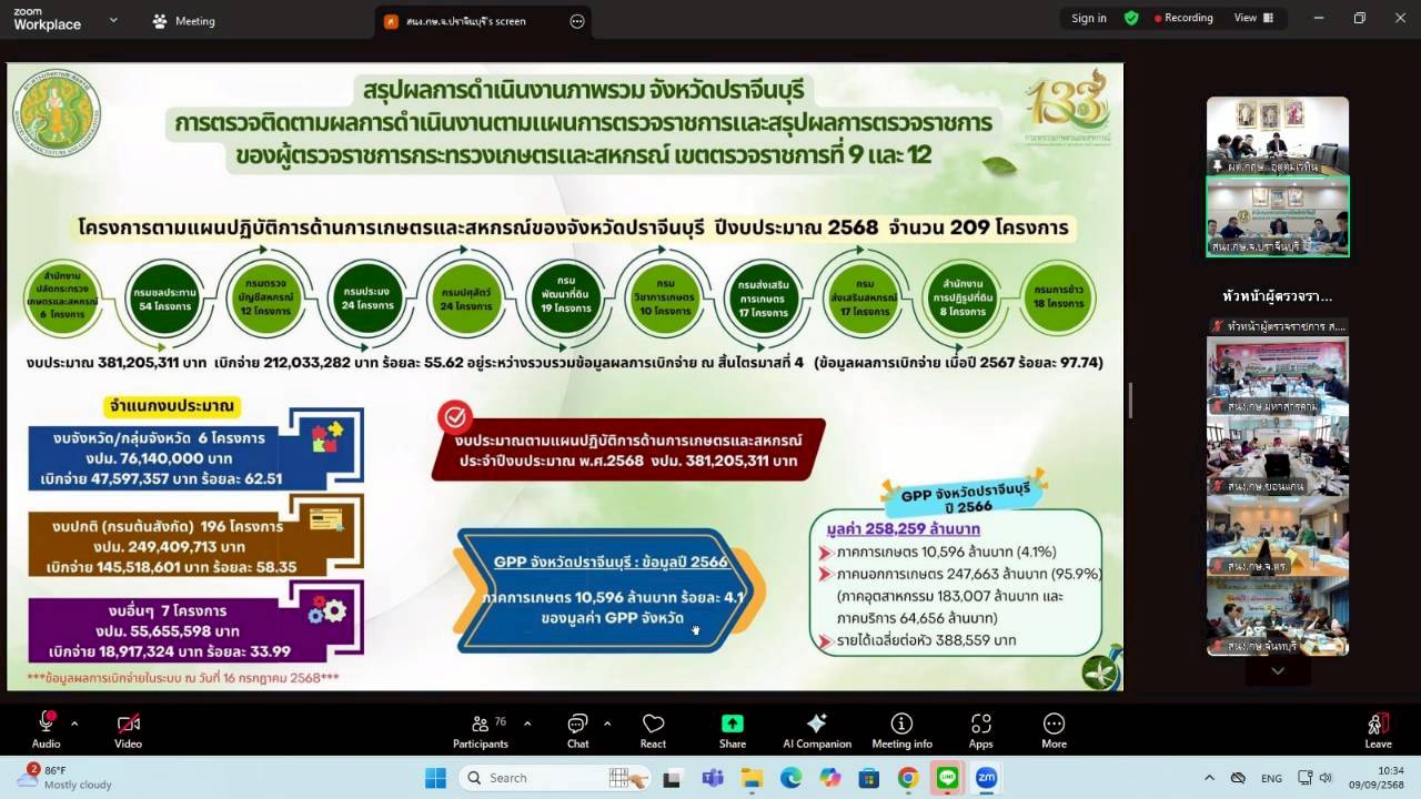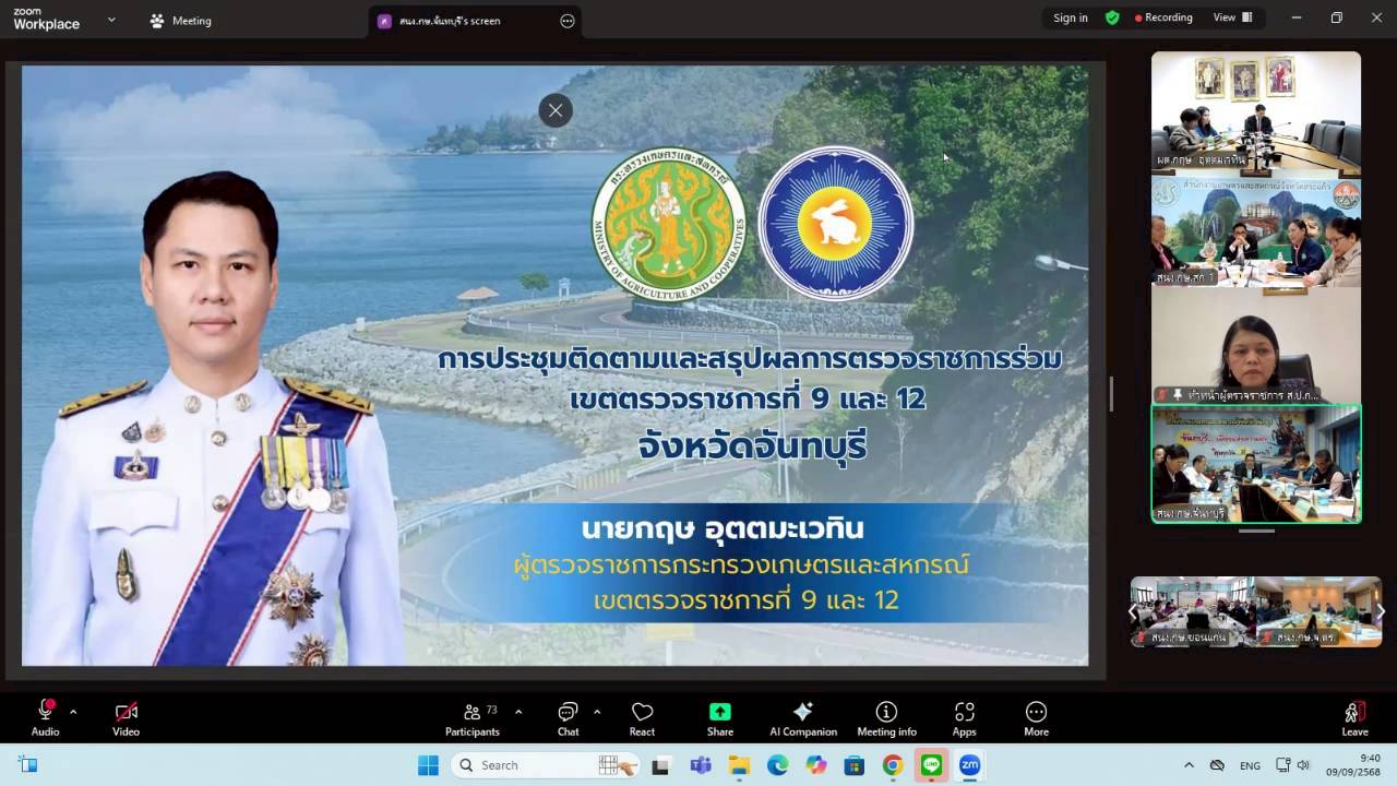 วันอังคารที่ 9 กันยายน 2568 เวลา 09.00 น. นางสาวฐิภาพรรณ พึ่งไพฑูรย์ หัวหน้าผู้ตรวจราชการ ส.ป.ก. ในฐานะผู้ช่วยผู้ตรวจราชการกระทรวงเกษตรและสหกรณ์ เข้าร่วมการประชุมติดตามและสรุปผลการตรวจราชการของผู้ตรวจราชการกระทรวงเกษตรและสหกรณ์ เขตตรวจราชการที่ 9 และ 12 โดยมี นายกฤษ อุตตมะเวทิน ผู้ตรวจราชการกระทรวงเกษตรและสหกรณ์ เป็นประธาน รวมถึงมีผู้ช่วยผู้ตรวจราชการกระทรวงเกษตรและสหกรณ์ (ระดับกรม) หัวหน้าส่วนราชการในสังกัดกระทรวงเกษตรและสหกรณ์ระดับจังหวัด และเจ้าหน้าที่ผู้เกี่ยวข้อง เข้าร่วมประชุมฯ ผ่านการประชุมออนไลน์ ระบบ Zoom Meeting