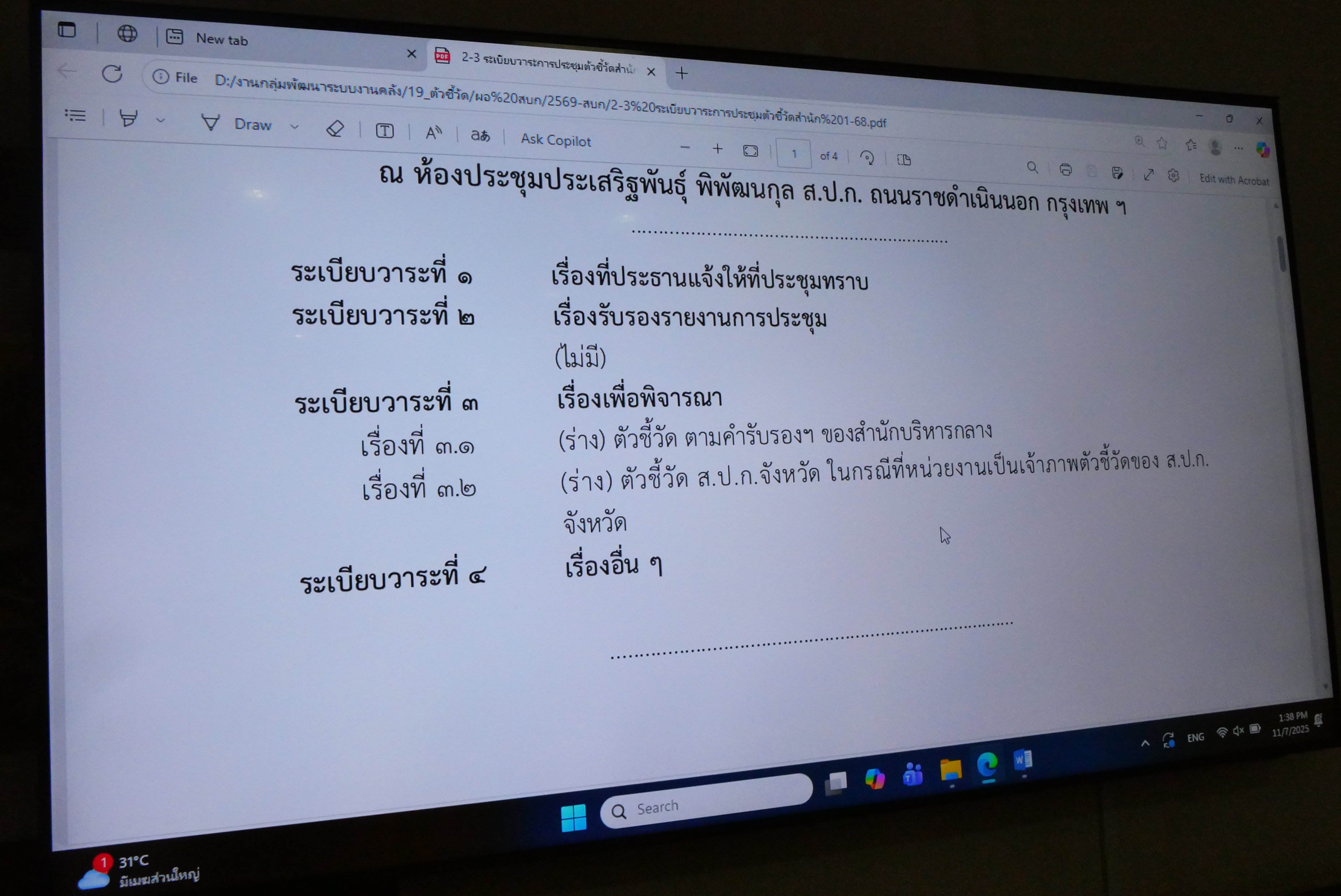 วันศุกร์ที่ 7 พฤศจิกายน 2568 เวลา 13.30 น. นางสาวอมรรัตน์ แขวงโสภา ผู้อำนวยการสำนักบริหารกลาง เป็นประธานการประชุมการจัดทำ (ร่าง) กรอบการประเมินผลการปฏิบัติราชการ (ตัวชี้วัด) ตามคำรับรองการปฏิบัติราชการของสำนักบริหารกลาง และ ส.ป.ก. จังหวัด ครั้งที่ 1/2568 พร้อมด้วย ผู้อำนวยการกลุ่ม และเจ้าหน้าที่ที่เกี่ยวข้อง เข้าร่วมประชุม ณ ห้องประชุมประเสริฐพันธุ ส.ป.ก. ถนนราชดำเนินนอก กรุงเทพมหานคร