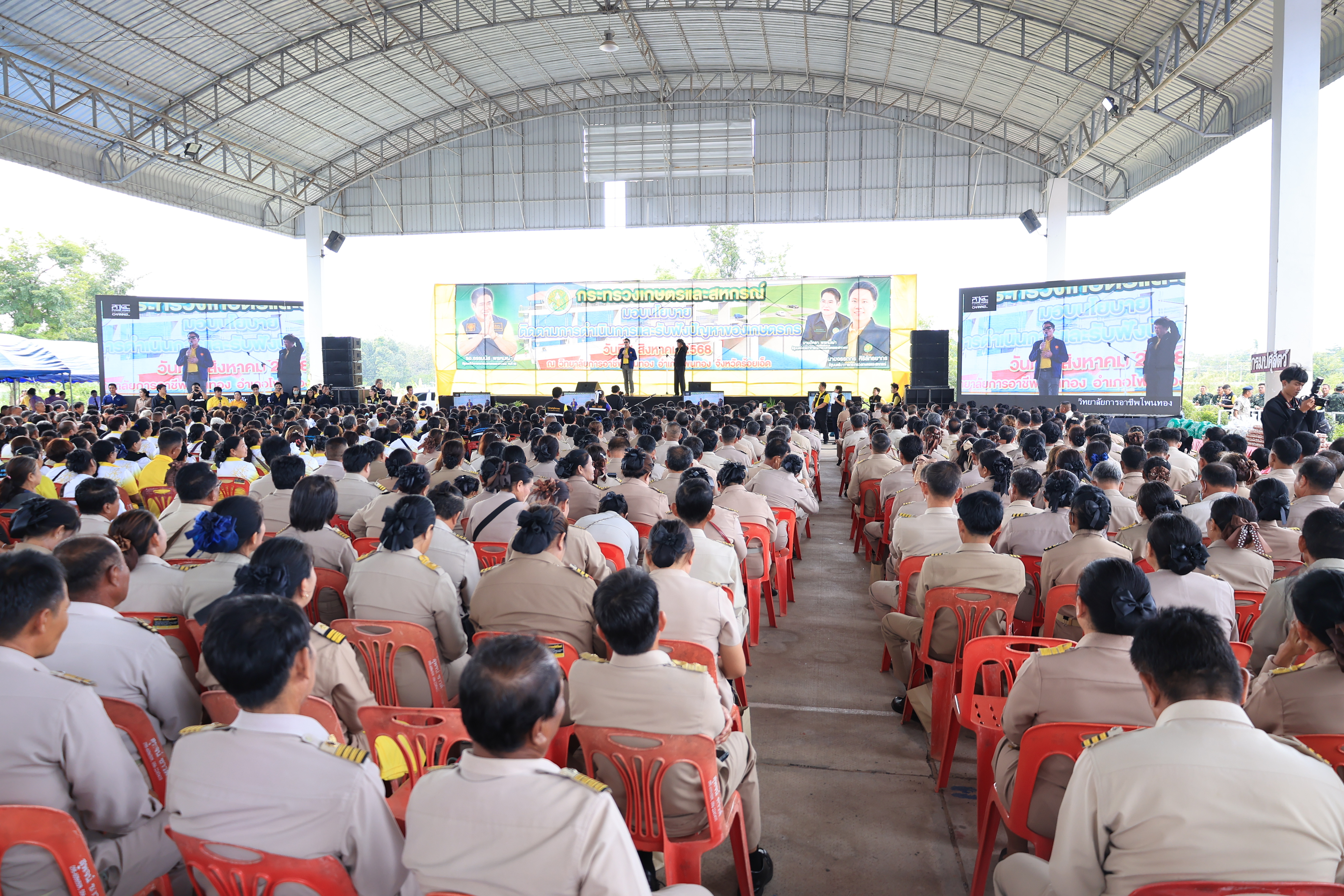 วันที่ 1 สิงหาคม 2568 เวลา 9.00 น. นายเศรษฐเกียรติ กระจ่างวงษ์ เลขาธิการสำนักงานการปฏิรูปที่ดินเพื่อเกษตรกรรม(ส.ป.ก.) พร้อมด้วย นายวัฒนา มังธิสาร รองเลขาธิการ ส.ป.ก. ,นายกฤตวิทย์ พิมพ์ทองงาม ปฏิรูปที่ดินจังหวัดร้อยเอ็ด ,นายพิษณุ สำรี ปฏิรูปที่ดินจังหวัดนครพนม ร่วมลงพื้นที่กับคณะรัฐมนตรีว่าการกระทรวงเกษตรและสหกรณ์ (นายอรรถกร ศิริลัทธยากร) จุดที่ 1 วิทยาลัยการอาชีพโพนทอง อำเภอโพนทอง ในวาระลงพื้นที่ตรวจราชการในจังหวัดร้อยเอ็ด มีนายชัชวาลย์ เบญจสิริวงศ์ ผู้วาราชการจังหวัดร้อยเอ็ด กล่าวต้อนรับ การลงพื้นที่ครังนี้ รมว.กษ. พร้อมคณะผู้บริหาร ได้มอบปัจจัยการผลิต รับฟังปัญหาของเกษตรกร มอบนโยบาย และติดตามข้อมูลการดำเนินงานเกี่ยวกับรายละเอียดโครงการประตูระบายน้ำกุดก่วง