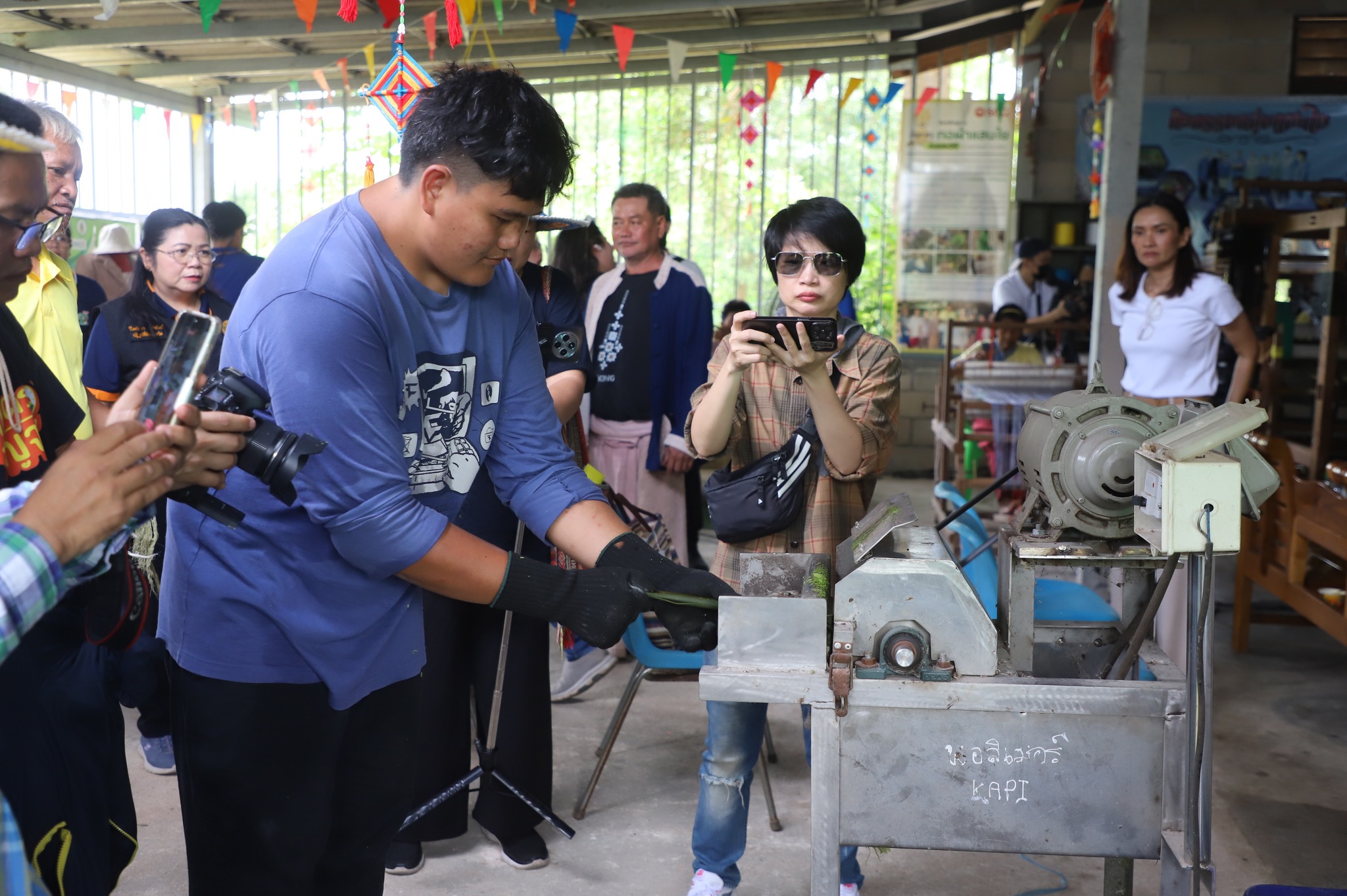 วันนี้ (21 สิงหาคม 2568) นายเศรษฐเกียรติ กระจ่างวงษ์ เลขาธิการสำนักงานการปฏิรูปที่ดินเพื่อเกษตรกรรม (ส.ป.ก.) ได้มอบหมายให้ นายสุรชัย ยุทธชนะ รองเลขาธิการ ส.ป.ก. นำคณะสื่อมวลชนเยี่ยมชมผลดำเนินงานกลุ่มวิสาหกิจชุมชนกลุ่มทอผ้าแสนใย คนแสนวิถี อำเภอปลวกแดง จังหวัดระยอง ซึ่งภายในงานเกษตรกรในเขตปฏิรูปที่ดินได้มีการสาธิตแปรรูปเป็นผลิตภัณฑ์จากผ้าทอใยสับปะรดและนำสินค้าและผลิตภัณฑ์มาจัดแสดงและจำหน่าย อาทิ ผลิตภัณฑ์จากผ้าทอใยสับปะรด เช่น เสื้อ หมวก กระเป๋า หน้ากากผ้า พวงกุญแจ เป็นต้น