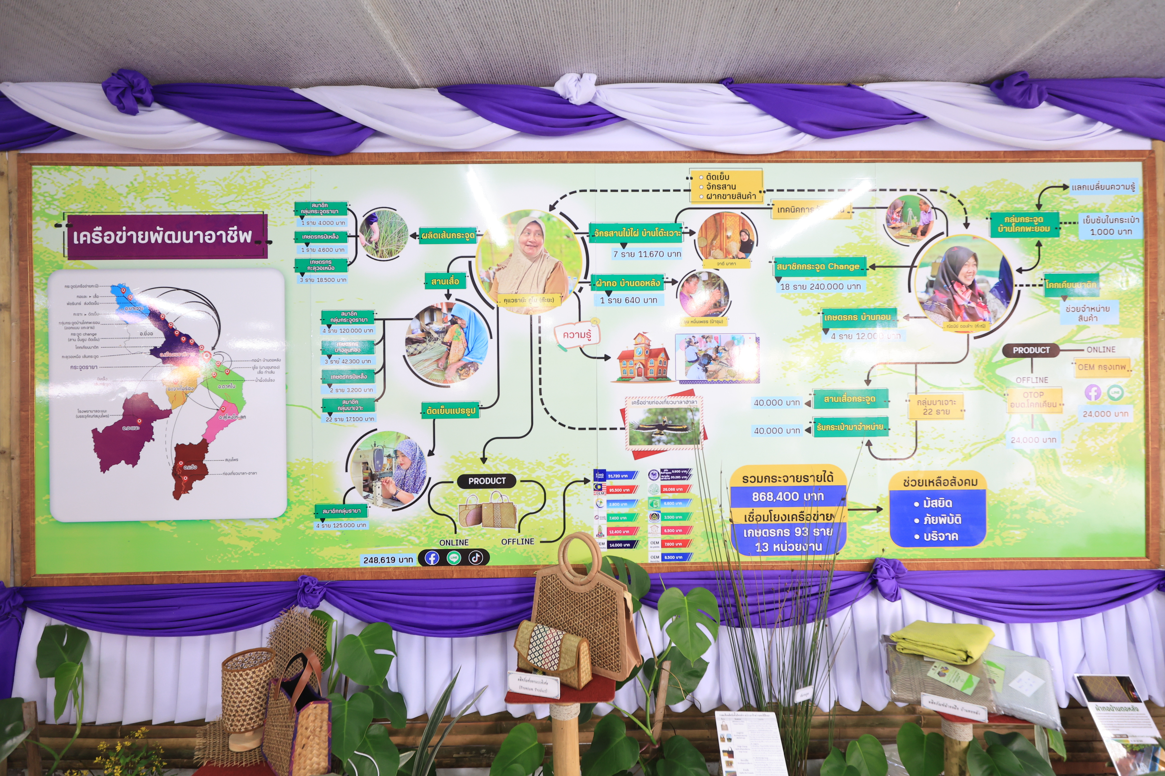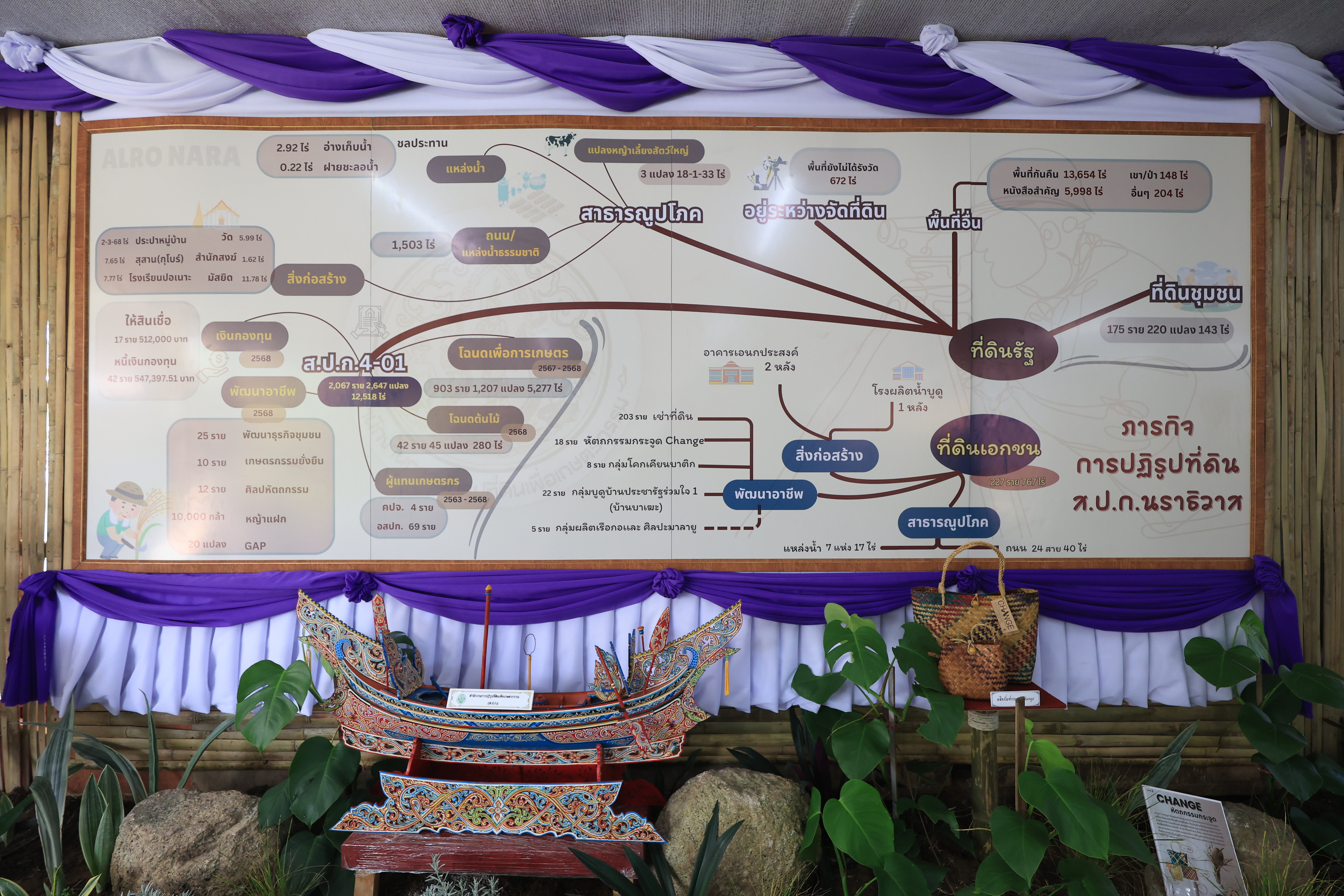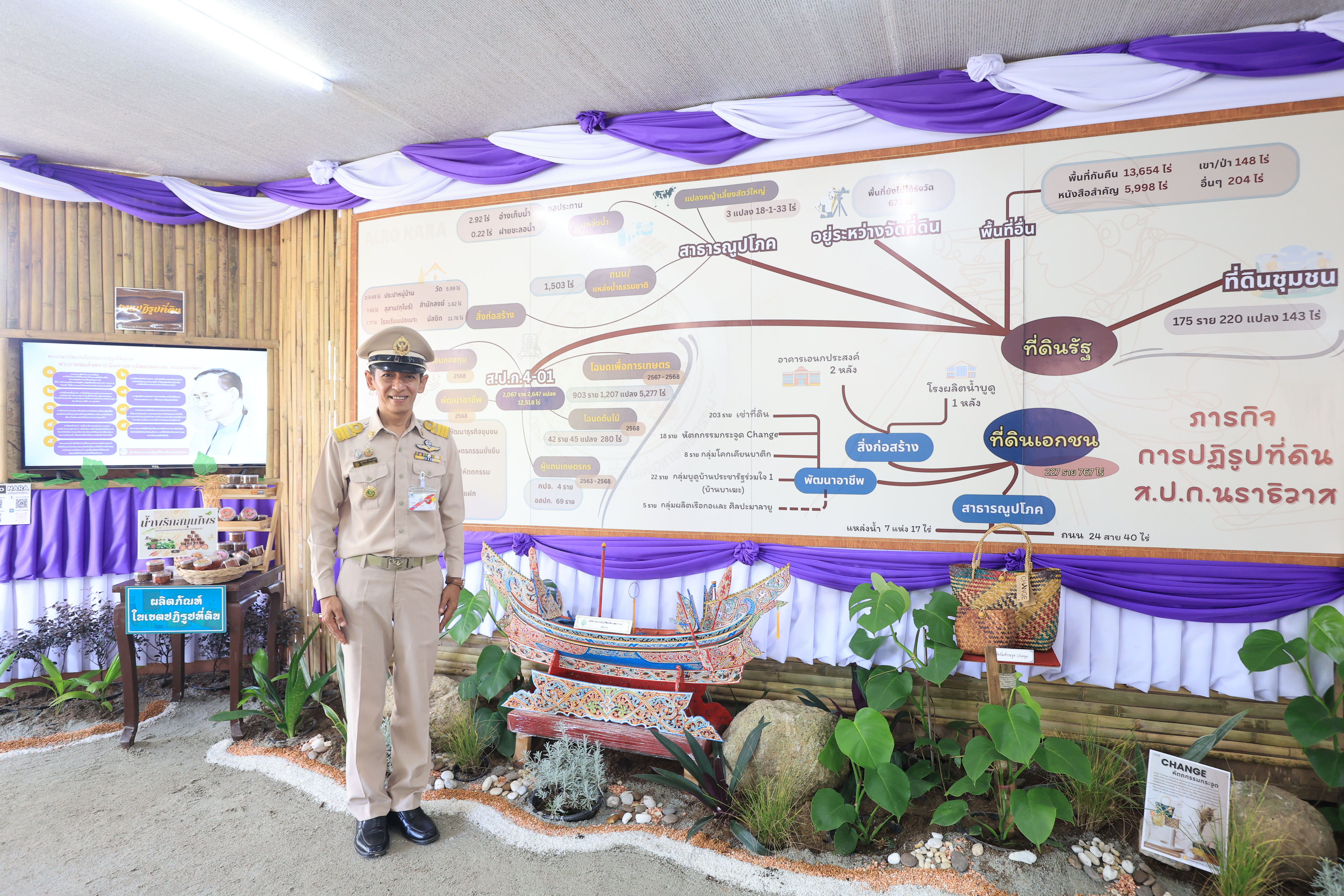 ในส่วนของ สำนักงานการปฏิรูปที่ดินเพื่อเกษตรกรรม (ส.ป.ก.) โดย สำนักงานการปฏิรูปที่ดินจังหวัดนราธิวาส (ส.ป.ก. นราธิวาส) ร่วมจัดนิทรรศการแสดงผลงาน โดยนำเสนอการพัฒนาอาชีพในเขตปฏิรูปที่ดินจังหวัดนราธิวาส มุ่งเน้นการสร้างรายได้และพัฒนาอาชีพให้กับคนในชุมชน โดยใช้ต้นกระจูดมาเป็นจุดเริ่มต้น ในการผลิตเป็นผลิตภัณฑ์ต่าง ๆ เช่น เสื่อกระจูด และ กระเป๋ากระจูด มีการเชื่อมโยงการทำงานตั้งแต่การปลูก การเก็บเกี่ยว ไปจนถึงการแปรรูป และการขายทั้งแบบออฟไลน์และออนไลน์ ซึ่งมีการกระจายรายได้กว่า 868,400 บาท การเชื่อมโยงเครือข่าย 13 หน่วยงาน 93 ราย มีเครือข่ายความรู้ ร่วมกับเครือข่าย Change ทั้งด้านการตัดเย็บ และการสานเสื่อกระจูดที่มีลวดลายที่เป็นเอกลักษณ์และสวยงาม รวมทั้งการฝากจำหน่ายสินค้าระหว่างกลุ่ม ทำให้เป็นการกระจายรายได้ระหว่างกลุ่ม ทั้งนี้กลุ่มกระจูดรายา ยังได้ถ่ายทอดความรู้ให้แก่สถานศึกษาในพื้นที่ เพื่อต่อยอดภูมิปัญญาและสร้างรายได้ให้แก่เยาวชนรุ่นหลัง แสดงให้ถึงความสำเร็จในการนำภูมิปัญญาท้องถิ่น มาสร้างมูลค่าทางเศรษฐกิจให้กับชุมชนได้อย่างเป็นระบบและยั่งยืน