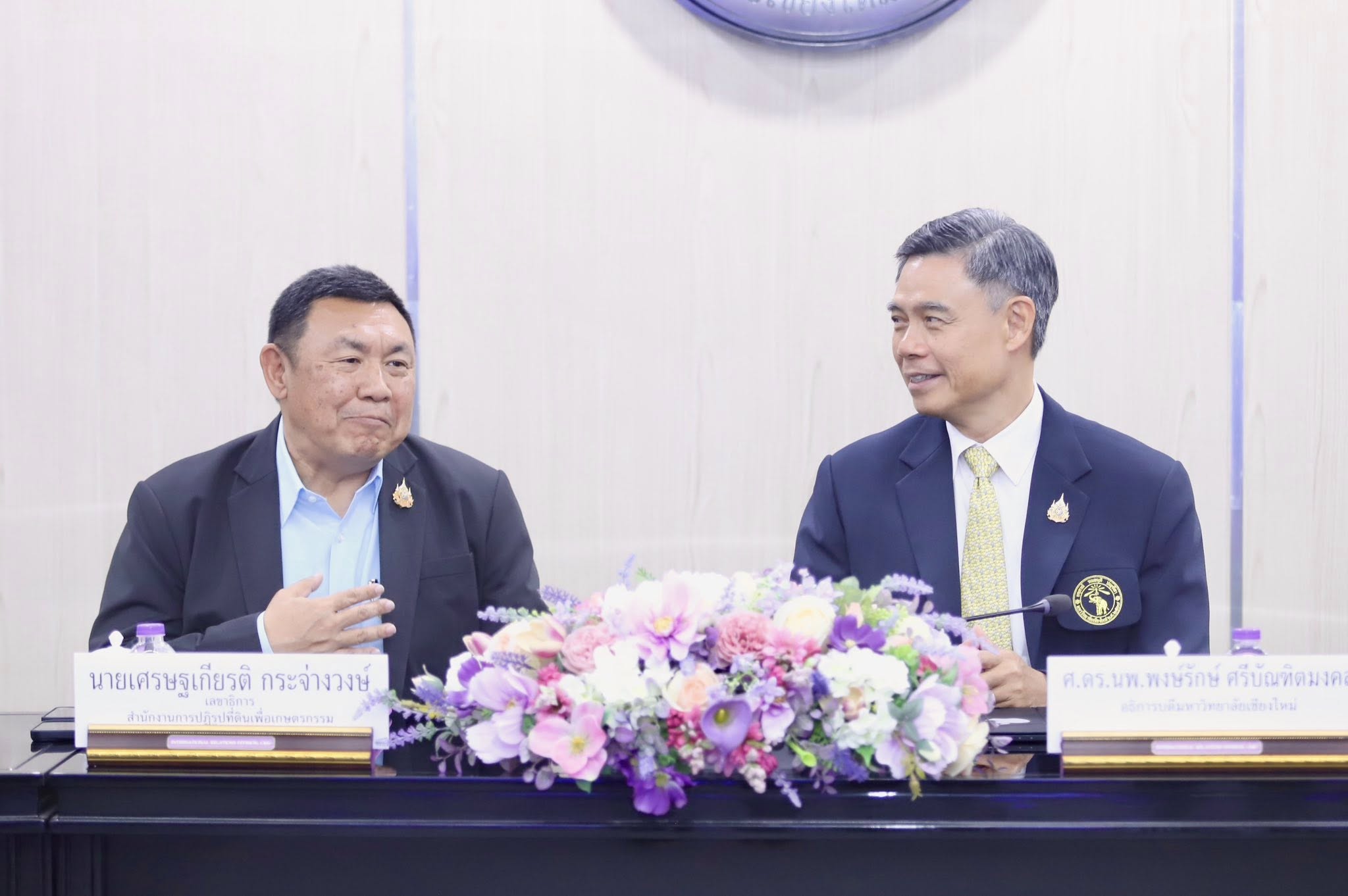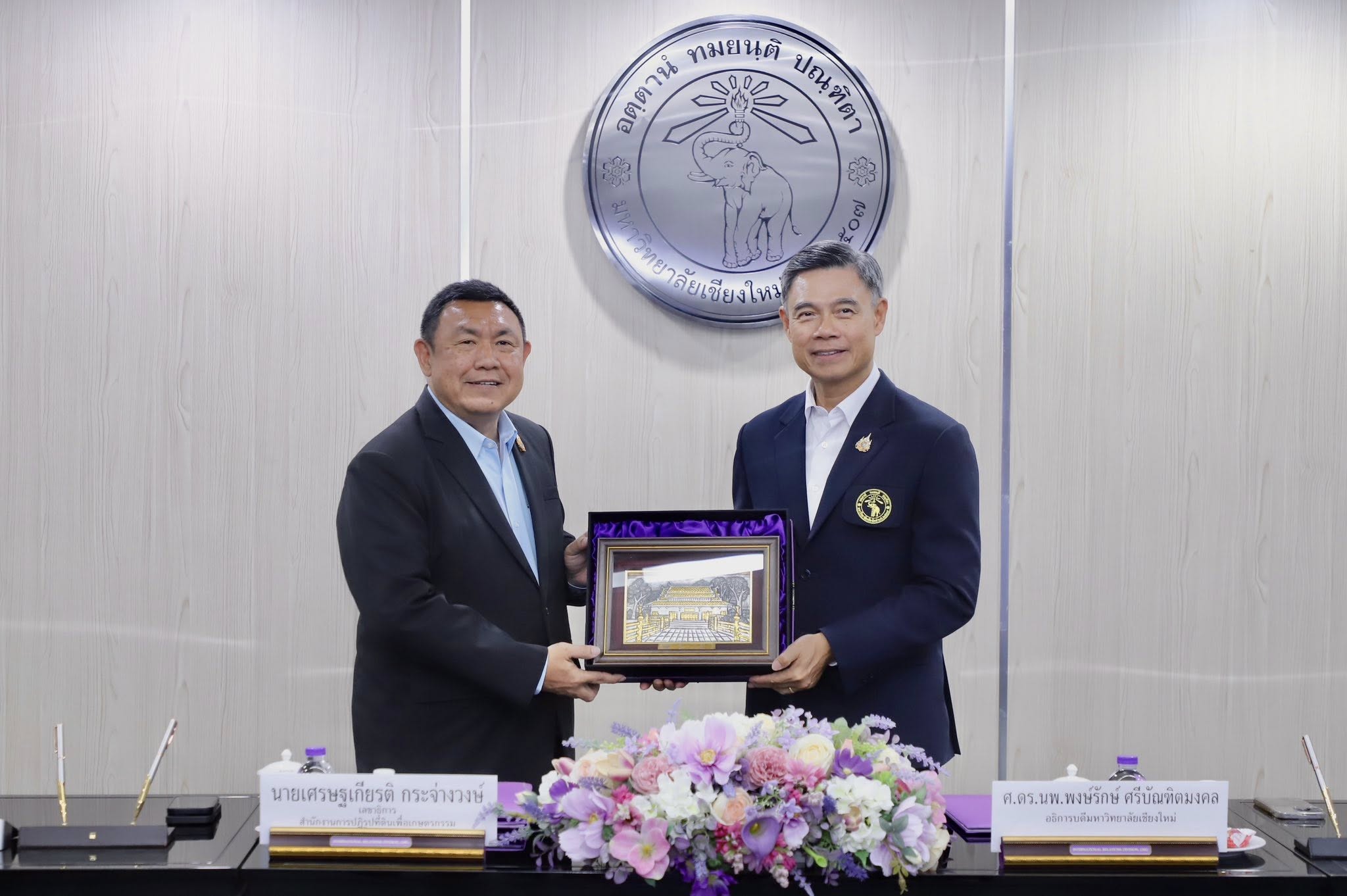 สำนักงานการปฏิรูปที่ดินเพื่อเกษตรกรรม หรือ ส.ป.ก. ได้ดำเนินงานโครงการอันเนื่องมาจากพระราชดำริ โดยมีวัตถุประสงค์เพื่อพัฒนาคุณภาพชีวิตของเกษตรกรตามแนวพระราชดำริให้ดียิ่งขึ้น และการอนุรักษ์ ฟื้นฟูทรัพยากรธรรมชาติและสิ่งแวดล้อมในเขตปฏิรูปที่ดิน รวมทั้งขยายผลการพัฒนาตามแนวพระราชดำริไปสู่เขตปฏิรูปที่ดิน 72 จังหวัด โดยโครงการอันเนื่องมาจากพระราชดำรินั้นเป็นรากฐานการพัฒนาที่สำคัญและเชื่อมโยงกับวิถีชีวิตของประชาชน การลงนามบันทึกข้อตกลงความร่วมมือฉบับนี้ ส.ป.ก. และ มหาวิทยาลัยเชียงใหม่ ได้มีเจตนารมย์ร่วมกันสืบสาน รักษา และต่อยอด โดยการประยุกต์ใช้แนวพระราชดำริเพื่อขับเคลื่อนการดำเนินงานโครงการอันเนื่องมาจากพระราชดำริ และขยายผลการพัฒนาตามแนวพระราชดำริไปสู่เขตปฏิรูปที่ดิน โดยร่วมมือกันดำเนินการ ด้านการฟื้นฟูและอนุรักษ์ทรัพยากรธรรมชาติ ดิน น้ำ ป่า การสร้างความมั่นคงทางอาหารในชุมชนเขตปฏิรูปที่ดิน ด้านการศึกษา วิจัย พันธุ์พืช พันธุ์สัตว์ แมลง เพื่อการอนุรักษ์และสร้างความหลากหลายทางชีวภาพ การพัฒนาเชิงพื้นที่ตามภูมิสังคม การพัฒนาองค์ความรู้ พัฒนาอาชีพ การวิจัย และพัฒนาผลิตภัณฑ์ เพื่อเสริมสร้างความเข้มแข็งทางเศรษฐกิจ สังคมในระดับครัวเรือนและชุมชนให้มีคุณภาพชีวิตที่ดีขึ้น รวมทั้งการพัฒนาบุคลากร การสนับสนุนทางวิชาการร่วมกันต่อไป