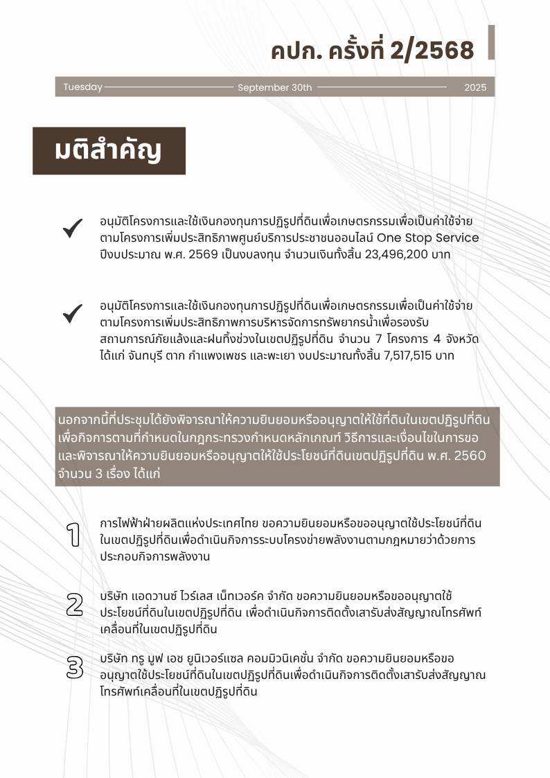 โดยที่ประชุมอนุมัติโครงการและใช้เงินกองทุนการปฏิรูปที่ดินเพื่อเกษตรกรรมเพื่อเป็นค่าใช้จ่ายตามโครงการเพิ่มประสิทธิภาพศูนย์บริการประชาชนออนไลน์ One Stop Service ปีงบประมาณ พ.ศ. 2569 เป็นงบลงทุน จำนวนเงินทั้งสิ้น 23,496,200 บาท รวมถึงพิจารณาอนุมัติโครงการและใช้เงินกองทุนการปฏิรูปที่ดินเพื่อเกษตรกรรมเพื่อเป็นค่าใช้จ่ายตามโครงการเพิ่มประสิทธิภาพการบริหารจัดการทรัพยากรน้ำเพื่อรองรับสถานการณ์ภัยแล้งและฝนทิ้งช่วงในเขตปฏิรูปที่ดิน จำนวน 7 โครงการ 4 จังหวัด ได้แก่ จันทบุรี ตาก กำแพงเพชร และพะเยา งบประมาณทั้งสิ้น 7,517,515 บาท