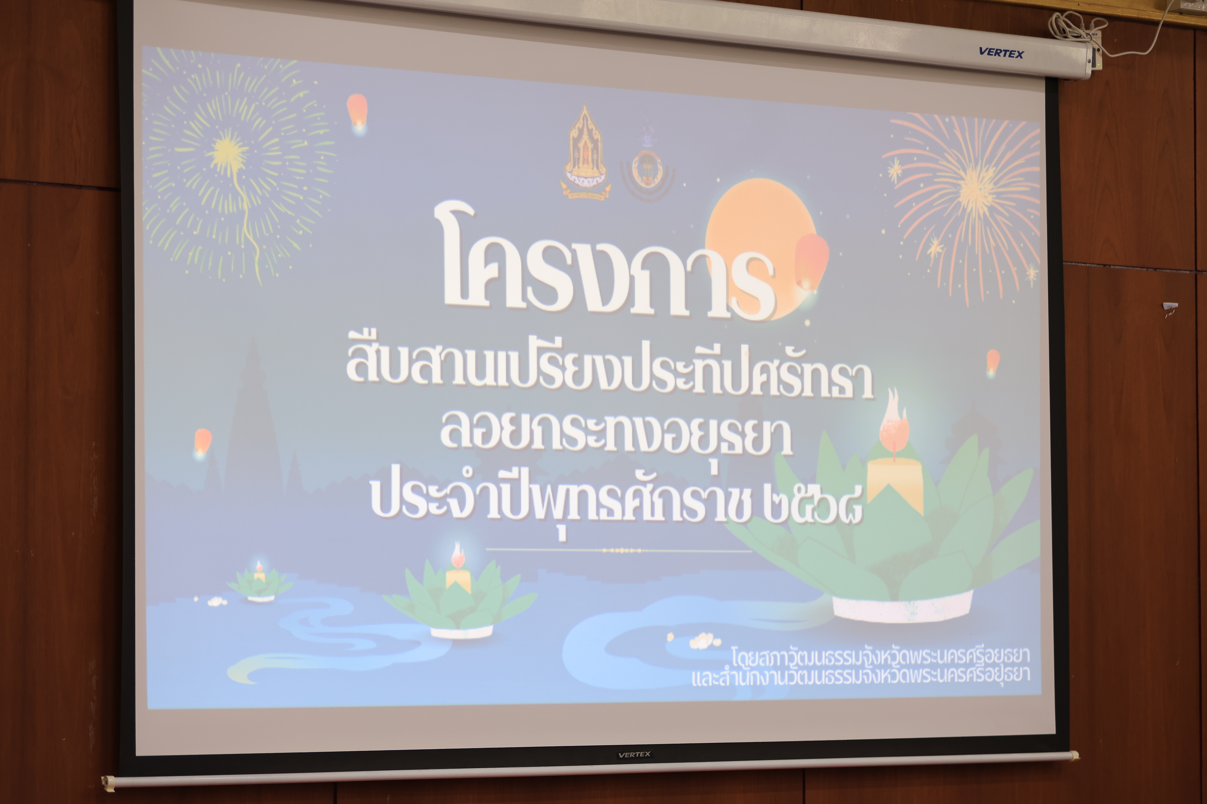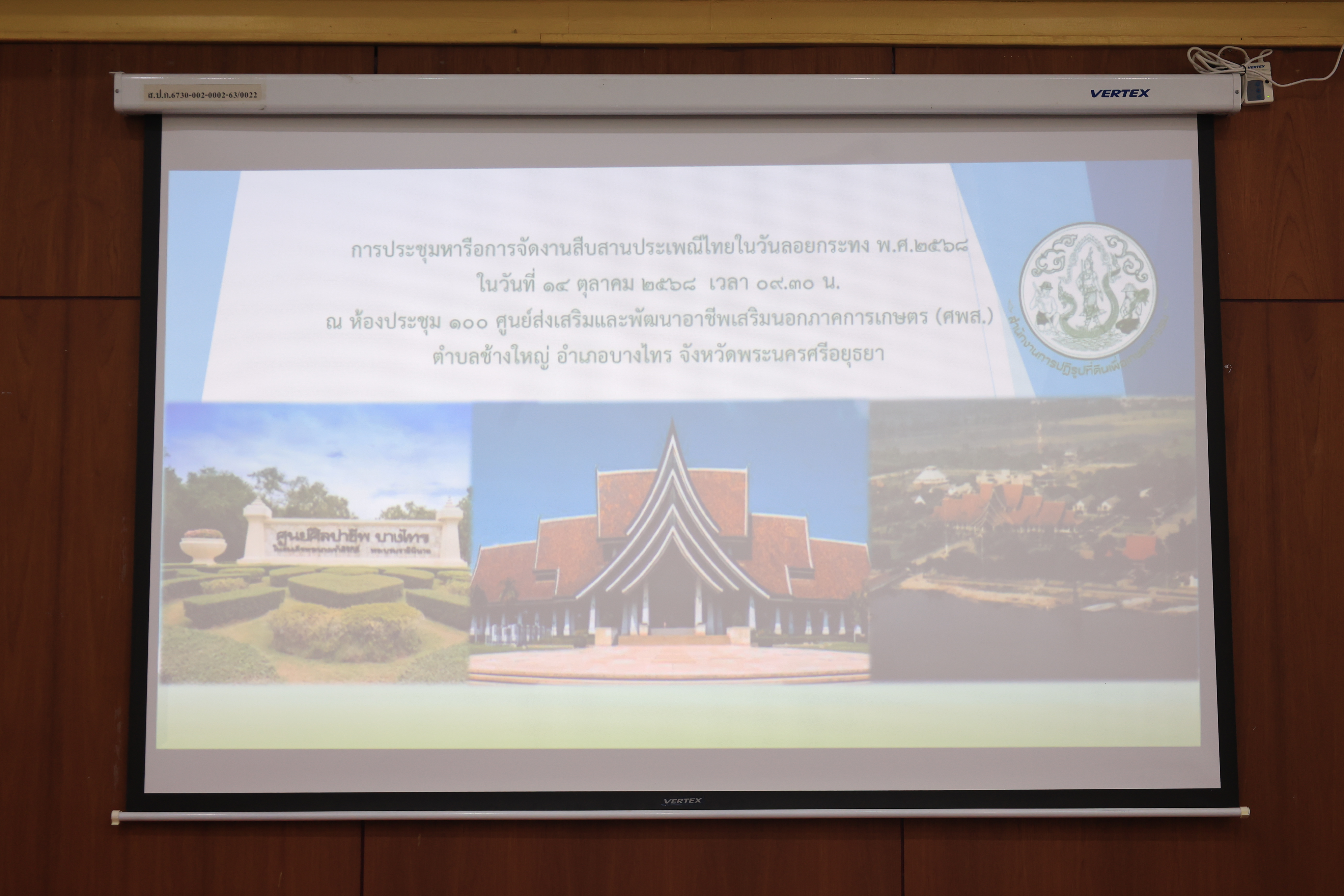14 ตุลาคม 2568 เวลา 9.30 น. นายเศรษฐเกียรติ กระจ่างวงษ์ เลขาธิการ ส.ป.ก. พร้อมด้วย นายคมกฤษ แป้นโพธิ์กลาง ผู้ตรวจราชการกรม นายธเนตร พารา ผู้อำนวยการสำนักพัฒนาและถ่ายทอดเทคโนโลยี นางสาวพจนันท์ กองมาก ปฏิรูปที่ดินจังหวัดพระนครศรีอยุธยา นางสาวสิริมา แจ้งกระจ่าง ผู้อำนวยการศูนย์ส่งเสริมและพัฒนาอาชีพเสริมนอกภาคการเกษตร นางญานิชศา ธงนำชัยมา ผู้อำนวยการศูนย์การเรียนรู้เพื่อการปฏิรูปที่ดิน ผู้แทนจากสำนักที่เกี่ยวข้อง ร่วมประชุมพิจารณาหารือการจัดงาน สืบสานประเพณีไทยในวันลอยกระทง พ.ศ. 2568 กับหน่วยงานต่าง ๆ ในเขตอำเภอบางไทรและหน่วยงานในจังหวัดพระนครศรีอยุธยาที่เกี่ยวข้อง อาทิ รูปแบบการจัดงาน การขอความร่วมมือจากหน่วยงานต่าง ๆ รวมถึงยกร่างคำสั่งคณะทำงานฯ ณ ห้องประชุม 100 ศูนย์ส่งเสริมและพัฒนาอาชีพเสริมนอกภาคการเกษตร (ศพส.) ตำบลช้างใหญ่ อำเภอบางไทร จังหวัดพระนครศรีอยุธยา