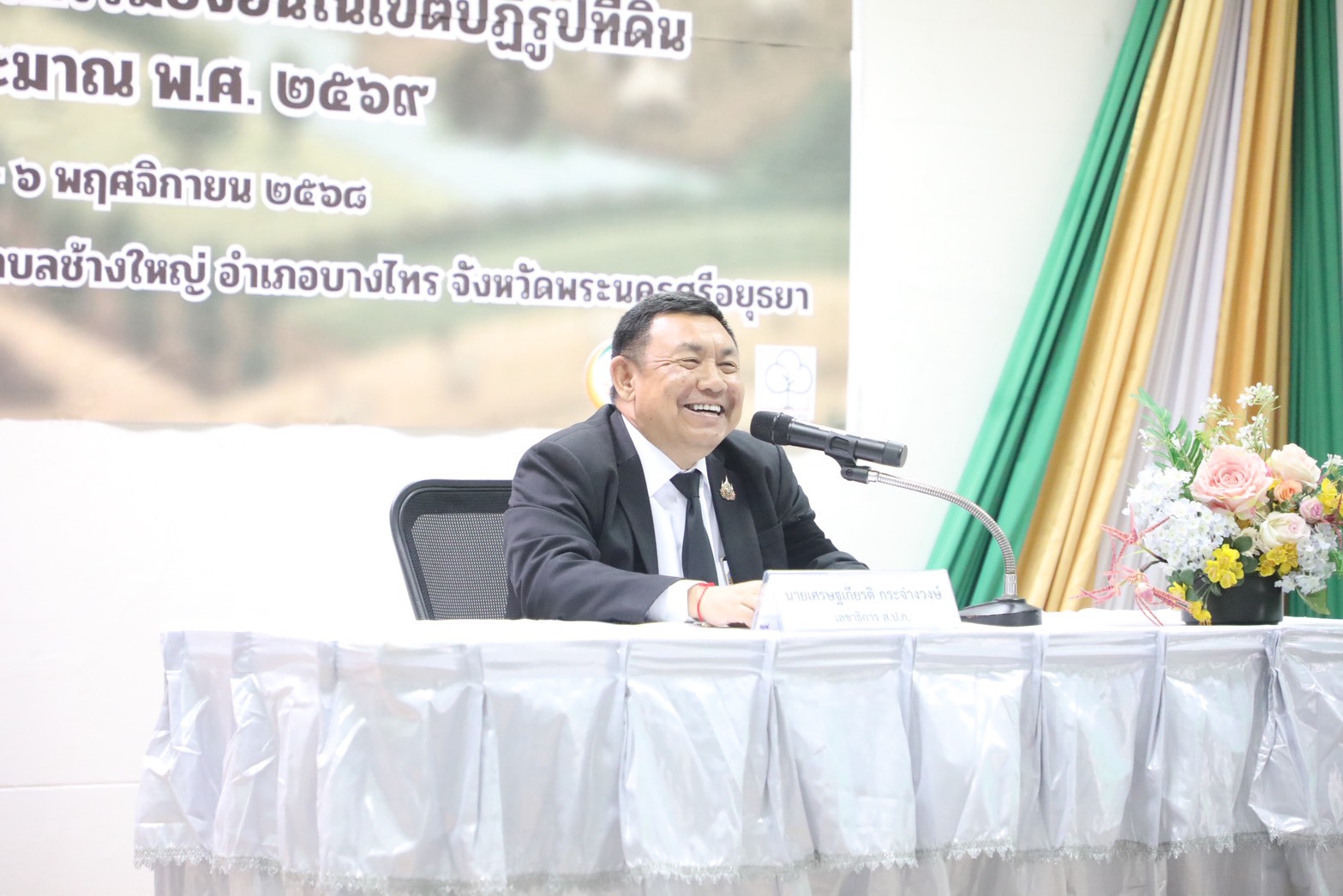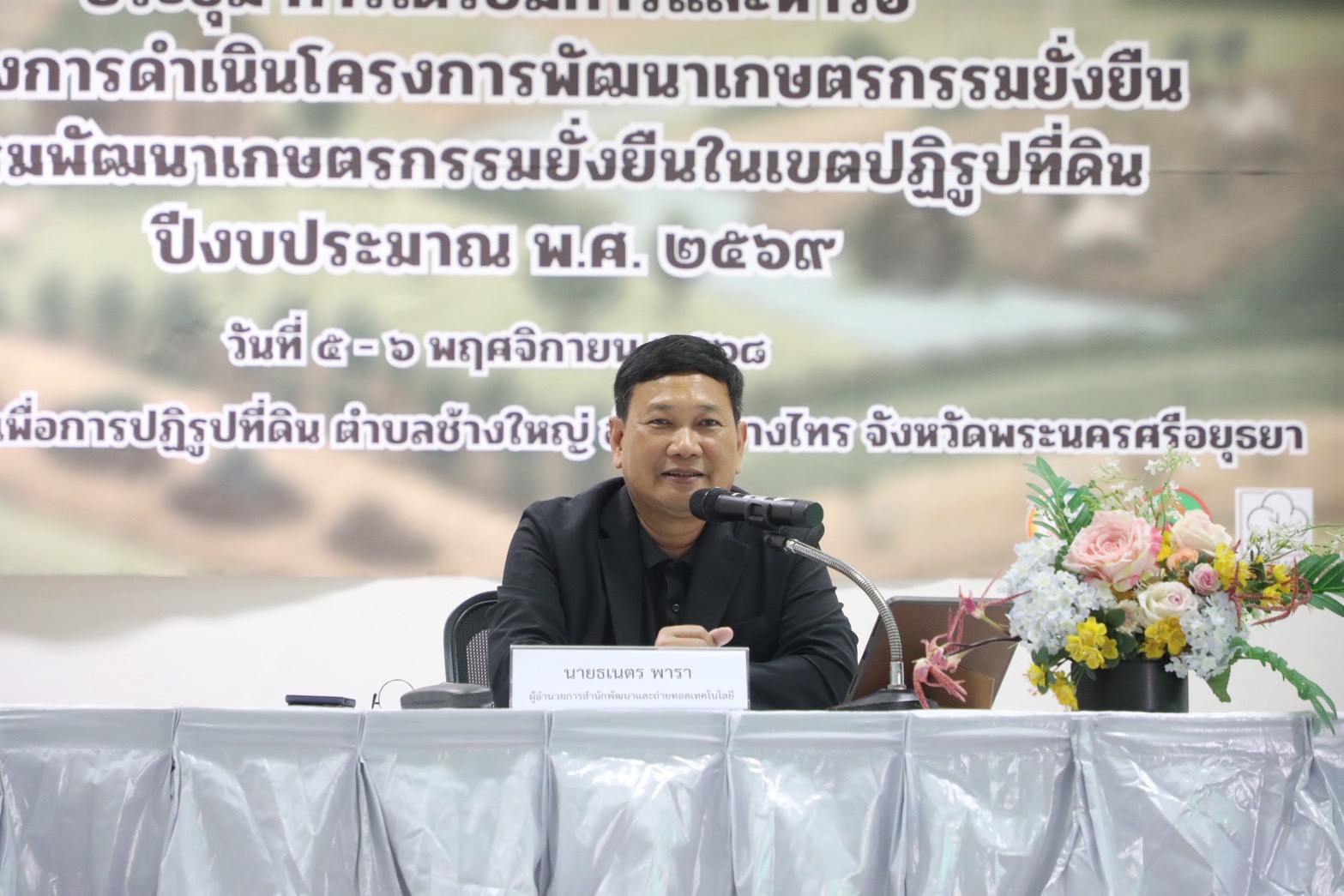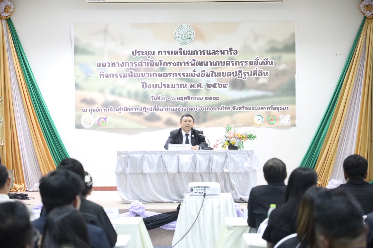 สำนักงานการปฏิรูปที่ดินเพื่อเกษตรกรรม (ส.ป.ก.) จัดพิธีเปิดการประชุม "การเตรียมการและหารือแนวทางการดำเนินโครงการพัฒนาเกษตรกรรมยั่งยืน กิจกรรมพัฒนาเกษตรกรรมยั่งยืนในเขตปฏิรูปที่ดิน ปีงบประมาณ พ.ศ. 2569" ระหว่างวันที่ 5 - 6 พฤศจิกายน 2568 โดยมีวัตถุประสงค์เพื่อขับเคลื่อนงานพัฒนาภาคการเกษตรให้เกิดความมั่นคงและยั่งยืน นายเศรษฐเกียรติ กระจ่างวงษ์ เลขาธิการสำนักงานการปฏิรูปที่ดินเพื่อเกษตรกรรม (ส.ป.ก.) มอบหมายให้ นายธเนตร พารา ผู้อำนวยการสำนักพัฒนาและถ่ายทอดเทคโนโลยี เป็นประธานในพิธีเปิดงานประชุม พร้อมปฏิรูปที่ดินจังหวัด ผู้ตรวจราชการ/หัวหน้าผู้ตรวจราชการ และเจ้าหน้าที่ที่เกี่ยวข้อง เข้าประชุม