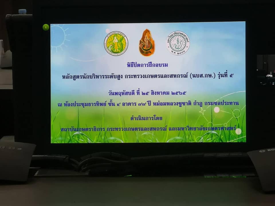 วันที่ 25 สิงหาคม 2565 เวลา 11.00 น. นายเอกพงศ์ น้อยสร้าง รองเลขาธิการสำนักงานการปฏิรูปที่ดินเพื่อเกษตรกรรม(ส.ป.ก.) ได้รับมอบหมายจาก เลขาธิการ ส.ป.ก.(ดร.วิณะโรจน์ ทรัพย์ส่งสุข)ร่วมเป็นเกียรติในพิธีปิดหลักสูตรนักบริหารระดับสูง กระทรวงเกษตรและสหกรณ์(นบส.กษ.)รุ่นที่5 โดย ดร.ทองเปลว กองจันทร์ ปลัดกระทรวงเกษตรและสหกรณ์เป็นประธานในพิธีปิดและให้โอวาทแก่ผู้ผ่านการอบรมทั้งหมด 48 ราย รวมระยะเวลาการฝึกอบรม(แบบออนไลน์) 43 วันทำการ ซึ่งนางสาวอัจฉริยา จันทรวงศ์ ผู้อำนวยการสถาบันเกษตราธิการ รายงานว่า การอบรมครั้งนี้เพื่อเป็นการปรับแนวคิด มุมมอง วิธีการทำงาน การสื่อสาร บุคลิกภาพ ตลอดจนวิธีการแก้ปัญหา และมีความพร้อมทางด้านภาวะผู้นำ(leadership) และความสามารถทางการบริหาร(management) เพื่อเป็นการเตรียมความพร้อมในการเข้าสู่ตำแหน่งประเภทบริหารต้น(ตำแหน่งรองอธิบดีหรือเทียบเท่า) พิธีปิดโครงการฝึกอบรมครั้งนี้จัดขึ้น ณ ห้องประชุมธารทิพย์ ชั้น4 อาคาร 99 ปี หม่อมหลวงชูชาติ กำภู (ศูนย์ปฎิบัติการน้ำอัจฉริยะ) กรมชลประทาน ถนนสามเสน เขตดุสิต กรุงเทพฯ