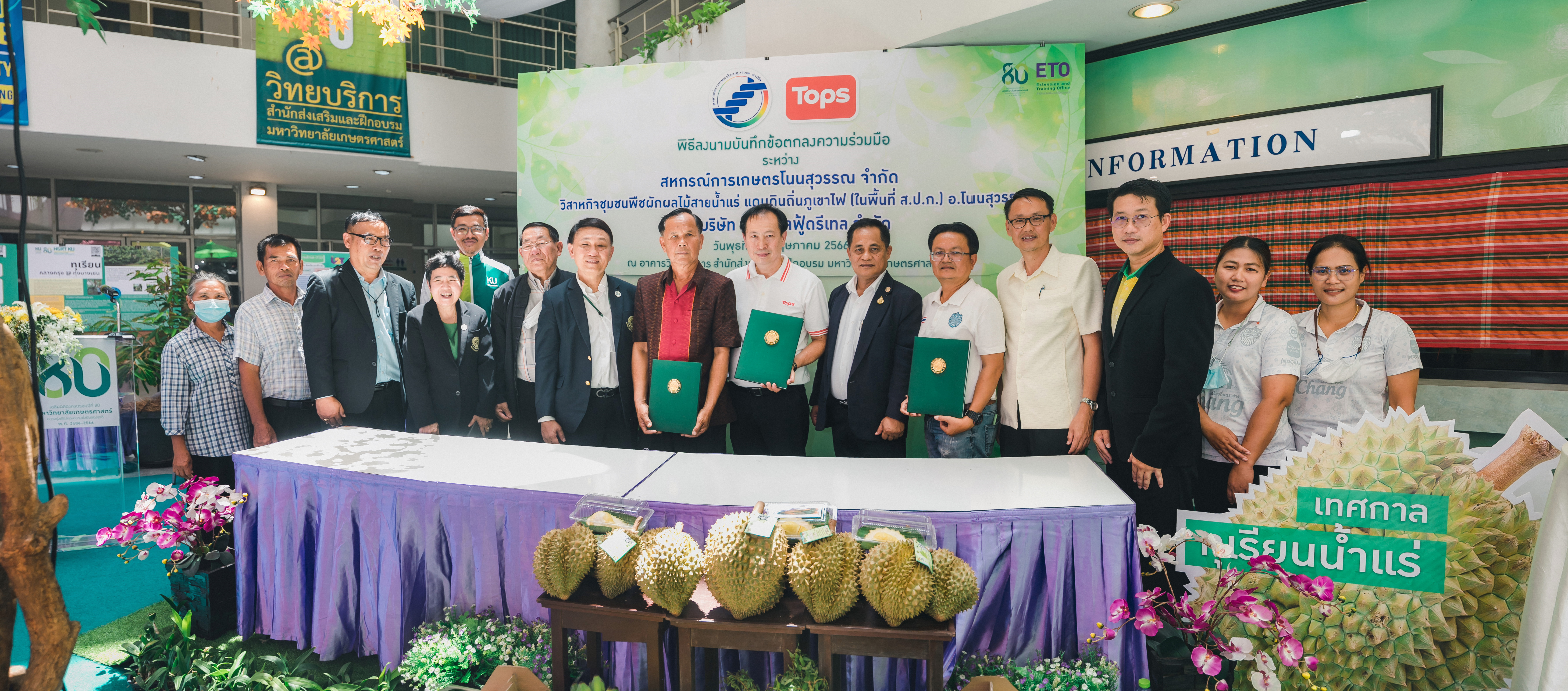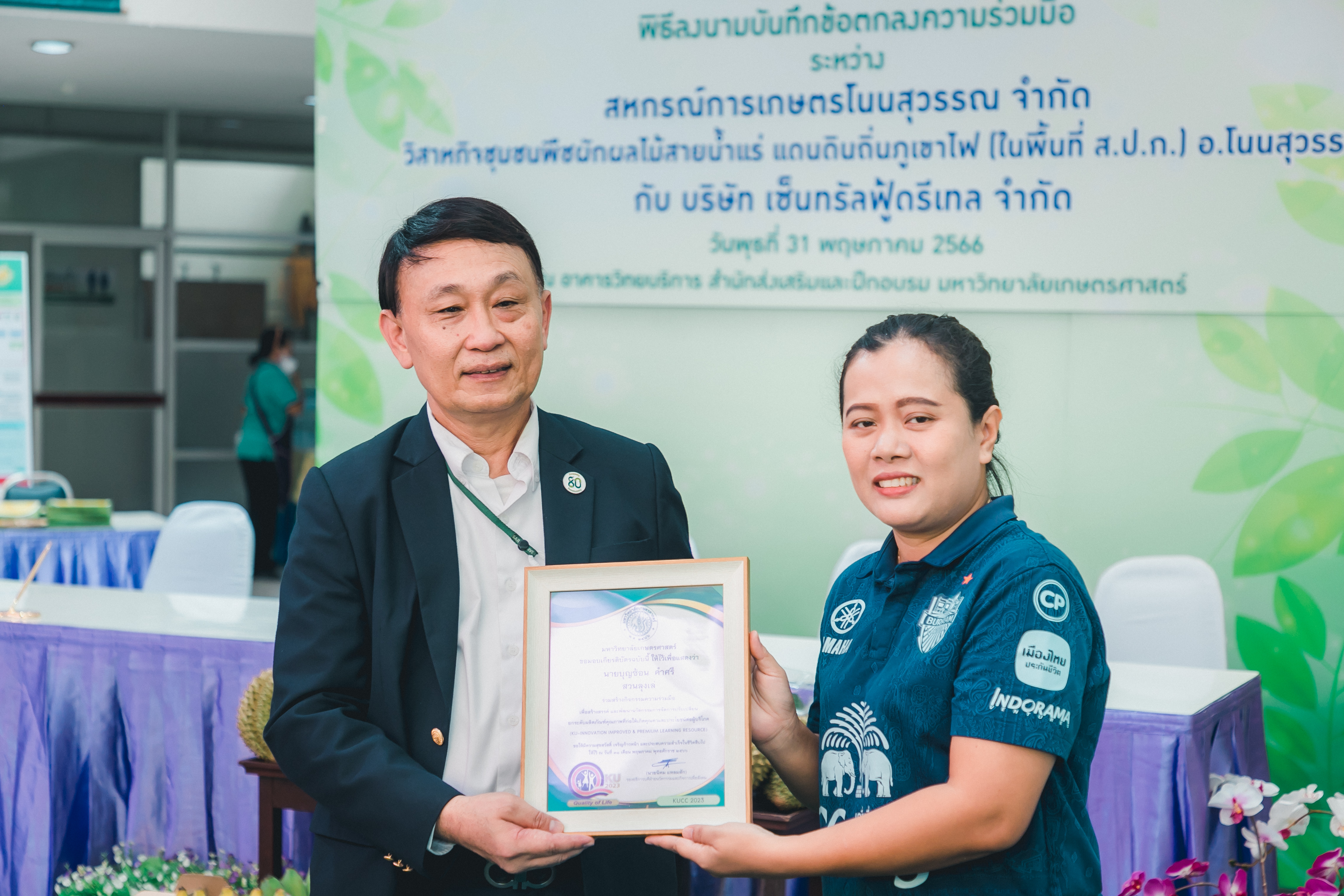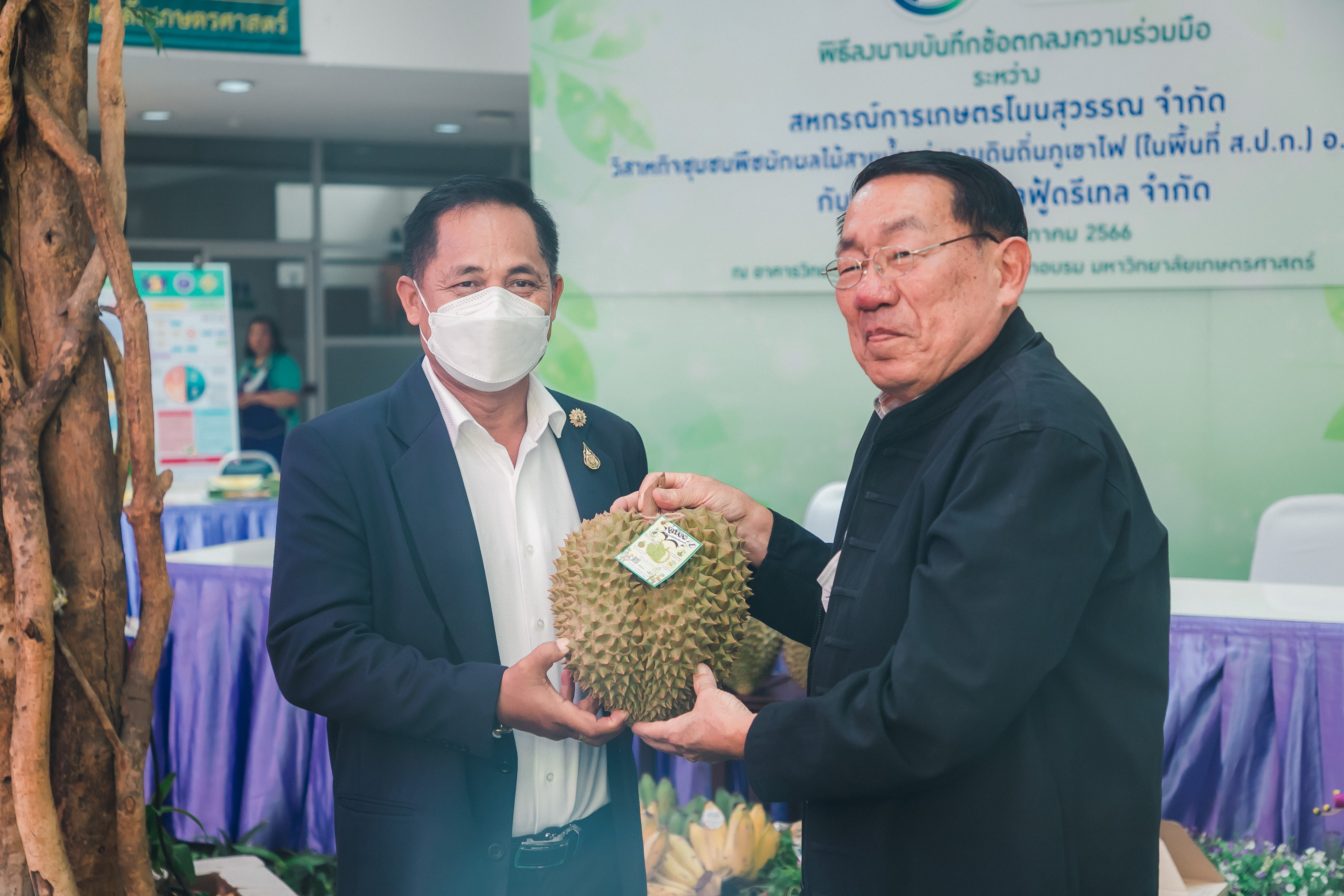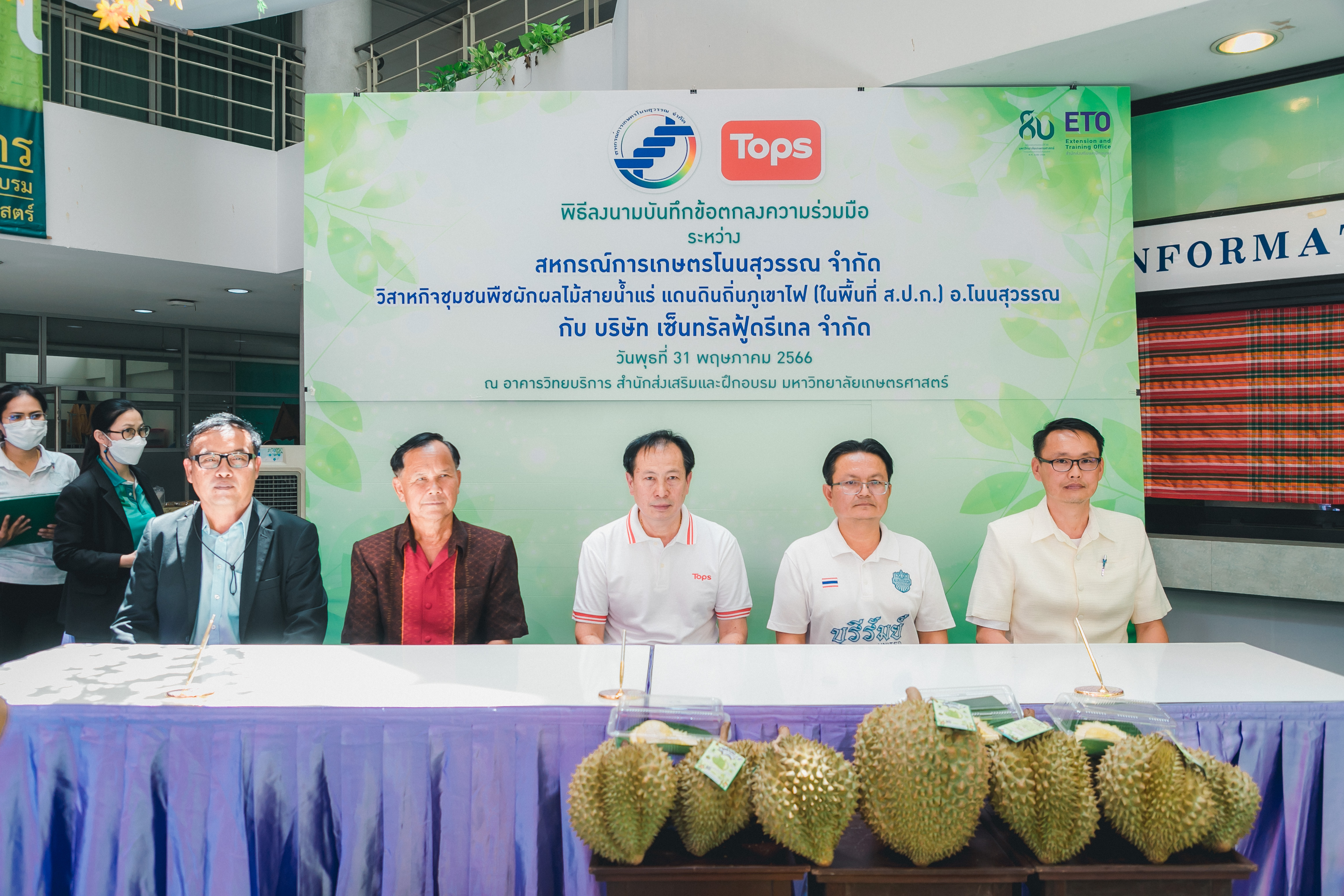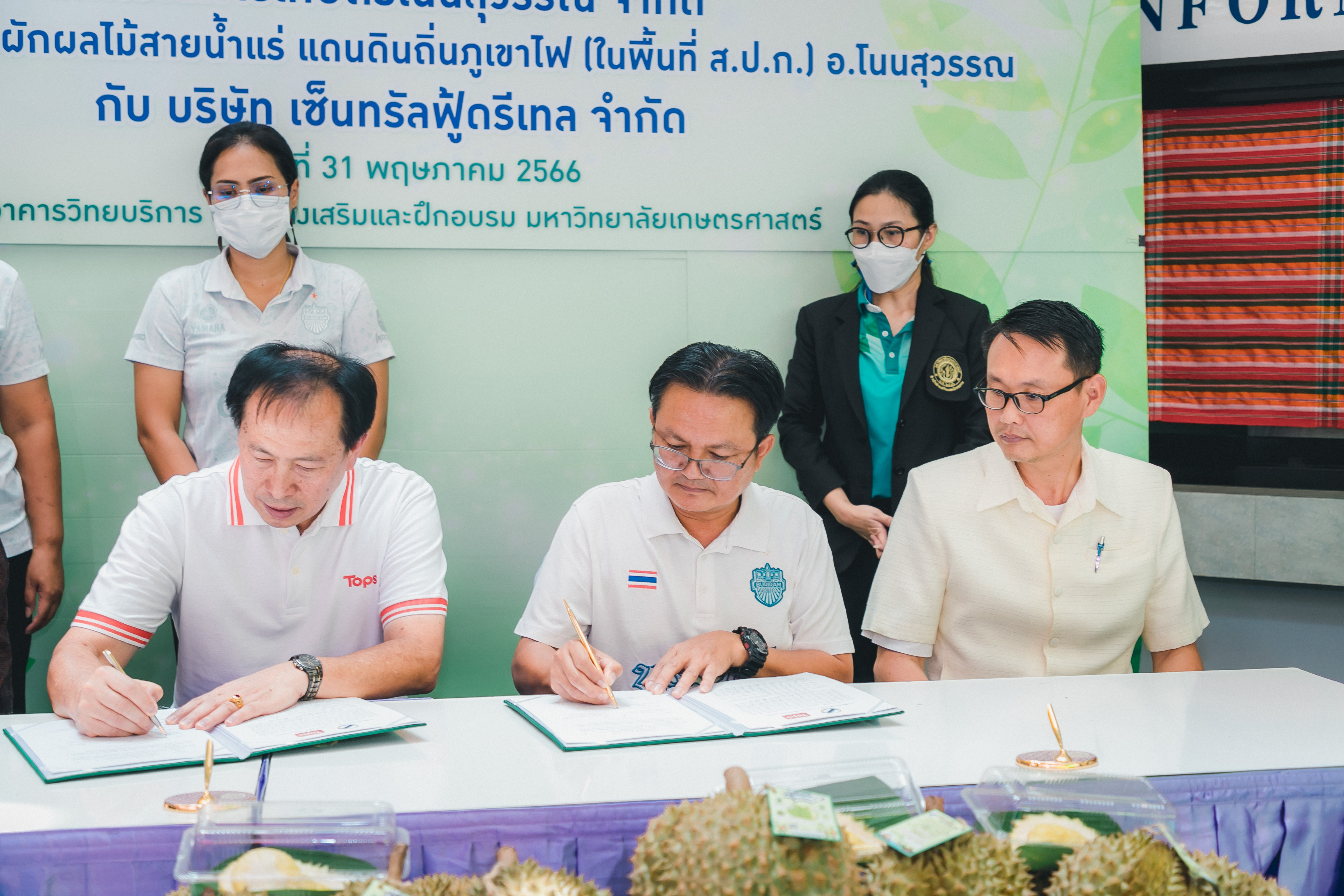 วันที่ 31 พฤษภาคม 2566 ดร.วิณะโรจน์ ทรัพย์ส่งสุข เลขาธิการ ส.ป.ก. มอบหมายให้นายเอกพงศ์ น้อยสร้าง รองเลขาธิการ ส.ป.ก. พร้อมด้วยนายประเสริฐ กาญจนเกียรติกุล ปฏิรูปที่ดินจังหวัดบุรีรัมย์ ร่วมเป็นเกียรติและเป็นสักขีพยานในพิธีลงนามบันทึกข้อตกลงความร่วมมือโครงการยกระดับนวัตกรรมผลิตภัณฑ์ผลไม้ 2023 กิจกรรม KU พลิกฟื้นเศรษฐกิจฐานนวัตกรรม 2023 ภาคตะวันออกเฉียงเหนือ “ทุเรียนน้ำแร่” ระหว่าง สหกรณ์การเกษตรโนนสุวรรณ จำกัด, วิสาหกิจชุมชนกลุ่มพืชผักผลไม้สายน้ำแร่ แดนดินถิ่นภูเขาไฟ ในเขตปฏิรูปที่ดิน อ.โนนสุวรรณ และบริษัท เซ็นทรัล ฟู้ด รีเทล จำกัด โดยมีภาคีเครือข่ายร่วมจัดกิจกรรมพร้อมทั้งเป็นสักขีพยานในพิธีลงนามบันทึกข้อตกลงความร่วมมือดังกล่าว ได้แก่ สำนักงานปฏิรูปที่ดินเพื่อเกษตรกรรม โดยสำนักงานการปฏิรูปที่ดินจังหวัดบุรีรัมย์, มหาวิทยาลัยเกษตรศาสตร์, สำนักงานสหกรณ์จังหวัดบุรีรัมย์, สหกรณ์การเกษตรโนนสุวรรณ จำกัด, วิสาหกิจชุมชน พืชผักผลไม้ สายน้ำแร่ แดนดินถิ่นภูเขาไฟในพื้นที่ ส.ป.ก. อำเภอโนนสุวรรณ จังหวัดบุรีรัมย์ และบริษัท เซ็นทรัล ฟู้ด รีเทล จำกัด ซึ่งกิจกรรมจัดขึ้นระหว่างวันที่ 30-31 พฤษภาคม 2566 ณ สำนักส่งเสริมและฝึกอบรม อาคารวิทยบริการ มหาวิทยาลัยเกษตรศาสตร์