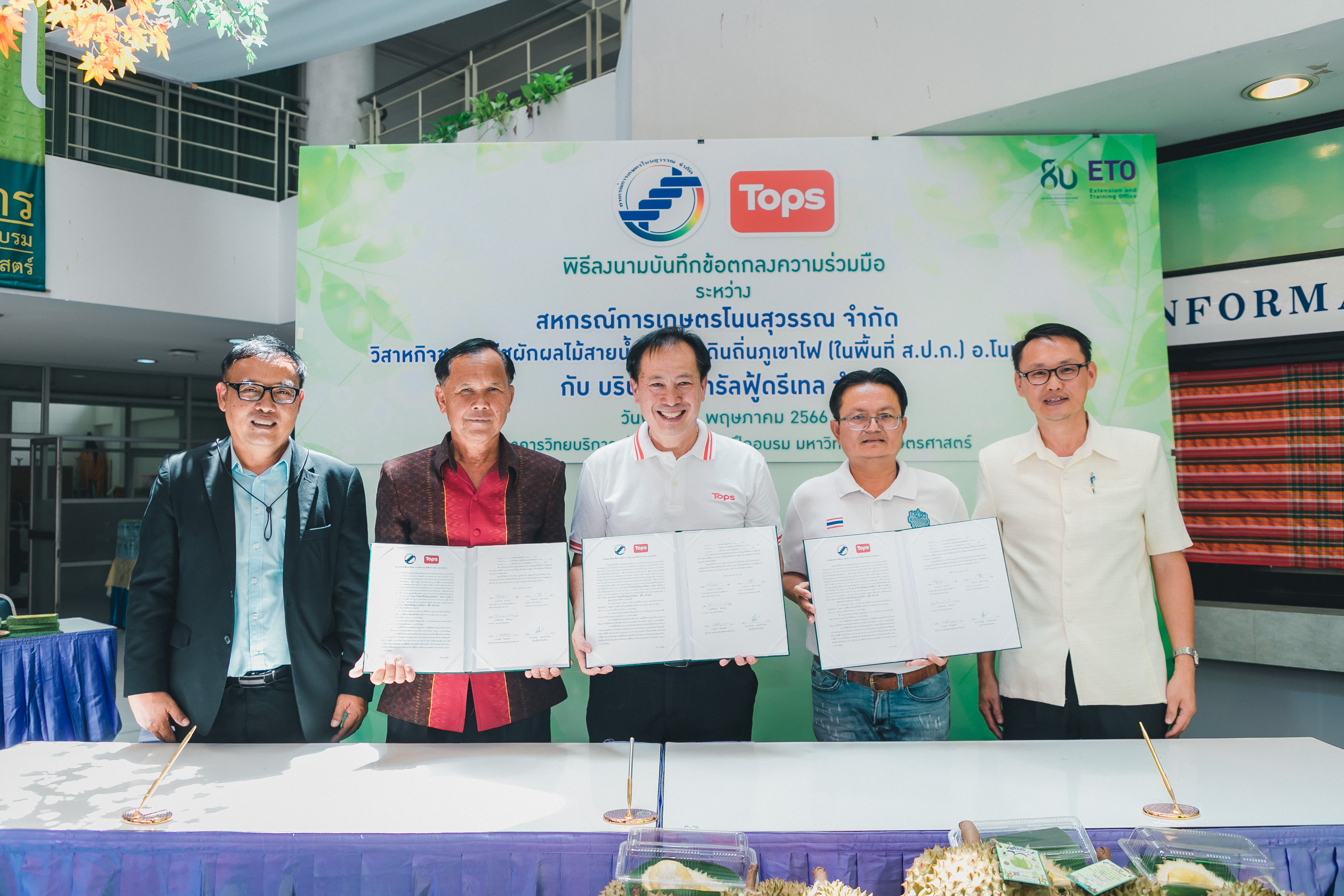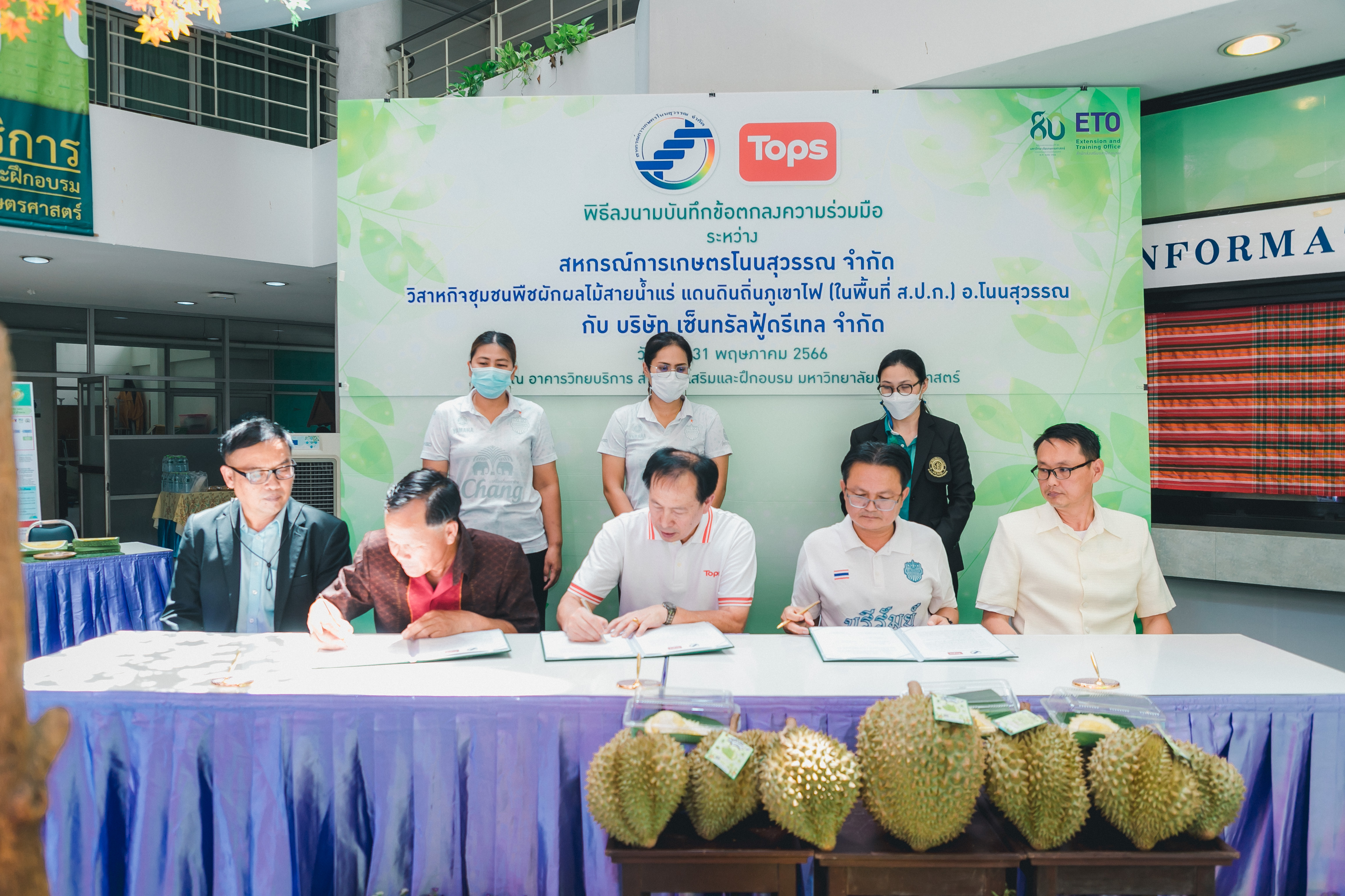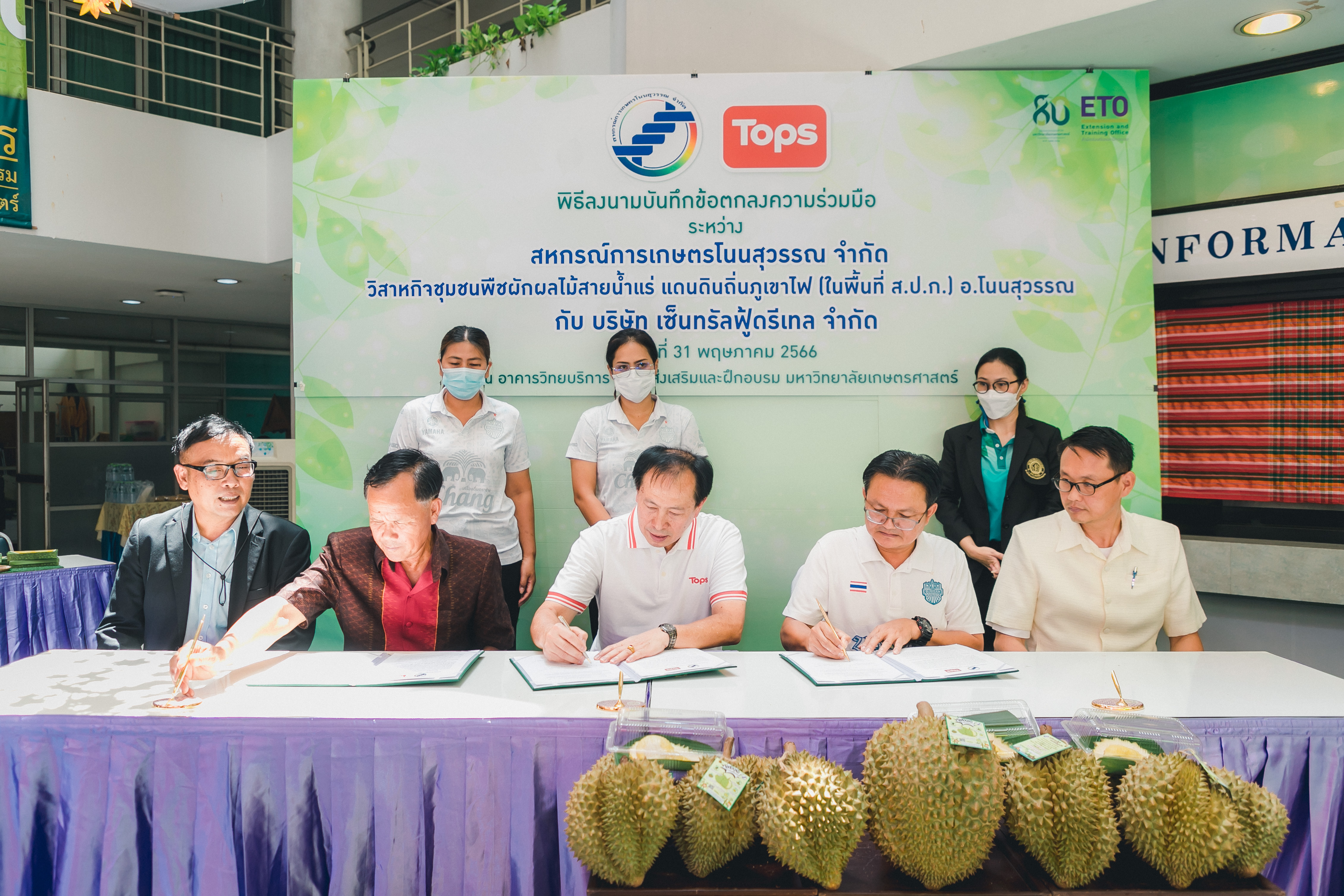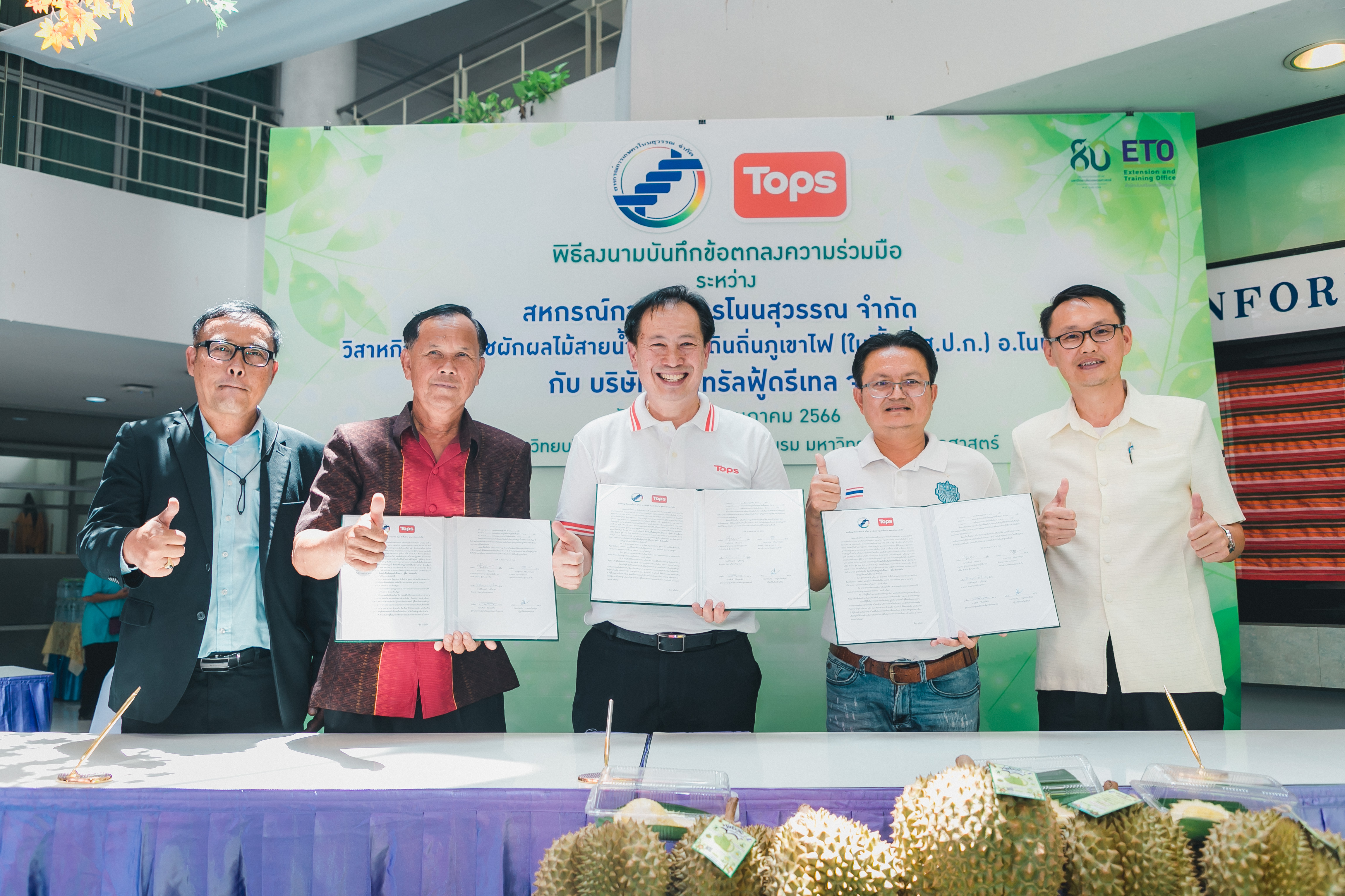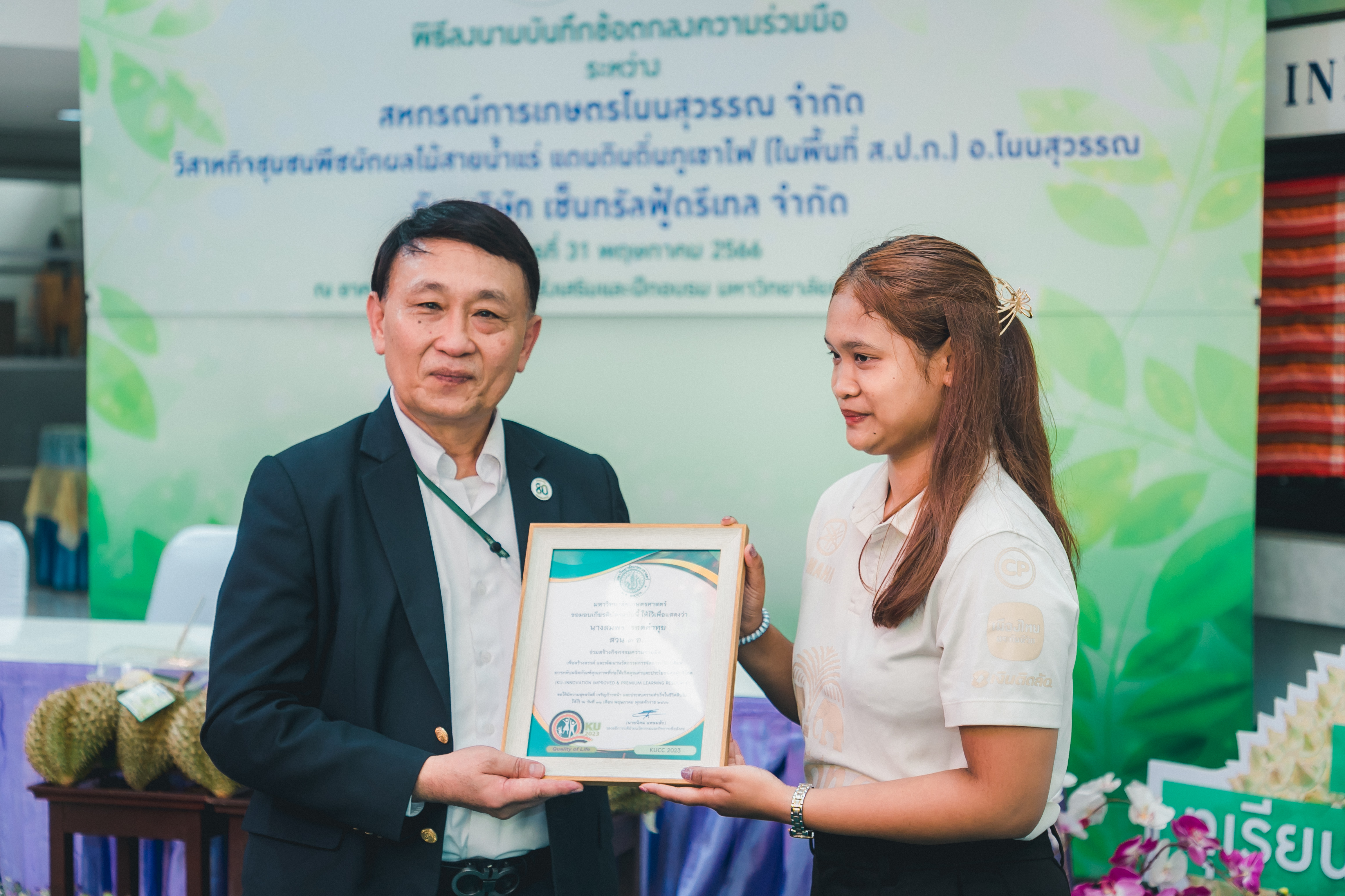 วันที่ 31 พฤษภาคม 2566 ดร.วิณะโรจน์ ทรัพย์ส่งสุข เลขาธิการ ส.ป.ก. มอบหมายให้นายเอกพงศ์ น้อยสร้าง รองเลขาธิการ ส.ป.ก. พร้อมด้วยนายประเสริฐ กาญจนเกียรติกุล ปฏิรูปที่ดินจังหวัดบุรีรัมย์ ร่วมเป็นเกียรติและเป็นสักขีพยานในพิธีลงนามบันทึกข้อตกลงความร่วมมือโครงการยกระดับนวัตกรรมผลิตภัณฑ์ผลไม้ 2023 กิจกรรม KU พลิกฟื้นเศรษฐกิจฐานนวัตกรรม 2023 ภาคตะวันออกเฉียงเหนือ “ทุเรียนน้ำแร่” ระหว่าง สหกรณ์การเกษตรโนนสุวรรณ จำกัด, วิสาหกิจชุมชนกลุ่มพืชผักผลไม้สายน้ำแร่ แดนดินถิ่นภูเขาไฟ ในเขตปฏิรูปที่ดิน อ.โนนสุวรรณ และบริษัท เซ็นทรัล ฟู้ด รีเทล จำกัด โดยมีภาคีเครือข่ายร่วมจัดกิจกรรมพร้อมทั้งเป็นสักขีพยานในพิธีลงนามบันทึกข้อตกลงความร่วมมือดังกล่าว ได้แก่ สำนักงานปฏิรูปที่ดินเพื่อเกษตรกรรม โดยสำนักงานการปฏิรูปที่ดินจังหวัดบุรีรัมย์, มหาวิทยาลัยเกษตรศาสตร์, สำนักงานสหกรณ์จังหวัดบุรีรัมย์, สหกรณ์การเกษตรโนนสุวรรณ จำกัด, วิสาหกิจชุมชน พืชผักผลไม้ สายน้ำแร่ แดนดินถิ่นภูเขาไฟในพื้นที่ ส.ป.ก. อำเภอโนนสุวรรณ จังหวัดบุรีรัมย์ และบริษัท เซ็นทรัล ฟู้ด รีเทล จำกัด ซึ่งกิจกรรมจัดขึ้นระหว่างวันที่ 30-31 พฤษภาคม 2566 ณ สำนักส่งเสริมและฝึกอบรม อาคารวิทยบริการ มหาวิทยาลัยเกษตรศาสตร์
