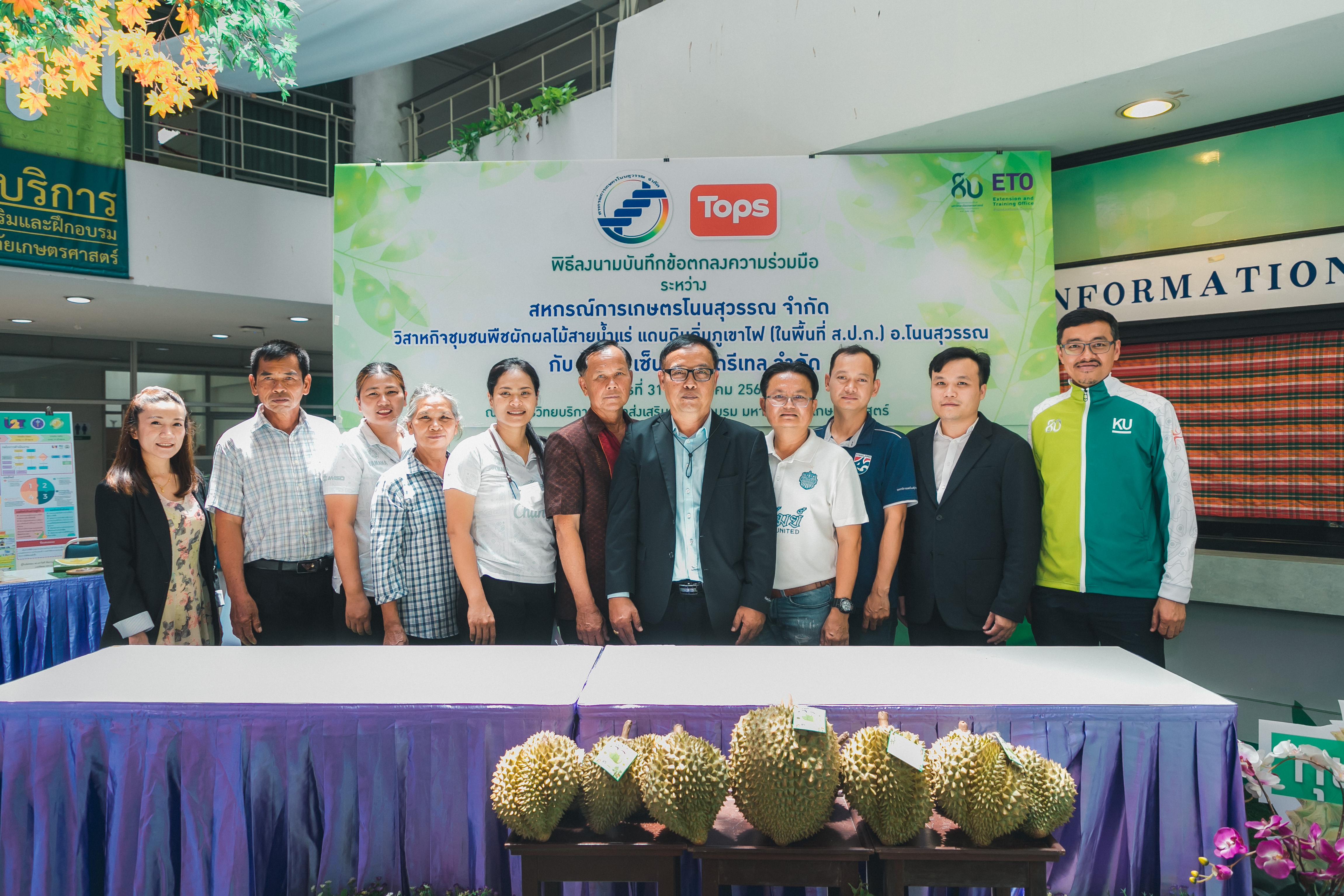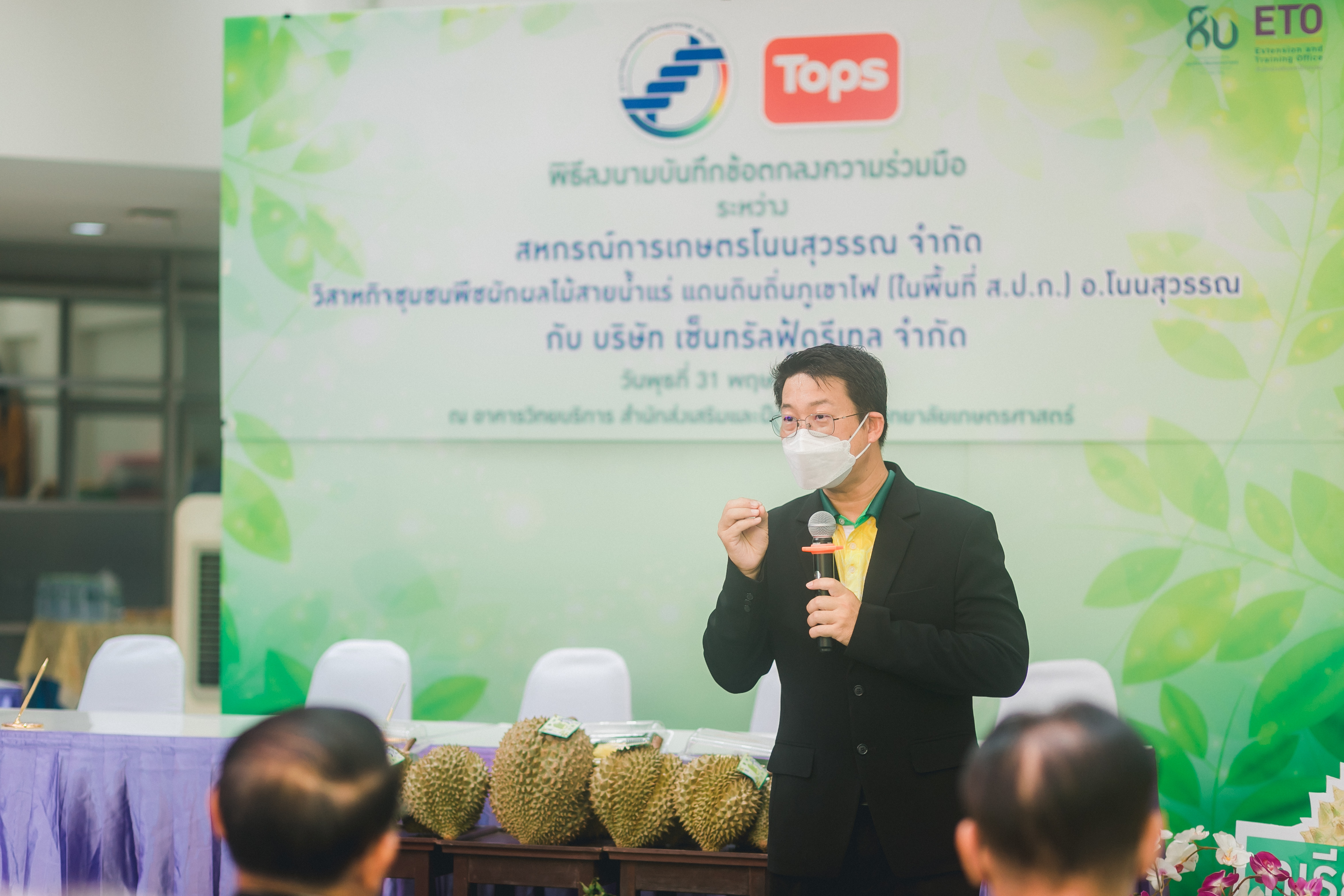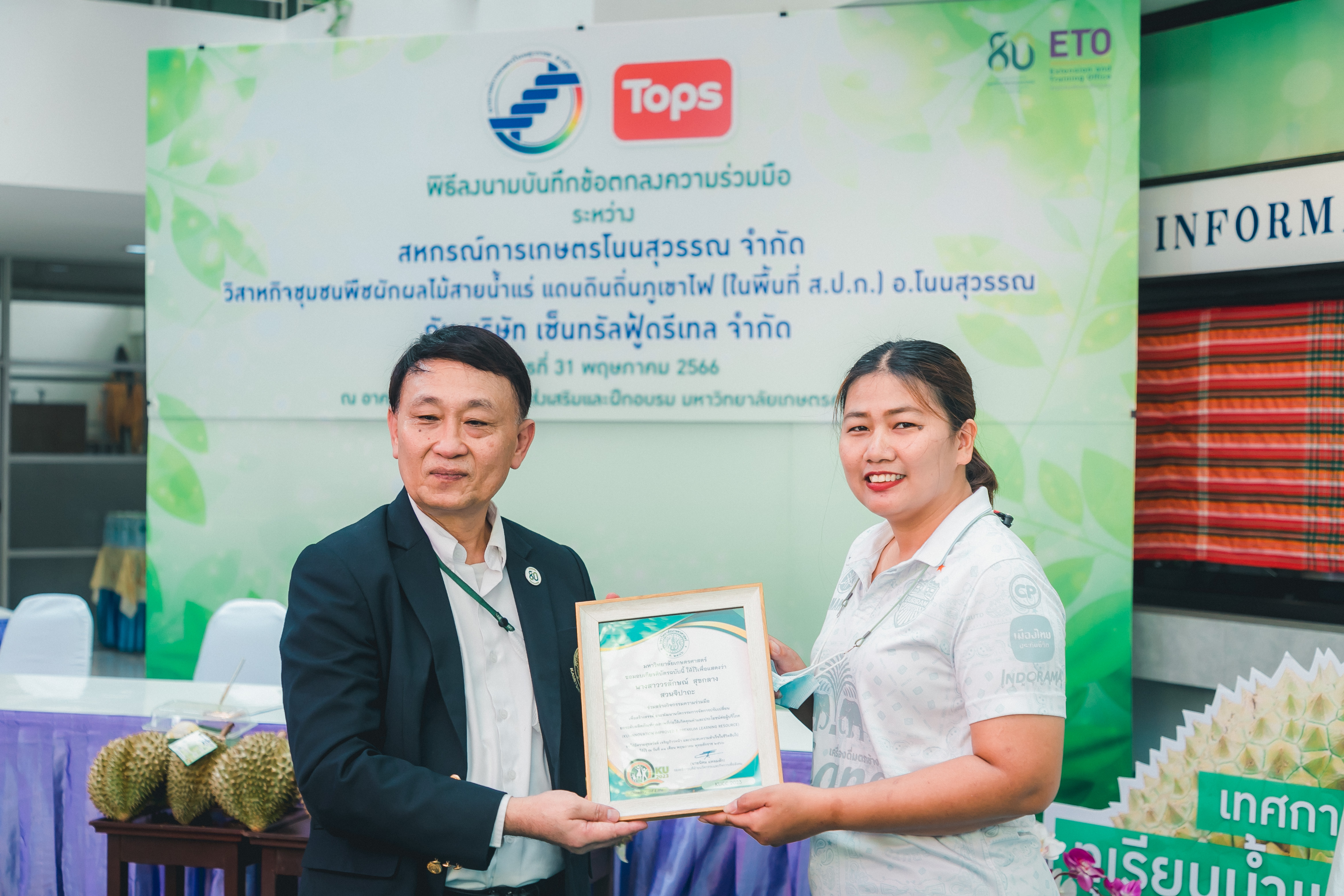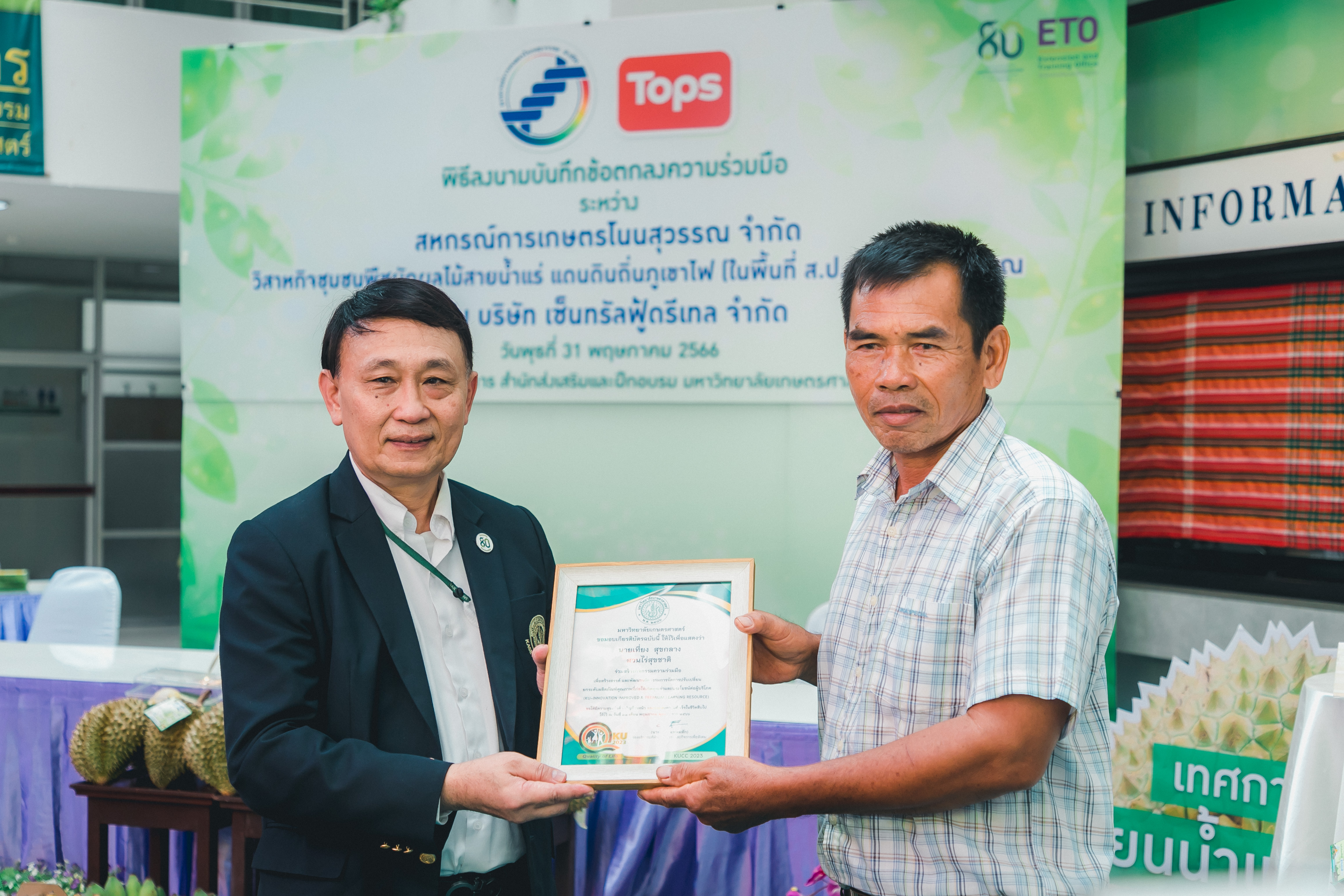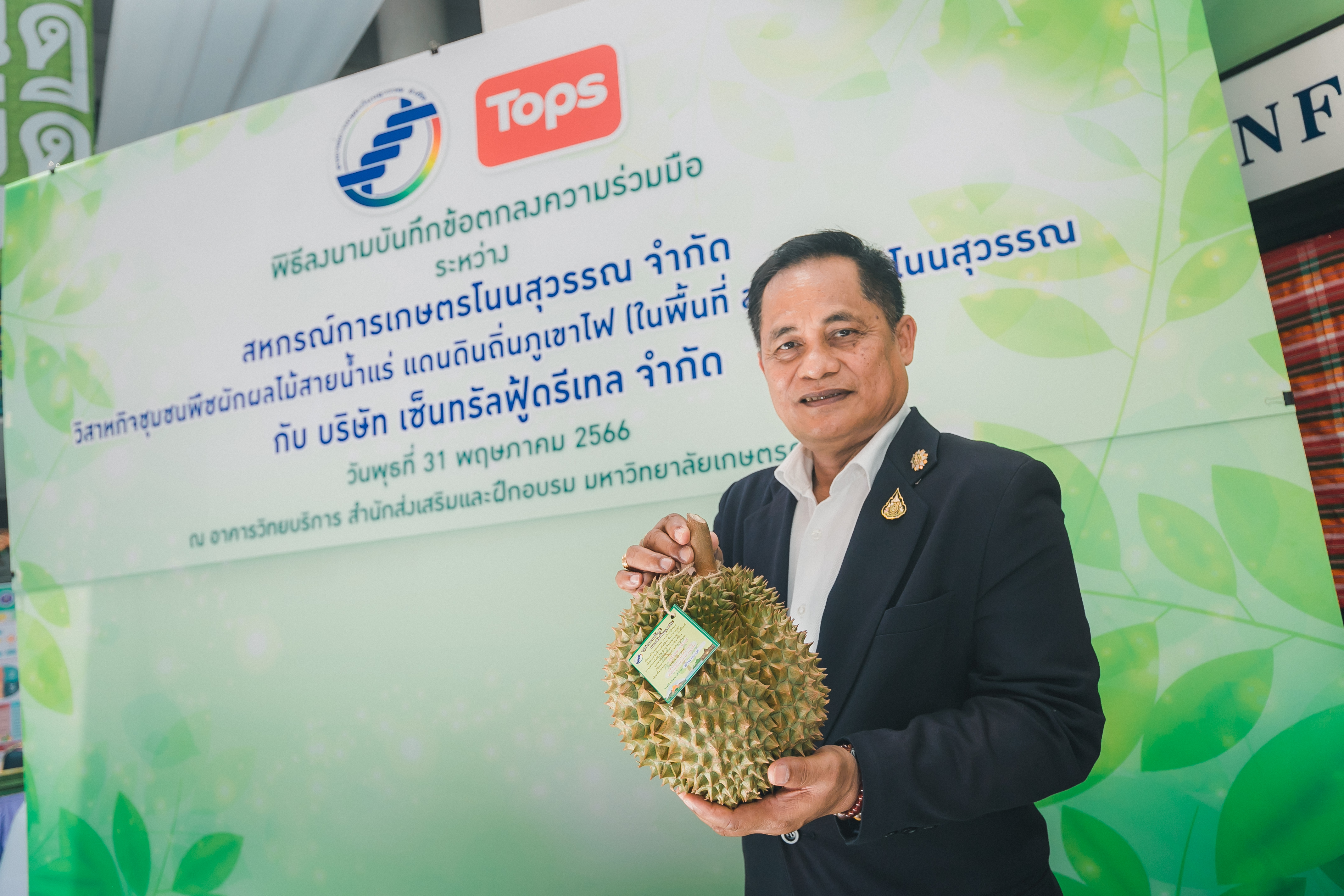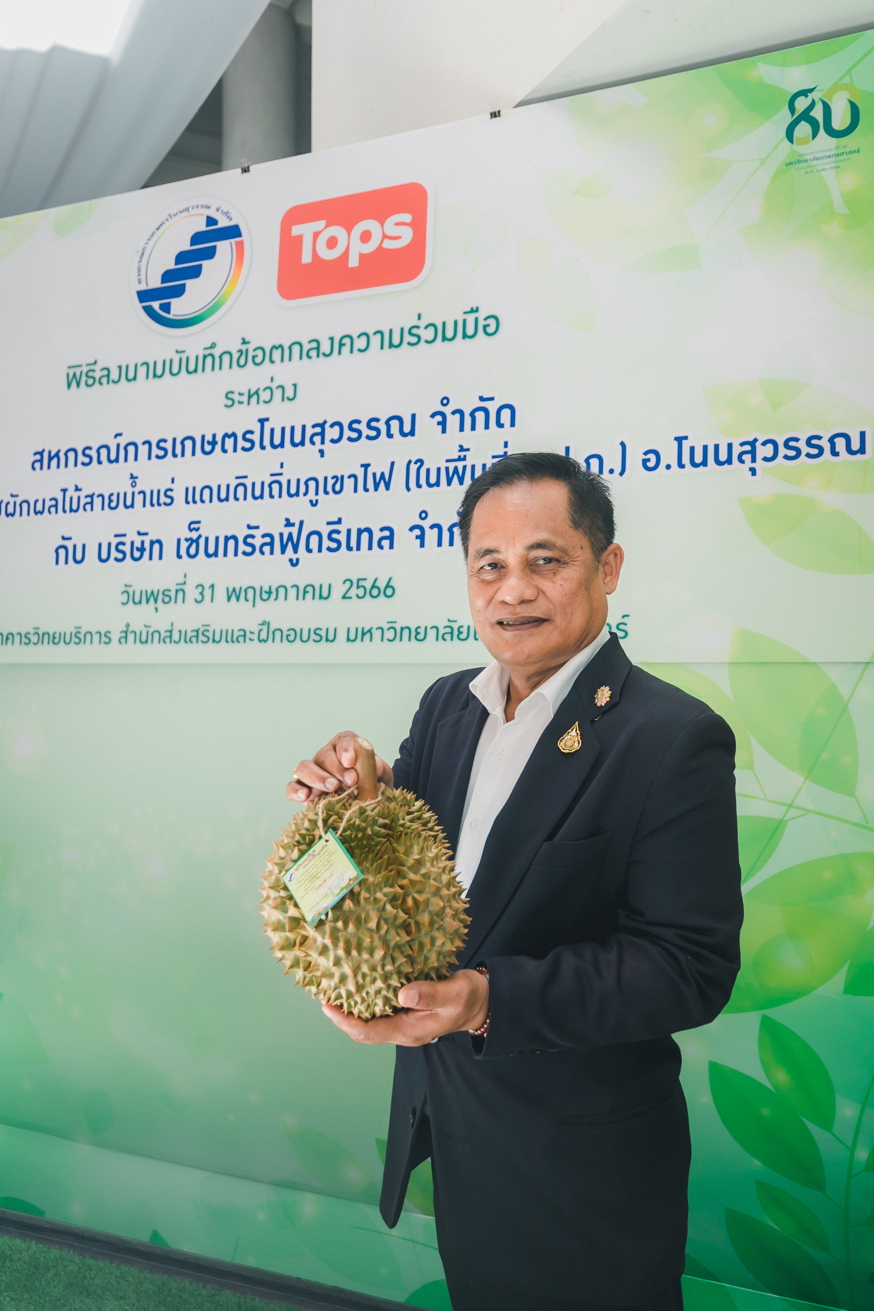 วันที่ 31 พฤษภาคม 2566 ดร.วิณะโรจน์ ทรัพย์ส่งสุข เลขาธิการ ส.ป.ก. มอบหมายให้นายเอกพงศ์ น้อยสร้าง รองเลขาธิการ ส.ป.ก. พร้อมด้วยนายประเสริฐ กาญจนเกียรติกุล ปฏิรูปที่ดินจังหวัดบุรีรัมย์ ร่วมเป็นเกียรติและเป็นสักขีพยานในพิธีลงนามบันทึกข้อตกลงความร่วมมือโครงการยกระดับนวัตกรรมผลิตภัณฑ์ผลไม้ 2023 กิจกรรม KU พลิกฟื้นเศรษฐกิจฐานนวัตกรรม 2023 ภาคตะวันออกเฉียงเหนือ “ทุเรียนน้ำแร่” ระหว่าง สหกรณ์การเกษตรโนนสุวรรณ จำกัด, วิสาหกิจชุมชนกลุ่มพืชผักผลไม้สายน้ำแร่ แดนดินถิ่นภูเขาไฟ ในเขตปฏิรูปที่ดิน อ.โนนสุวรรณ และบริษัท เซ็นทรัล ฟู้ด รีเทล จำกัด โดยมีภาคีเครือข่ายร่วมจัดกิจกรรมพร้อมทั้งเป็นสักขีพยานในพิธีลงนามบันทึกข้อตกลงความร่วมมือดังกล่าว ได้แก่ สำนักงานปฏิรูปที่ดินเพื่อเกษตรกรรม โดยสำนักงานการปฏิรูปที่ดินจังหวัดบุรีรัมย์, มหาวิทยาลัยเกษตรศาสตร์, สำนักงานสหกรณ์จังหวัดบุรีรัมย์, สหกรณ์การเกษตรโนนสุวรรณ จำกัด, วิสาหกิจชุมชน พืชผักผลไม้ สายน้ำแร่ แดนดินถิ่นภูเขาไฟในพื้นที่ ส.ป.ก. อำเภอโนนสุวรรณ จังหวัดบุรีรัมย์ และบริษัท เซ็นทรัล ฟู้ด รีเทล จำกัด ซึ่งกิจกรรมจัดขึ้นระหว่างวันที่ 30-31 พฤษภาคม 2566 ณ สำนักส่งเสริมและฝึกอบรม อาคารวิทยบริการ มหาวิทยาลัยเกษตรศาสตร์