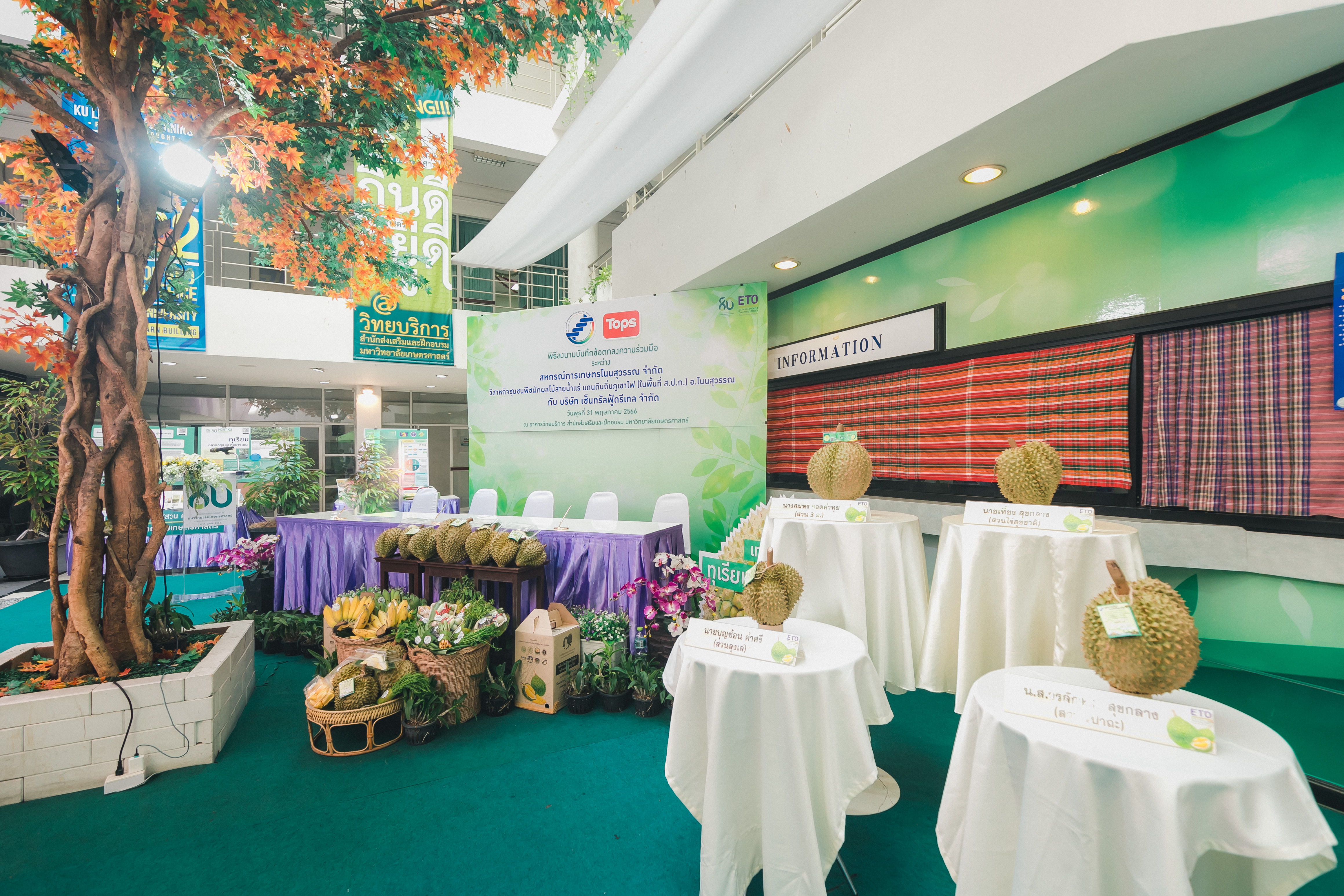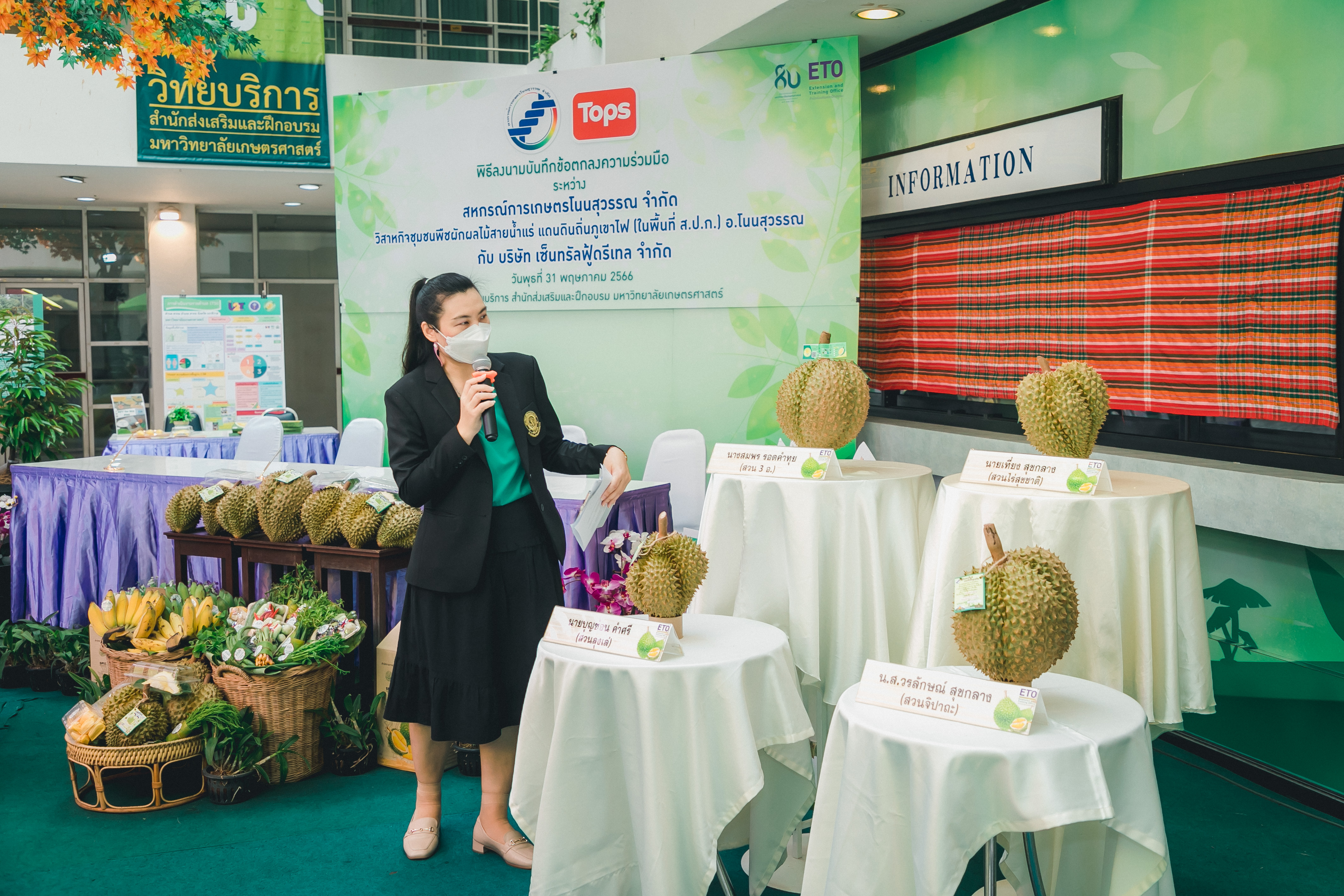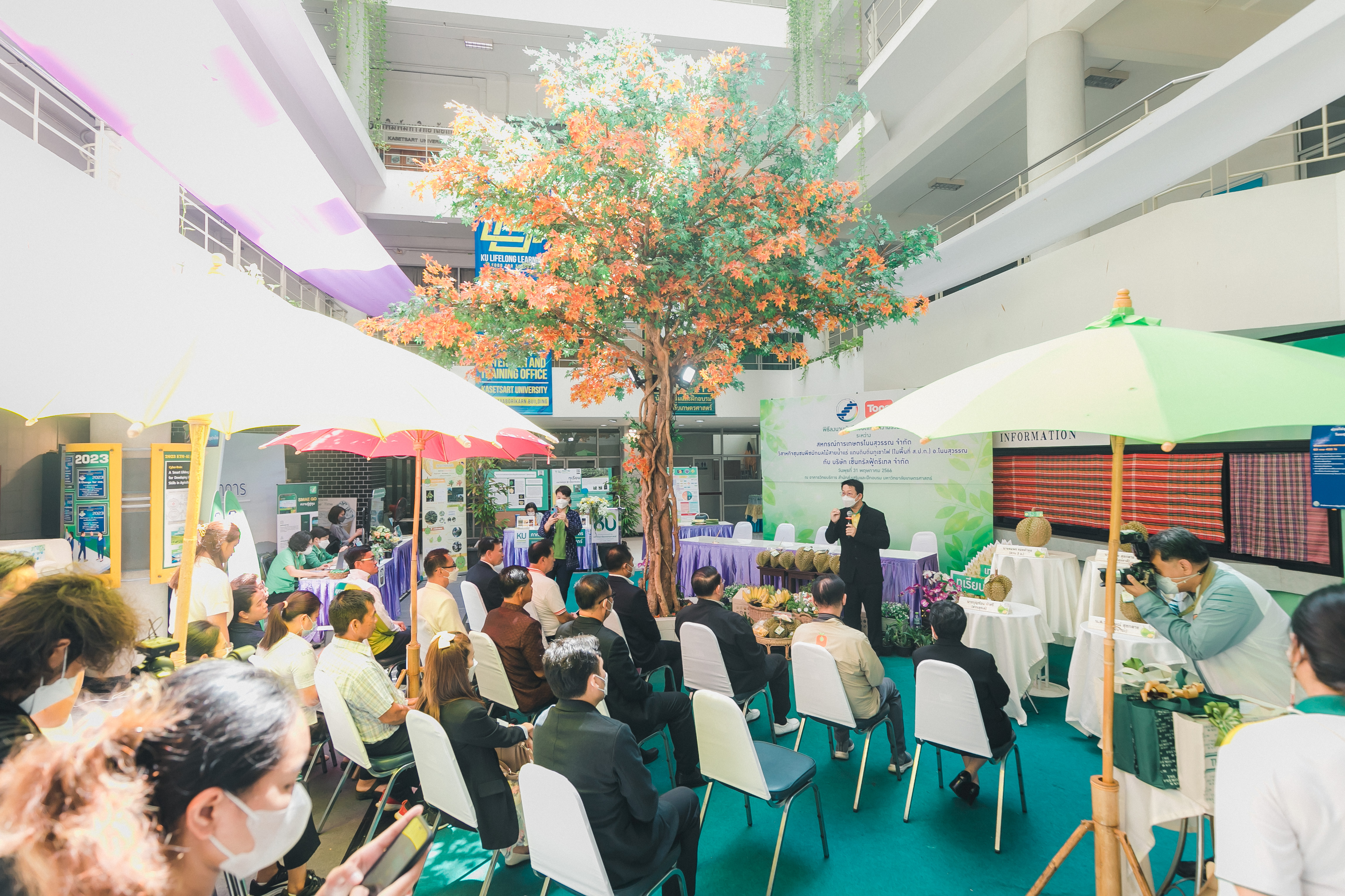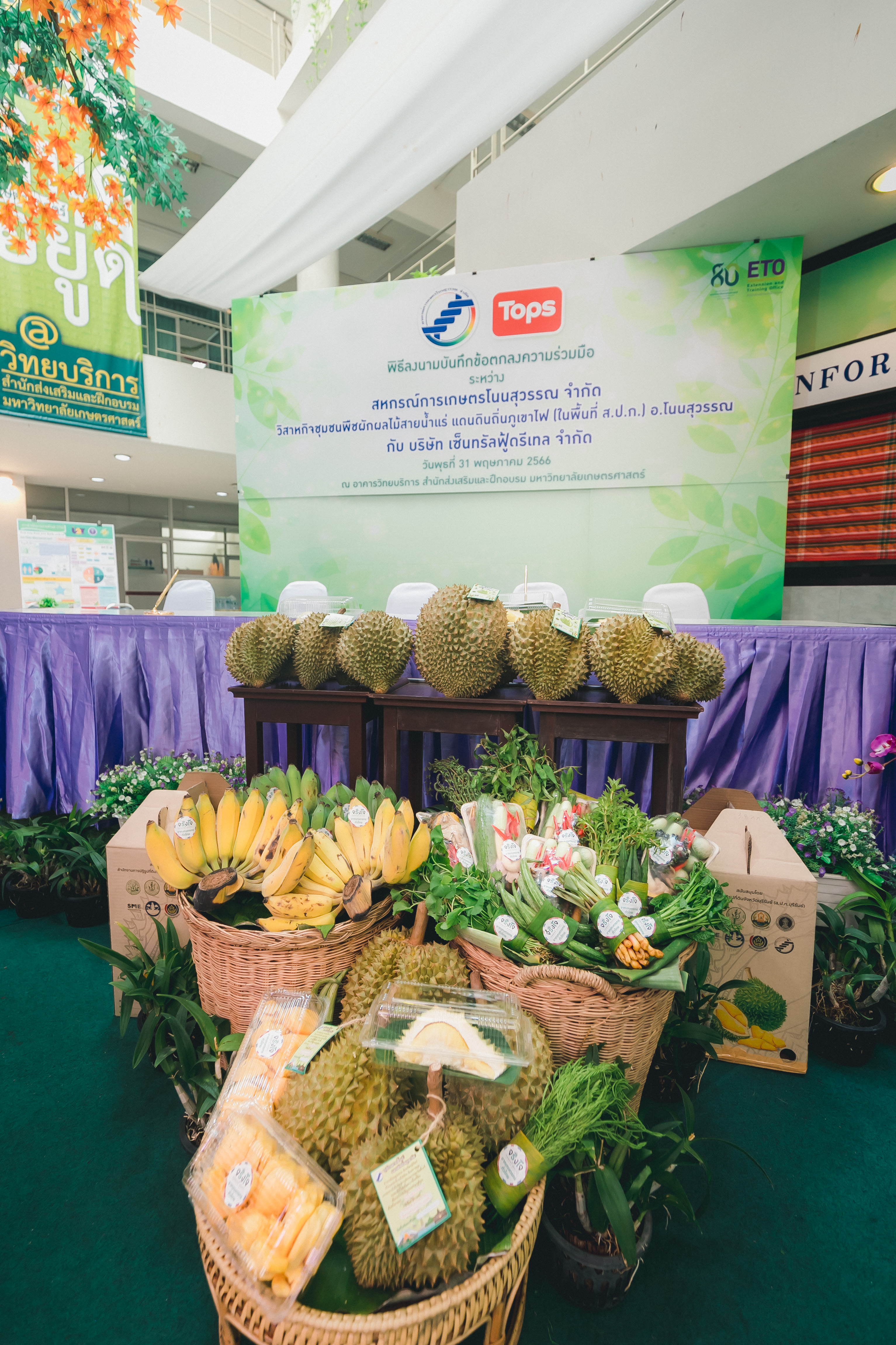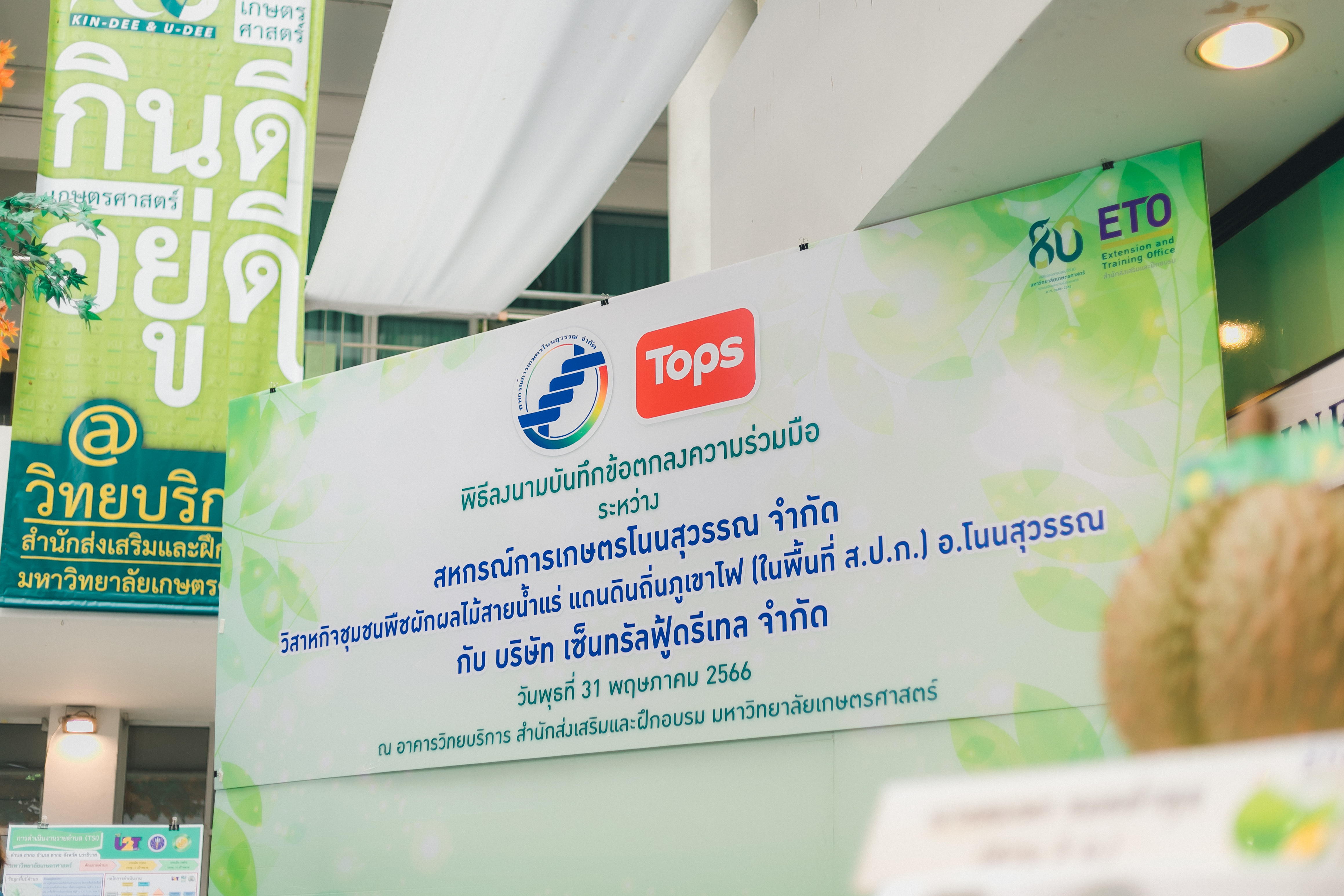 วันที่ 31 พฤษภาคม 2566 ดร.วิณะโรจน์ ทรัพย์ส่งสุข เลขาธิการ ส.ป.ก. มอบหมายให้นายเอกพงศ์ น้อยสร้าง รองเลขาธิการ ส.ป.ก. พร้อมด้วยนายประเสริฐ กาญจนเกียรติกุล ปฏิรูปที่ดินจังหวัดบุรีรัมย์ ร่วมเป็นเกียรติและเป็นสักขีพยานในพิธีลงนามบันทึกข้อตกลงความร่วมมือโครงการยกระดับนวัตกรรมผลิตภัณฑ์ผลไม้ 2023 กิจกรรม KU พลิกฟื้นเศรษฐกิจฐานนวัตกรรม 2023 ภาคตะวันออกเฉียงเหนือ “ทุเรียนน้ำแร่” ระหว่าง สหกรณ์การเกษตรโนนสุวรรณ จำกัด, วิสาหกิจชุมชนกลุ่มพืชผักผลไม้สายน้ำแร่ แดนดินถิ่นภูเขาไฟ ในเขตปฏิรูปที่ดิน อ.โนนสุวรรณ และบริษัท เซ็นทรัล ฟู้ด รีเทล จำกัด โดยมีภาคีเครือข่ายร่วมจัดกิจกรรมพร้อมทั้งเป็นสักขีพยานในพิธีลงนามบันทึกข้อตกลงความร่วมมือดังกล่าว ได้แก่ สำนักงานปฏิรูปที่ดินเพื่อเกษตรกรรม โดยสำนักงานการปฏิรูปที่ดินจังหวัดบุรีรัมย์, มหาวิทยาลัยเกษตรศาสตร์, สำนักงานสหกรณ์จังหวัดบุรีรัมย์, สหกรณ์การเกษตรโนนสุวรรณ จำกัด, วิสาหกิจชุมชน พืชผักผลไม้ สายน้ำแร่ แดนดินถิ่นภูเขาไฟในพื้นที่ ส.ป.ก. อำเภอโนนสุวรรณ จังหวัดบุรีรัมย์ และบริษัท เซ็นทรัล ฟู้ด รีเทล จำกัด ซึ่งกิจกรรมจัดขึ้นระหว่างวันที่ 30-31 พฤษภาคม 2566 ณ สำนักส่งเสริมและฝึกอบรม อาคารวิทยบริการ มหาวิทยาลัยเกษตรศาสตร์