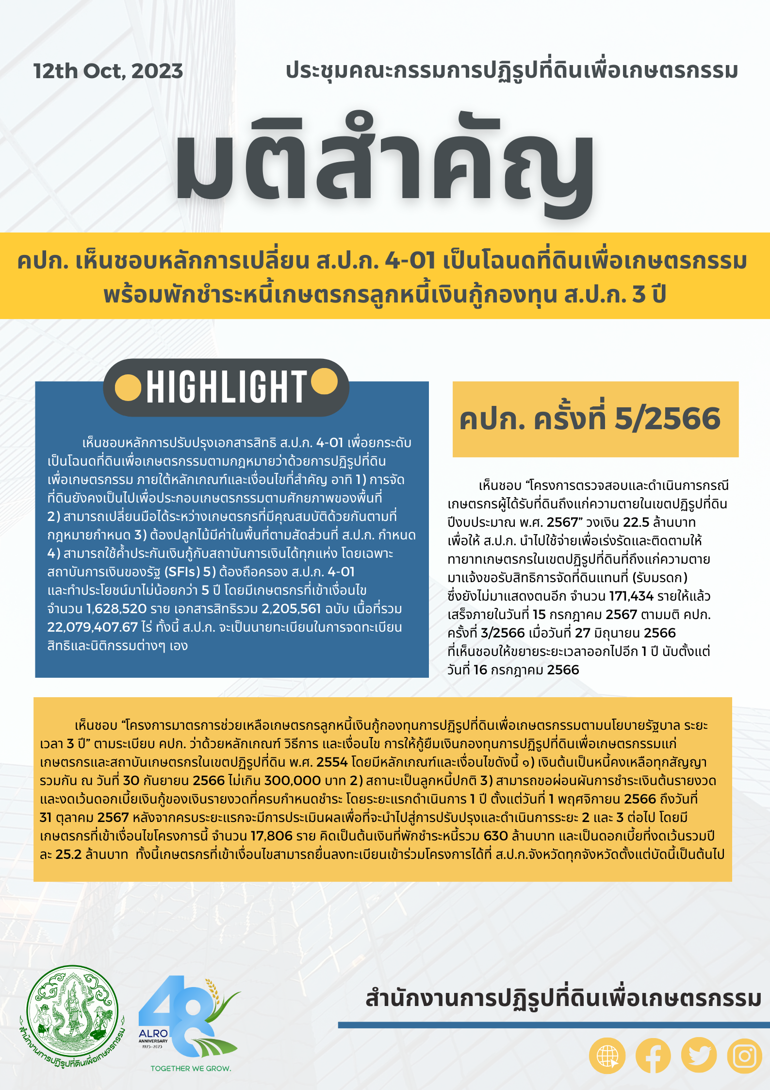 3. เห็นชอบ “โครงการมาตรการช่วยเหลือเกษตรกรลูกหนี้เงินกู้กองทุนการปฏิรูปที่ดินเพื่อเกษตรกรรมตามนโยบายรัฐบาล ระยะเวลา 3 ปี” ตามระเบียบ คปก. ว่าด้วยหลักเกณฑ์ วิธีการ และเงื่อนไข การให้กู้ยืมเงินกองทุนการปฏิรูปที่ดินเพื่อเกษตรกรรมแก่เกษตรกรและสถาบันเกษตรกรในเขตปฏิรูปที่ดิน พ.ศ. 2554 โดยมีหลักเกณฑ์และเงื่อนไขดังนี้ 1) เงินต้นเป็นหนี้คงเหลือทุกสัญญารวมกัน ณ วันที่ 30 กันยายน 2566 ไม่เกิน 300,000 บาท 2) สถานะเป็นลูกหนี้ปกติ 3) สามารถขอผ่อนผันการชำระเงินต้นรายงวดและงดเว้นดอกเบี้ยเงินกู้ของเงินรายงวดที่ครบกำหนดชำระ โดยระยะแรกดำเนินการ 1 ปี ตั้งแต่วันที่ 1 พฤศจิกายน 2566 ถึงวันที่ 31 ตุลาคม 2567 หลังจากครบระยะแรกจะมีการประเมินผลเพื่อที่จะนำไปสู่การปรับปรุงและดำเนินการระยะ 2 และ 3 ต่อไป โดยมีเกษตรกรที่เข้าเงื่อนไขโครงการนี้ จำนวน 17,806 ราย คิดเป็นต้นเงินที่พักชำระหนี้รวม 630 ล้านบาท และเป็นดอกเบี้ยที่งดเว้นรวมปีละ 25.2 ล้านบาท ทั้งนี้เกษตรกรที่เข้าเงื่อนไขสามารถยื่นลงทะเบียนเข้าร่วมโครงการได้ที่ ส.ป.ก.จังหวัดทุกจังหวัดตั้งแต่บัดนี้เป็นต้นไป