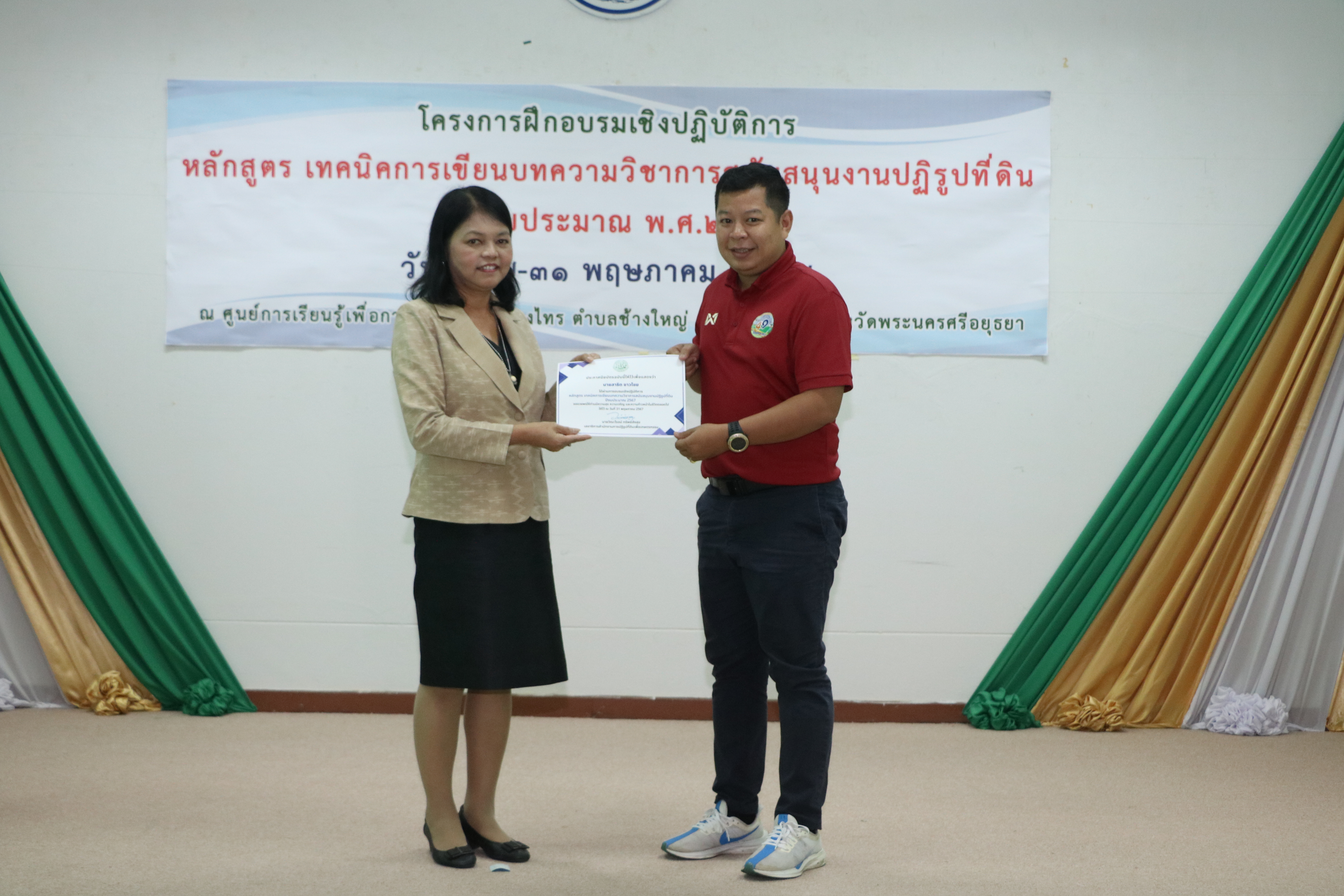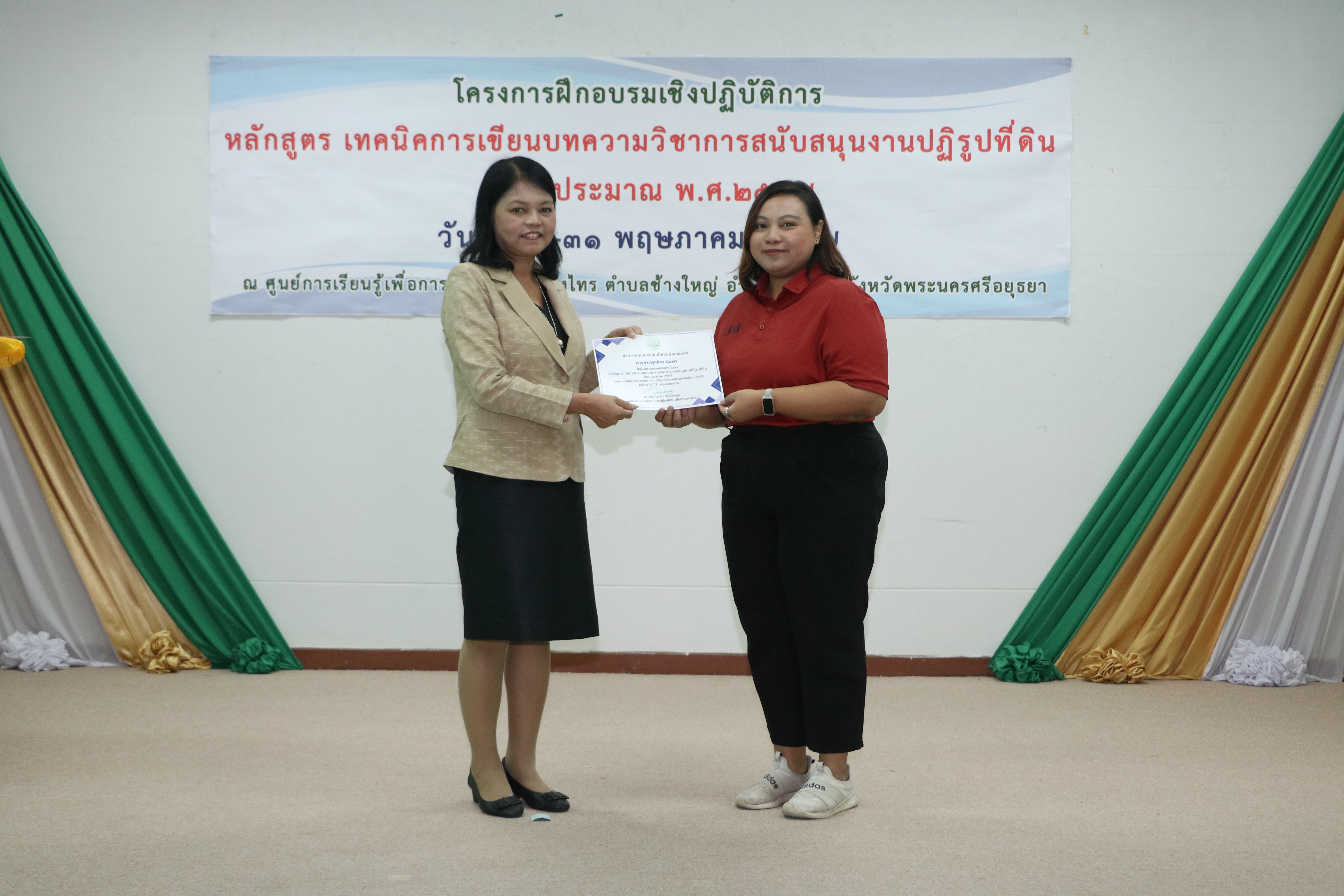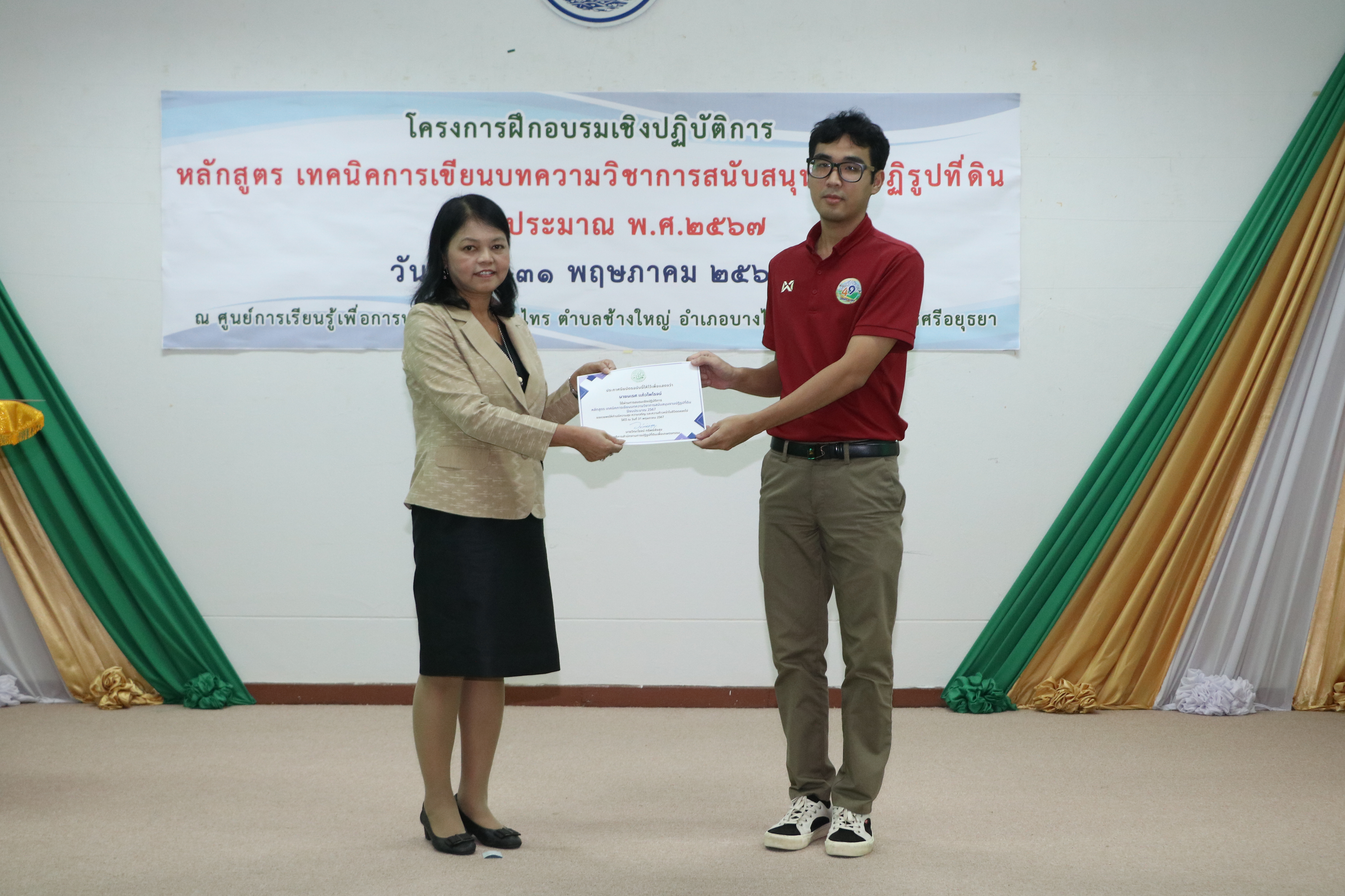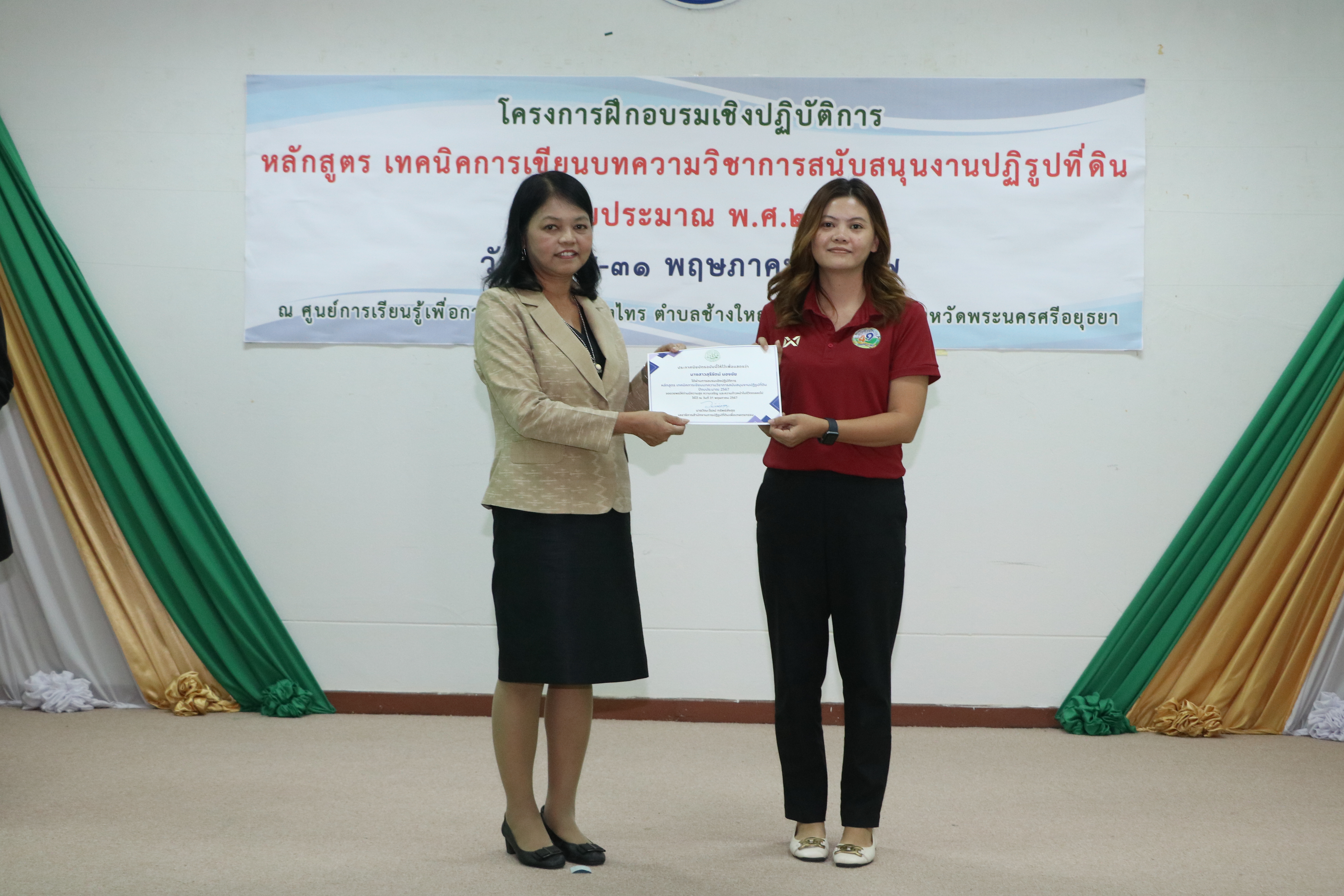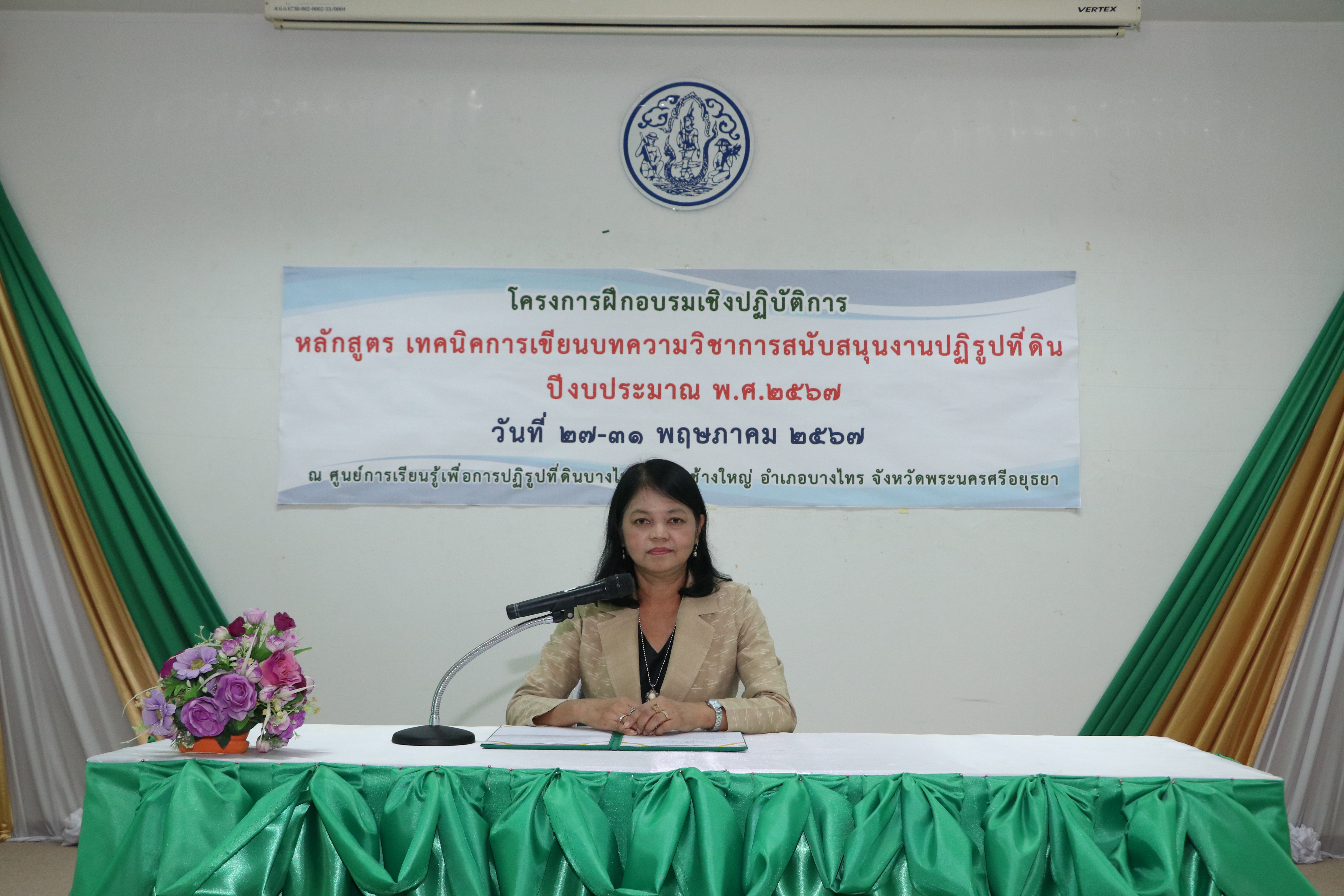 วันศุกร์ที่ 31 พฤษภาคม 2567 เวลา 15.00 น. นายวิณะโรจน์ ทรัพย์ส่งสุข เลขาธิการสำนักงานการปฏิรูปที่ดินเพื่อเกษตรกรรม (ส.ป.ก.) มอบหมายให้ นางสาวฐิภาพรรณ พึ่งไพฑูรย์ ผู้ตรวจราชการกรม เป็นประธานปิดโครงการอบรมเชิงปฏิบัติการ หลักสูตร “เทคนิคการเขียนบทความวิชาการสนับสนุนงานปฏิรูปที่ดิน ปีงบประมาณ พ.ศ. 2567” ณ ศูนย์การเรียนรู้เพื่อการปฏิรูปที่ดินบางไทร ตำบลช้างใหญ่ อำเภอบางไทร จังหวัดพระนครศรีอยุธยา ในการนี้ ประธานได้ให้คำแนะนำและให้กำลังใจแก่ผู้เข้าอบรมในการนำเสนอบทความวิชาการผ่านเวทีการประชุมวิชาการและรับผลการประเมินผล