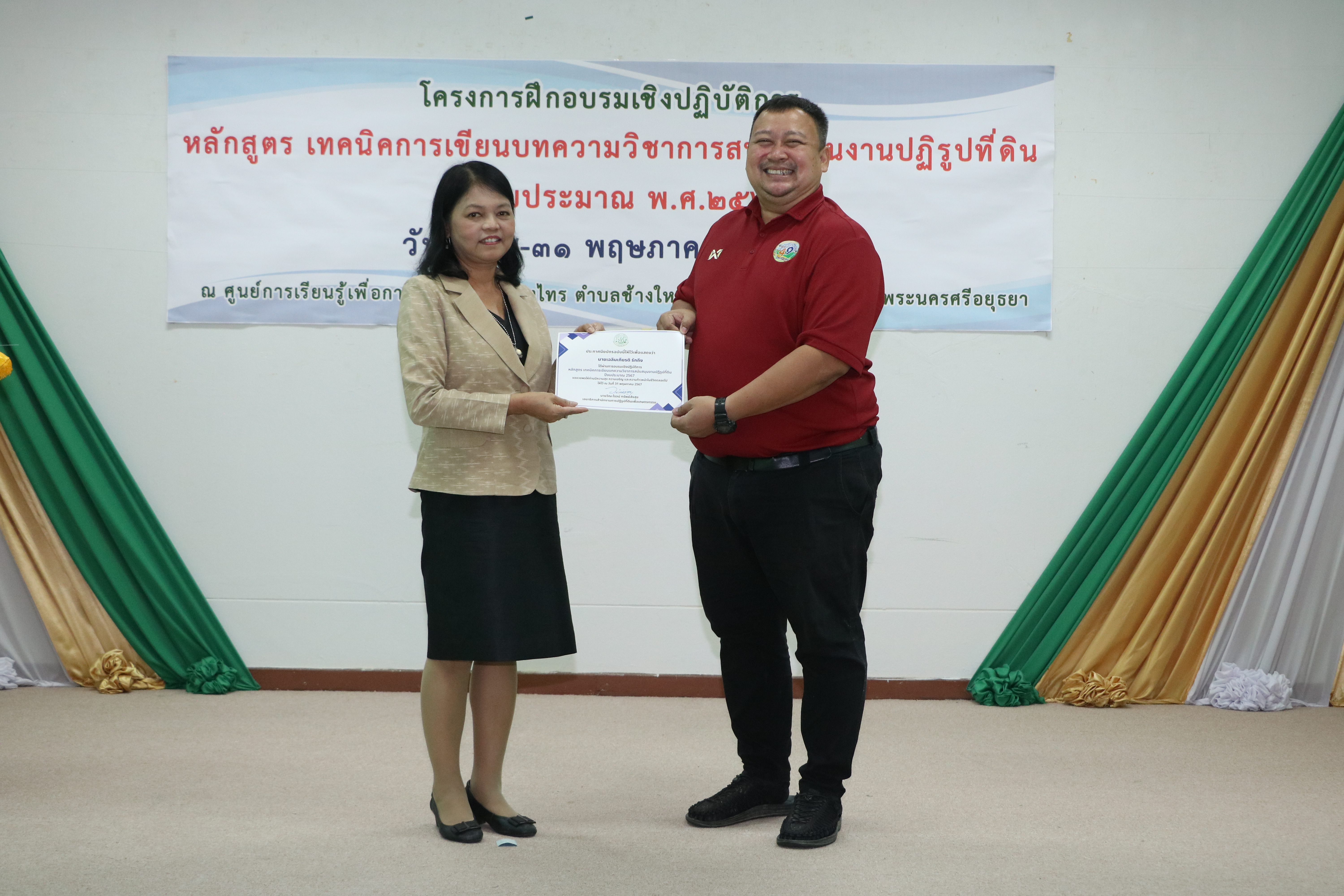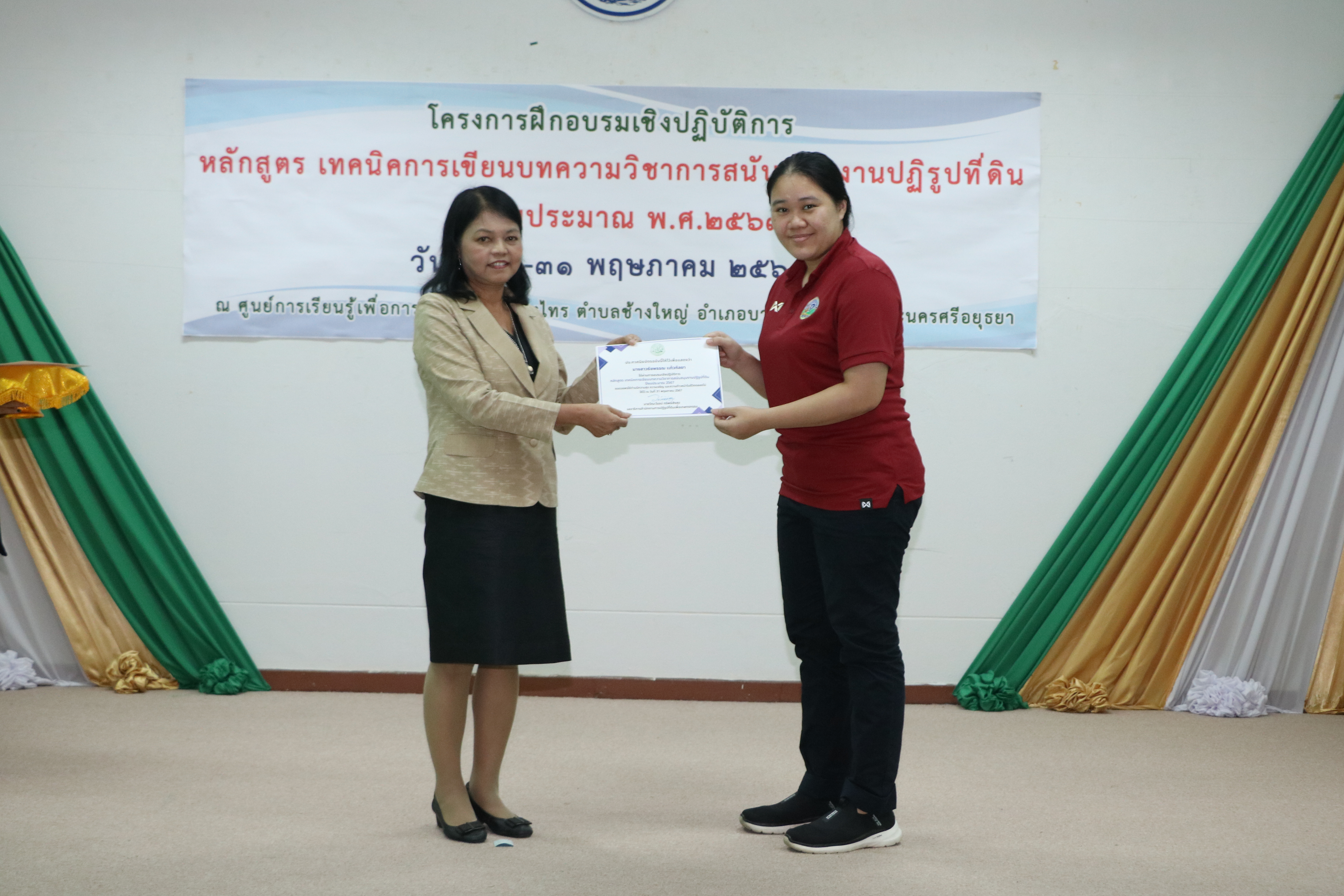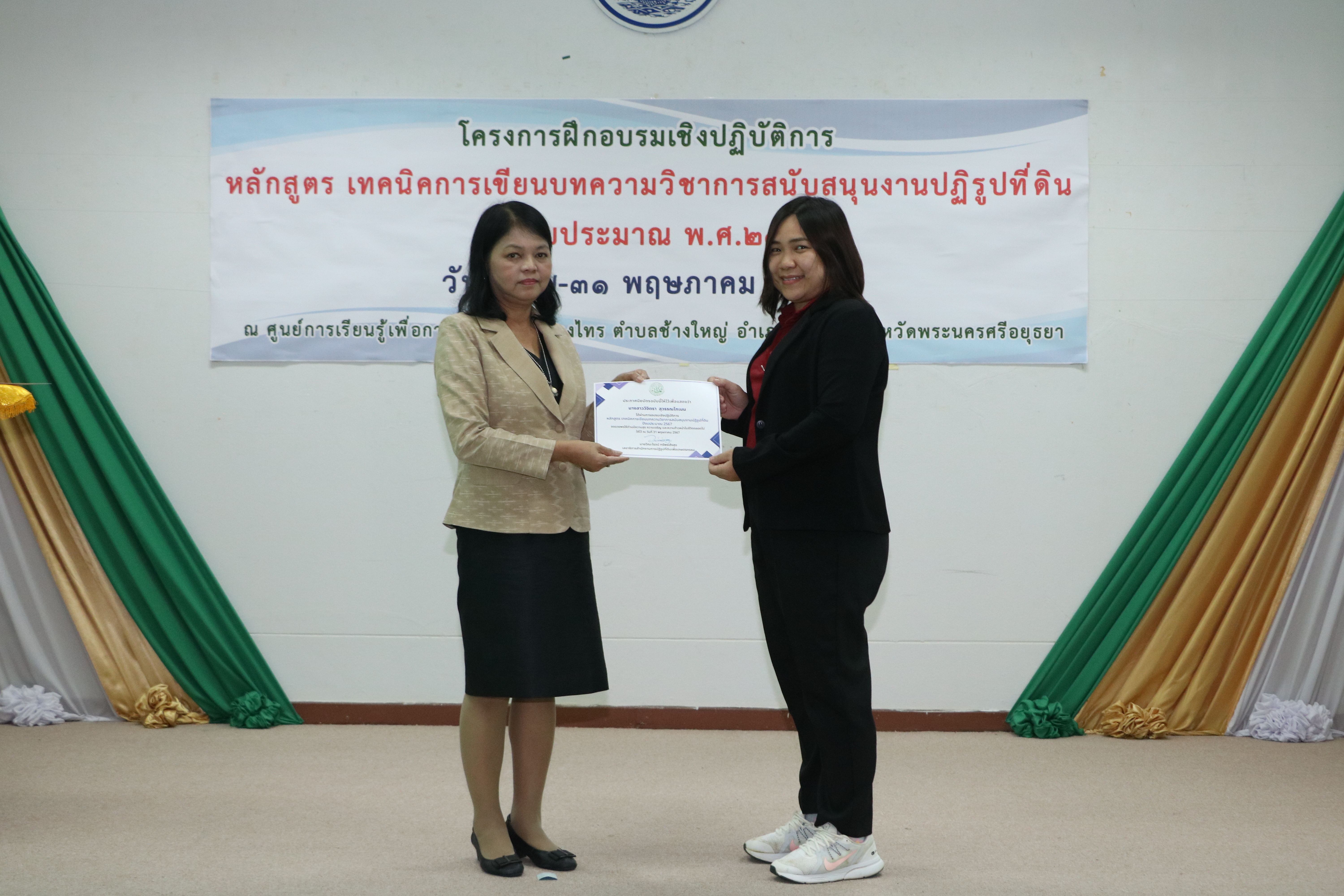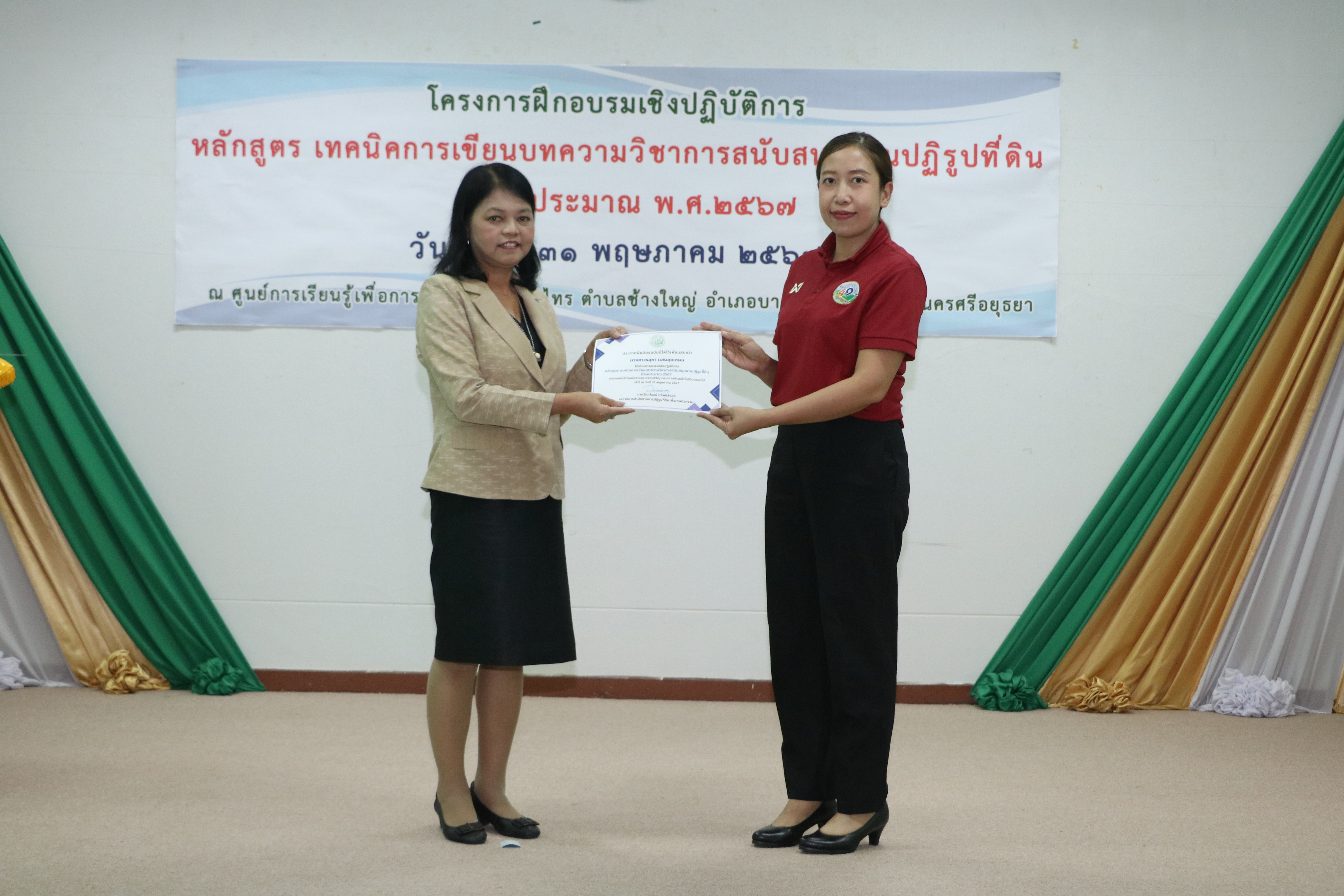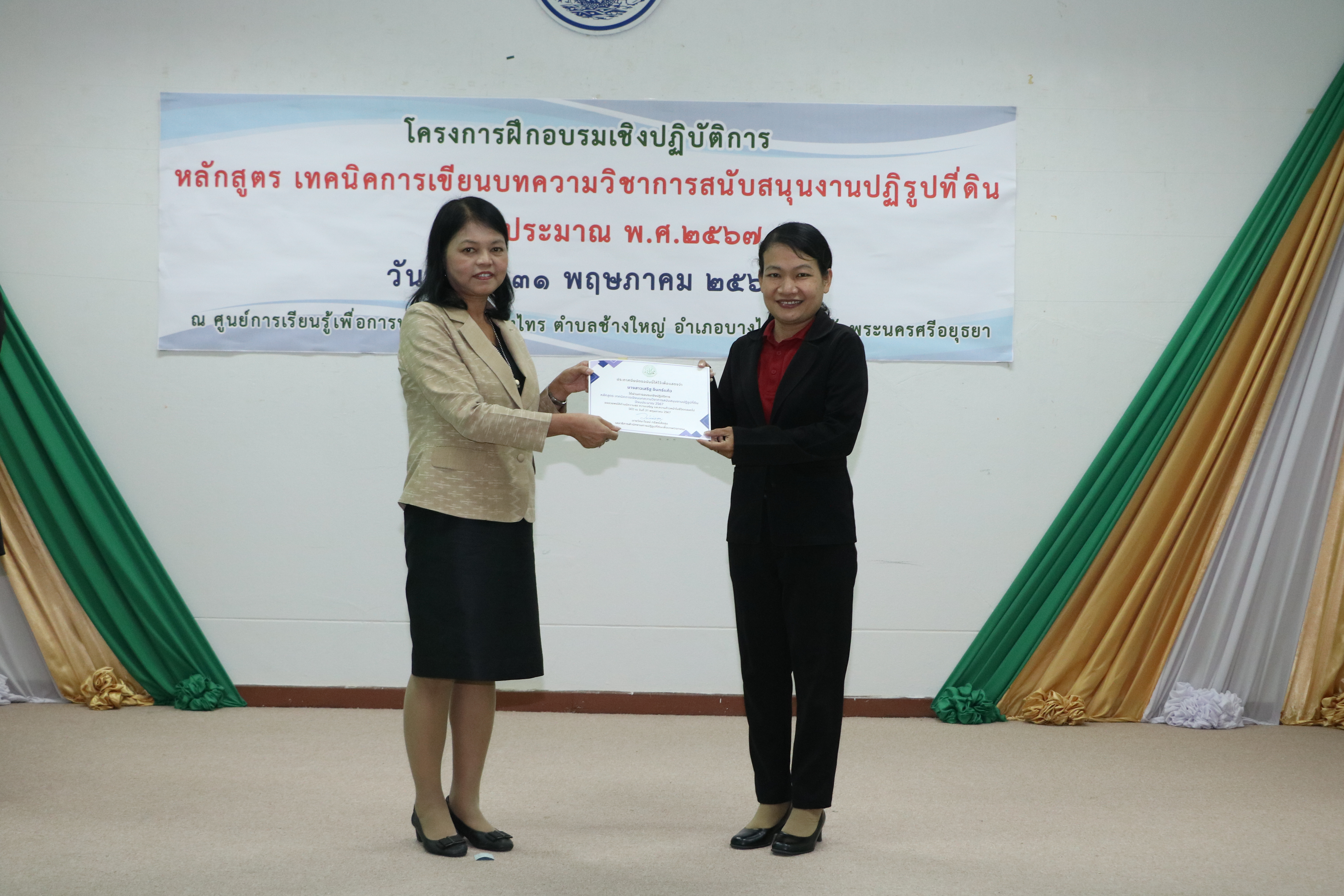 วันศุกร์ที่ 31 พฤษภาคม 2567 เวลา 15.00 น. นายวิณะโรจน์ ทรัพย์ส่งสุข เลขาธิการสำนักงานการปฏิรูปที่ดินเพื่อเกษตรกรรม (ส.ป.ก.) มอบหมายให้ นางสาวฐิภาพรรณ พึ่งไพฑูรย์ ผู้ตรวจราชการกรม เป็นประธานปิดโครงการอบรมเชิงปฏิบัติการ หลักสูตร “เทคนิคการเขียนบทความวิชาการสนับสนุนงานปฏิรูปที่ดิน ปีงบประมาณ พ.ศ. 2567” ณ ศูนย์การเรียนรู้เพื่อการปฏิรูปที่ดินบางไทร ตำบลช้างใหญ่ อำเภอบางไทร จังหวัดพระนครศรีอยุธยา ในการนี้ ประธานได้ให้คำแนะนำและให้กำลังใจแก่ผู้เข้าอบรมในการนำเสนอบทความวิชาการผ่านเวทีการประชุมวิชาการและรับผลการประเมินผล