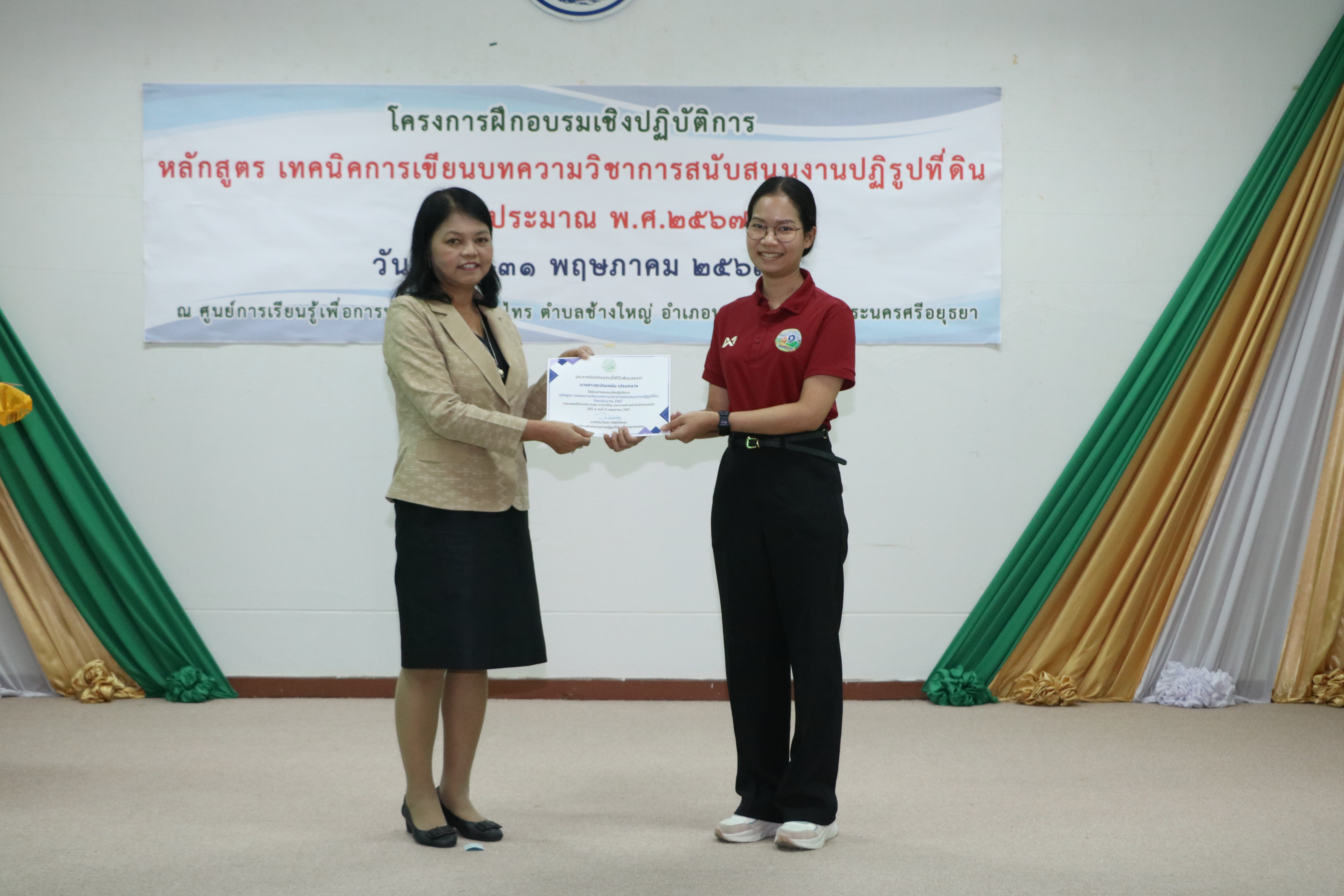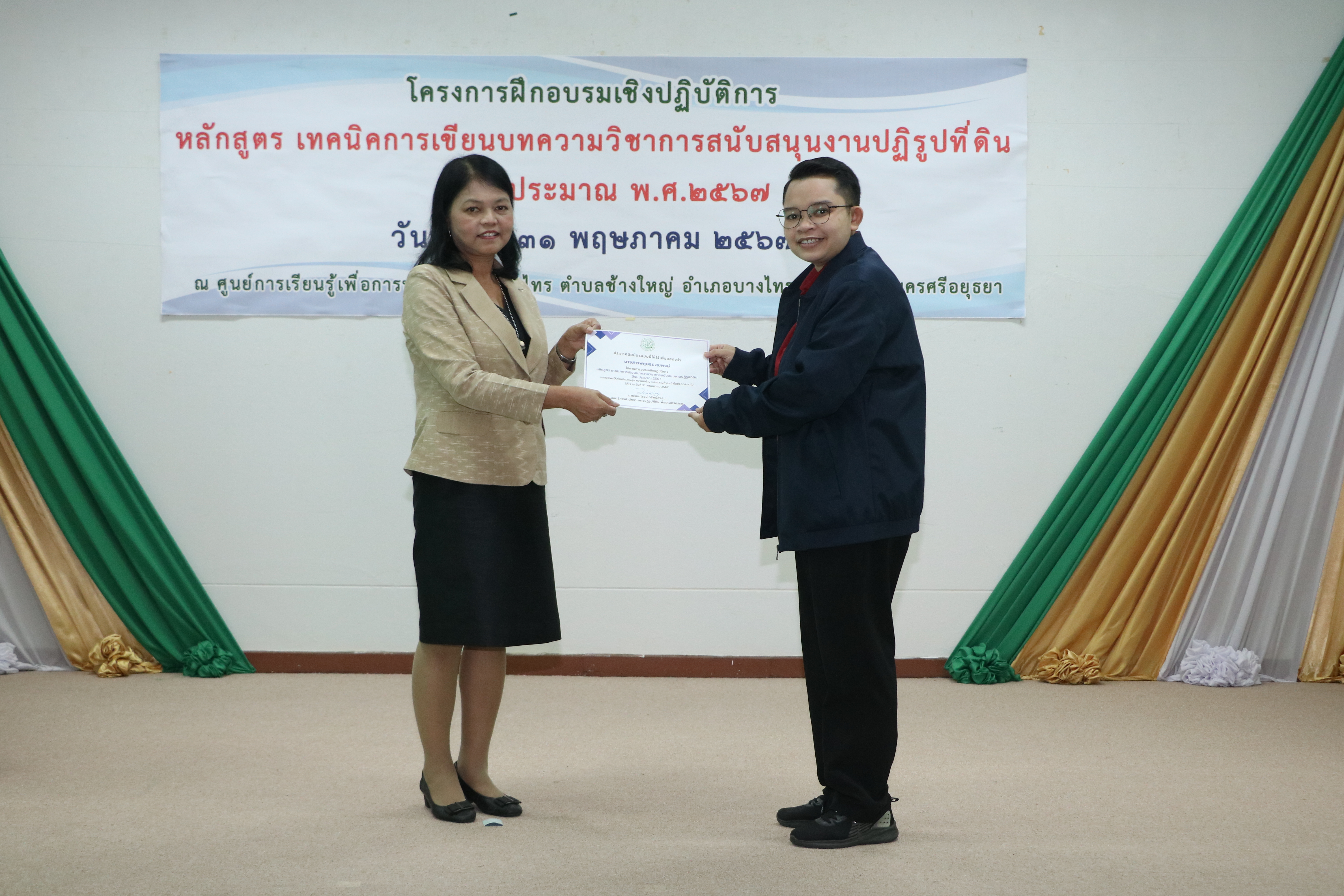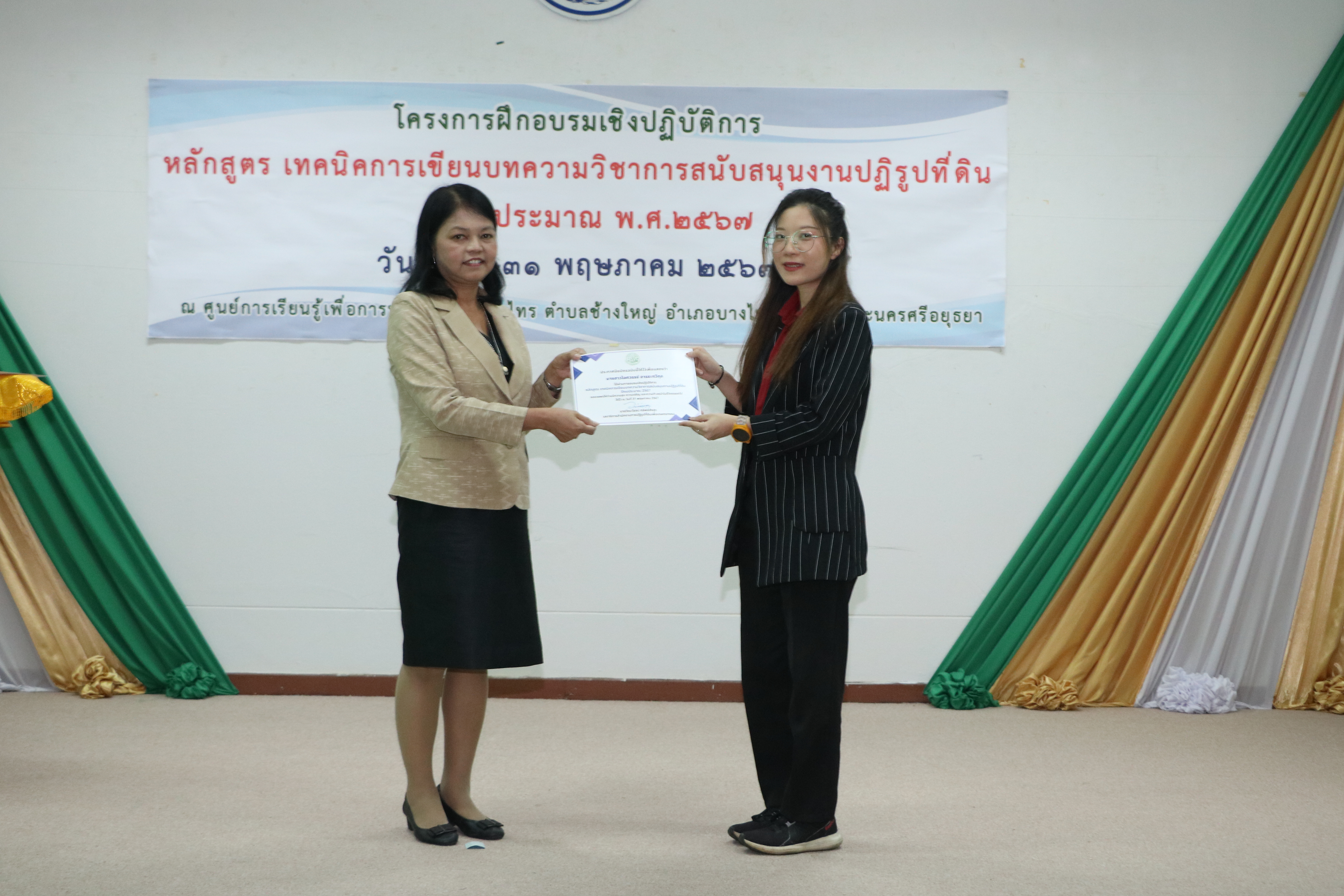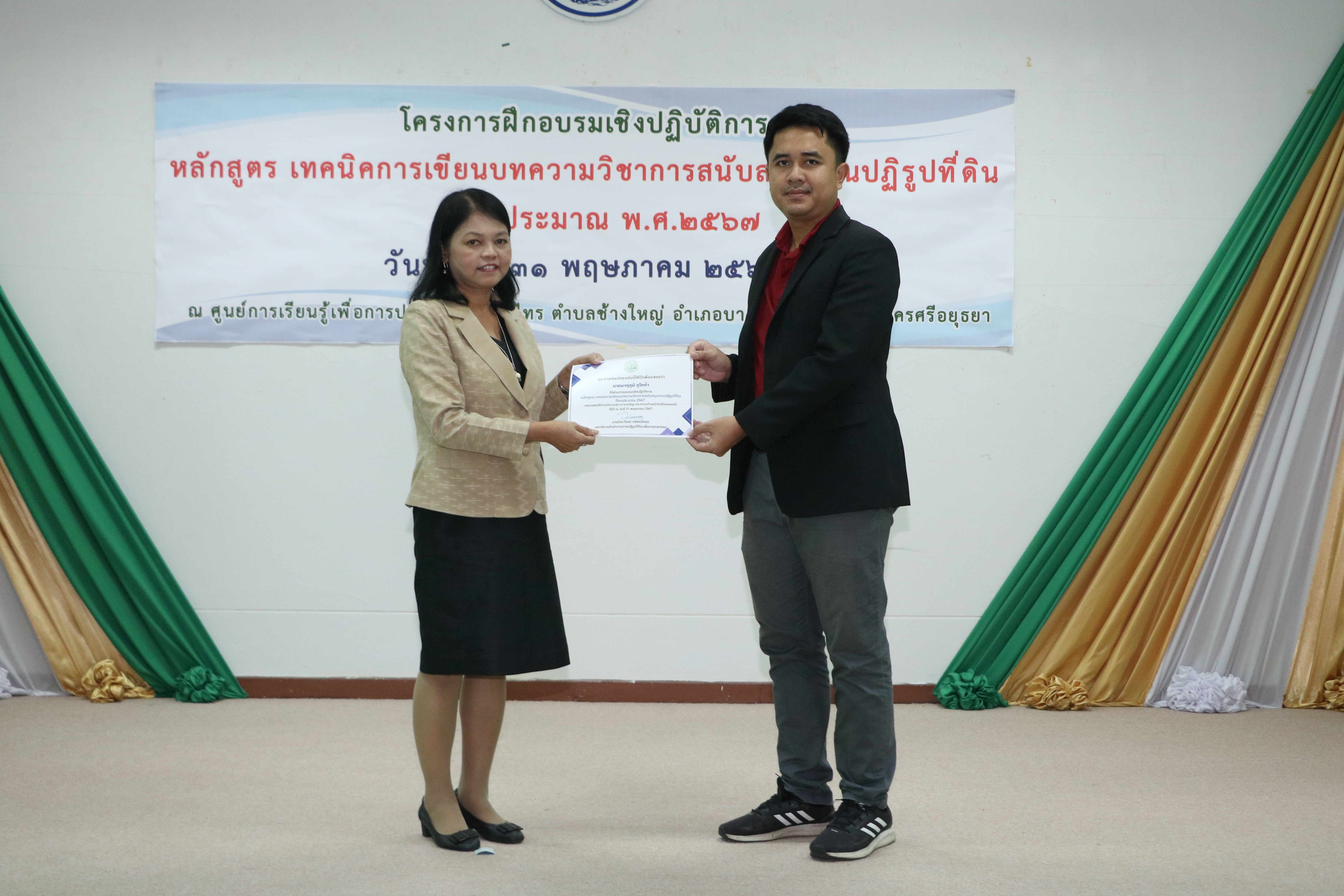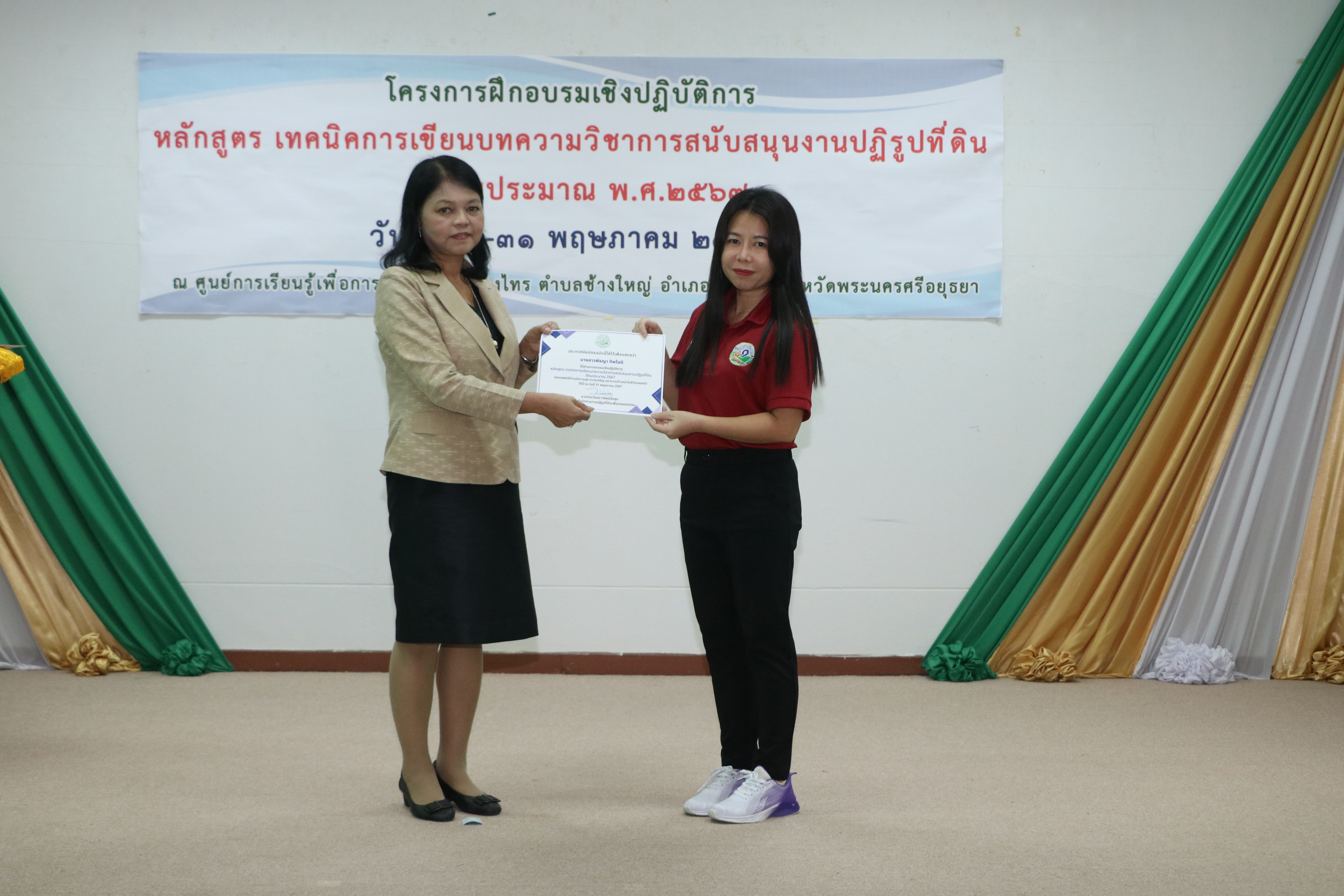 วันศุกร์ที่ 31 พฤษภาคม 2567 เวลา 15.00 น. นายวิณะโรจน์ ทรัพย์ส่งสุข เลขาธิการสำนักงานการปฏิรูปที่ดินเพื่อเกษตรกรรม (ส.ป.ก.) มอบหมายให้ นางสาวฐิภาพรรณ พึ่งไพฑูรย์ ผู้ตรวจราชการกรม เป็นประธานปิดโครงการอบรมเชิงปฏิบัติการ หลักสูตร “เทคนิคการเขียนบทความวิชาการสนับสนุนงานปฏิรูปที่ดิน ปีงบประมาณ พ.ศ. 2567” ณ ศูนย์การเรียนรู้เพื่อการปฏิรูปที่ดินบางไทร ตำบลช้างใหญ่ อำเภอบางไทร จังหวัดพระนครศรีอยุธยา ในการนี้ ประธานได้ให้คำแนะนำและให้กำลังใจแก่ผู้เข้าอบรมในการนำเสนอบทความวิชาการผ่านเวทีการประชุมวิชาการและรับผลการประเมินผล