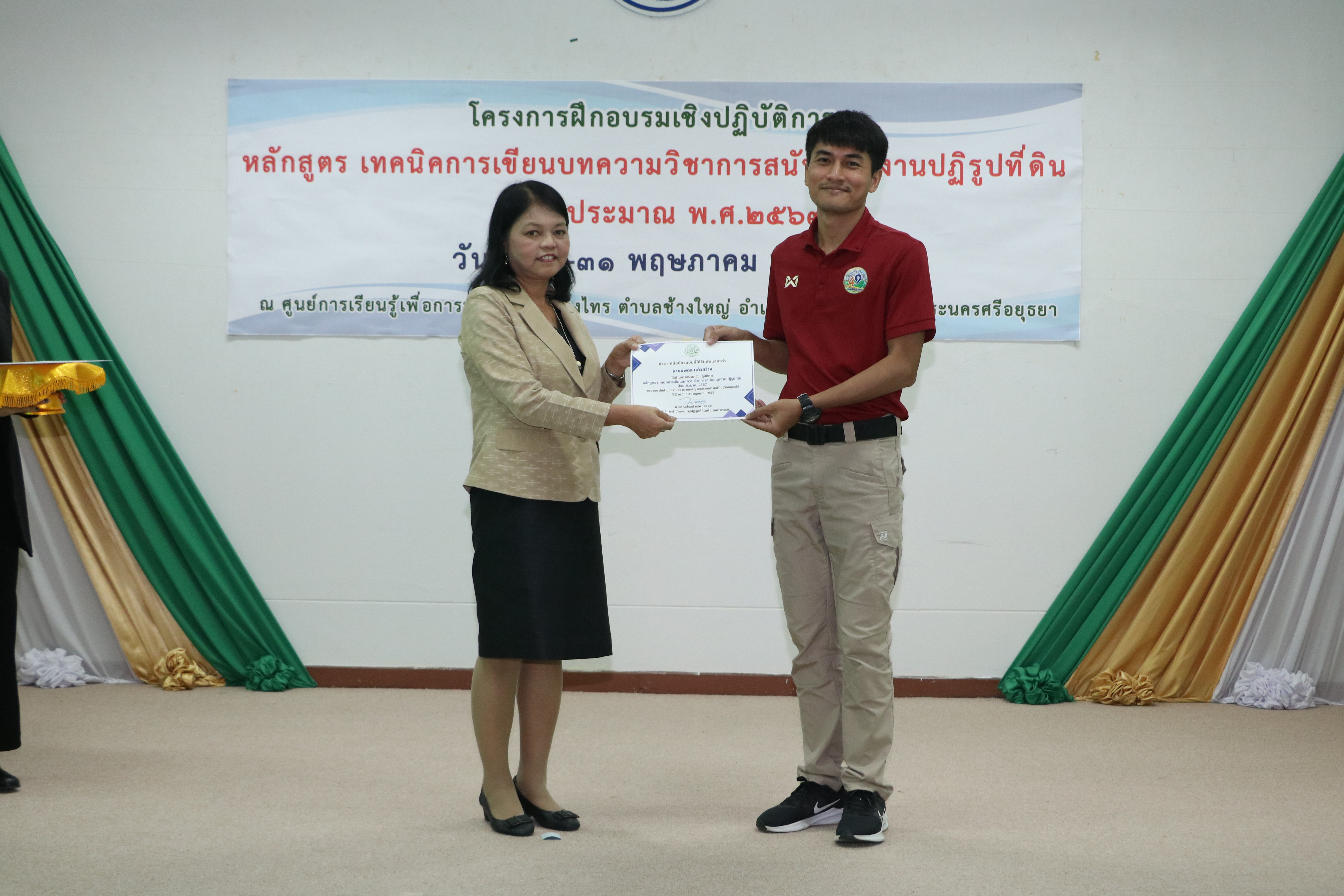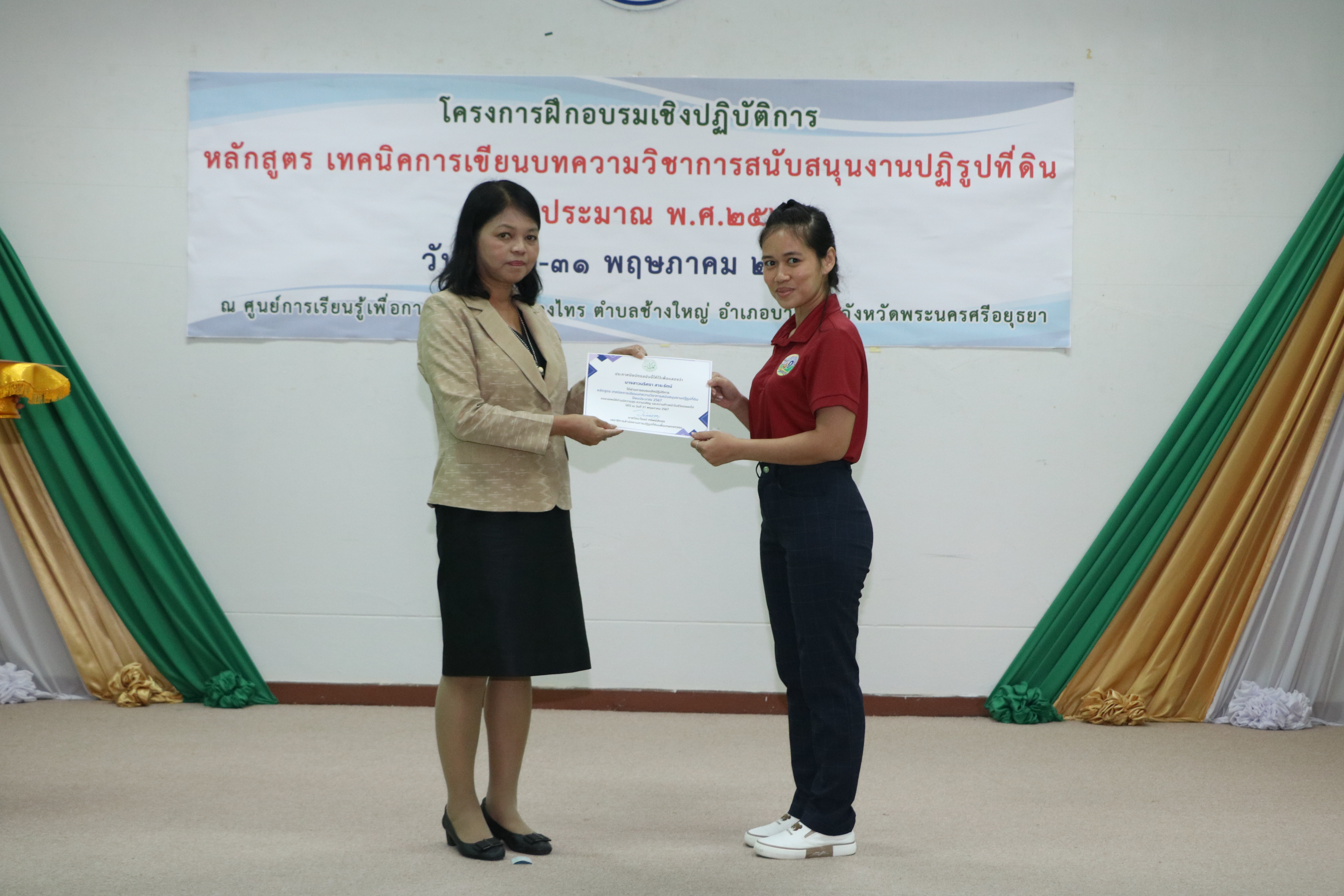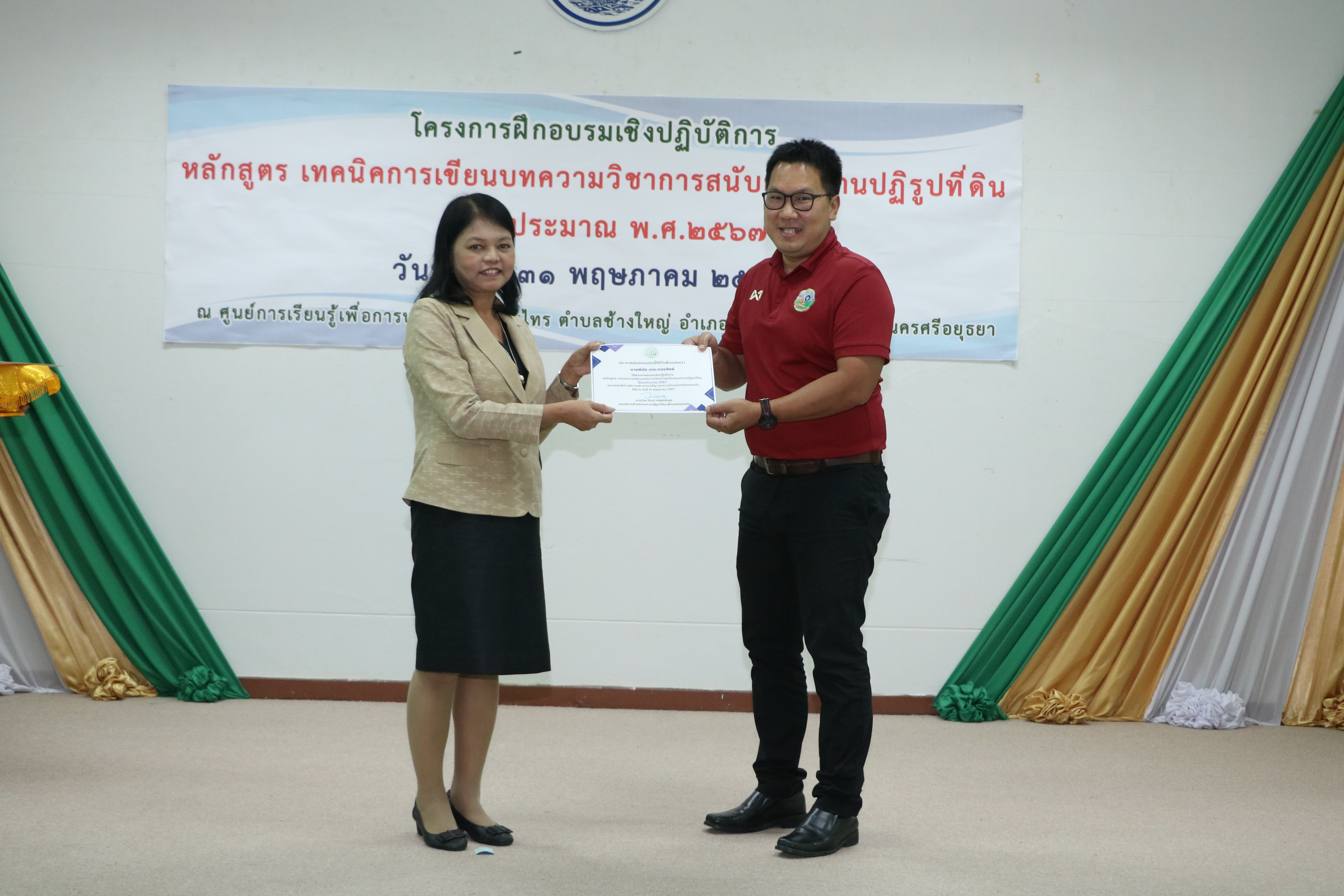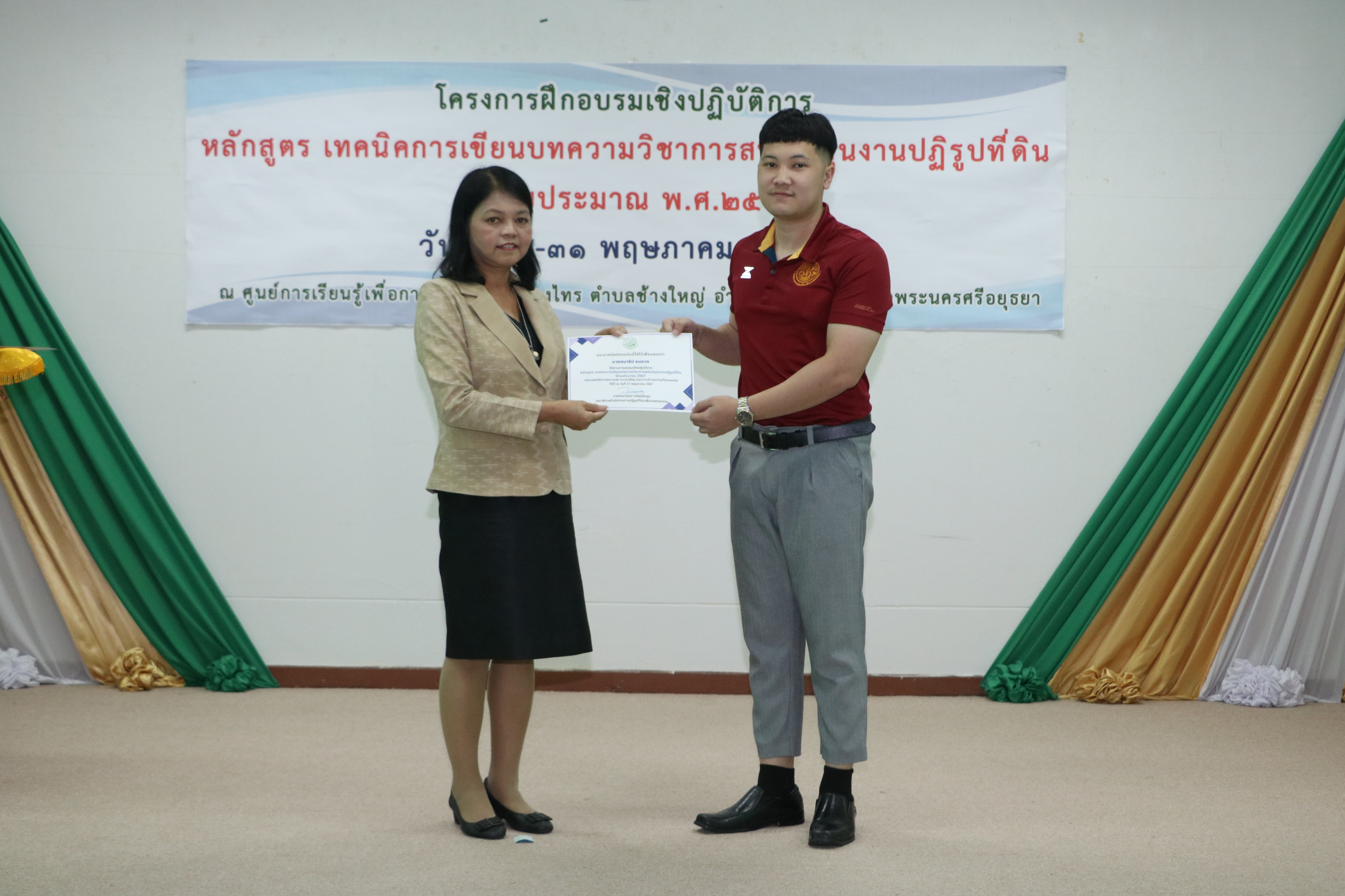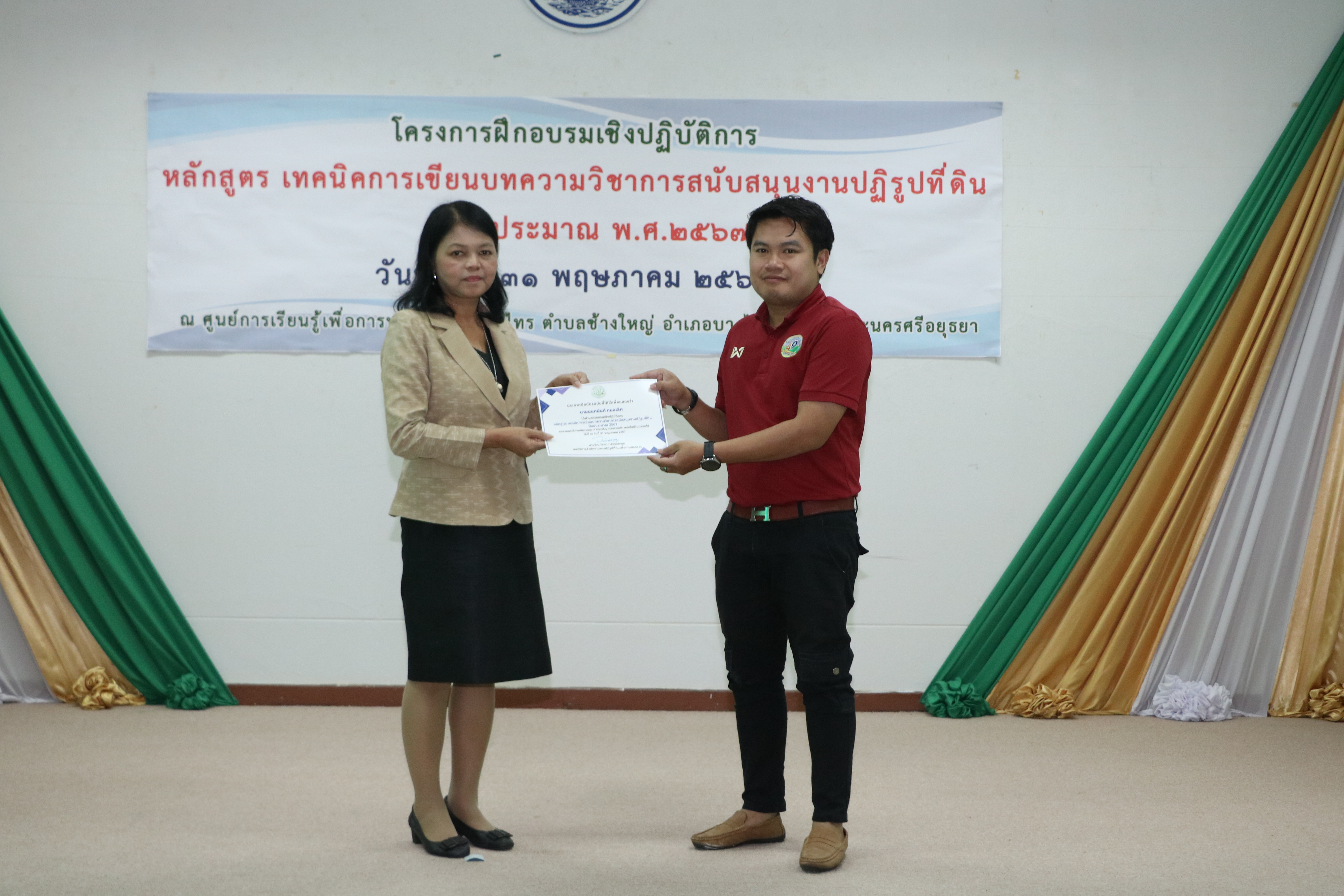 วันศุกร์ที่ 31 พฤษภาคม 2567 เวลา 15.00 น. นายวิณะโรจน์ ทรัพย์ส่งสุข เลขาธิการสำนักงานการปฏิรูปที่ดินเพื่อเกษตรกรรม (ส.ป.ก.) มอบหมายให้ นางสาวฐิภาพรรณ พึ่งไพฑูรย์ ผู้ตรวจราชการกรม เป็นประธานปิดโครงการอบรมเชิงปฏิบัติการ หลักสูตร “เทคนิคการเขียนบทความวิชาการสนับสนุนงานปฏิรูปที่ดิน ปีงบประมาณ พ.ศ. 2567” ณ ศูนย์การเรียนรู้เพื่อการปฏิรูปที่ดินบางไทร ตำบลช้างใหญ่ อำเภอบางไทร จังหวัดพระนครศรีอยุธยา ในการนี้ ประธานได้ให้คำแนะนำและให้กำลังใจแก่ผู้เข้าอบรมในการนำเสนอบทความวิชาการผ่านเวทีการประชุมวิชาการและรับผลการประเมินผล