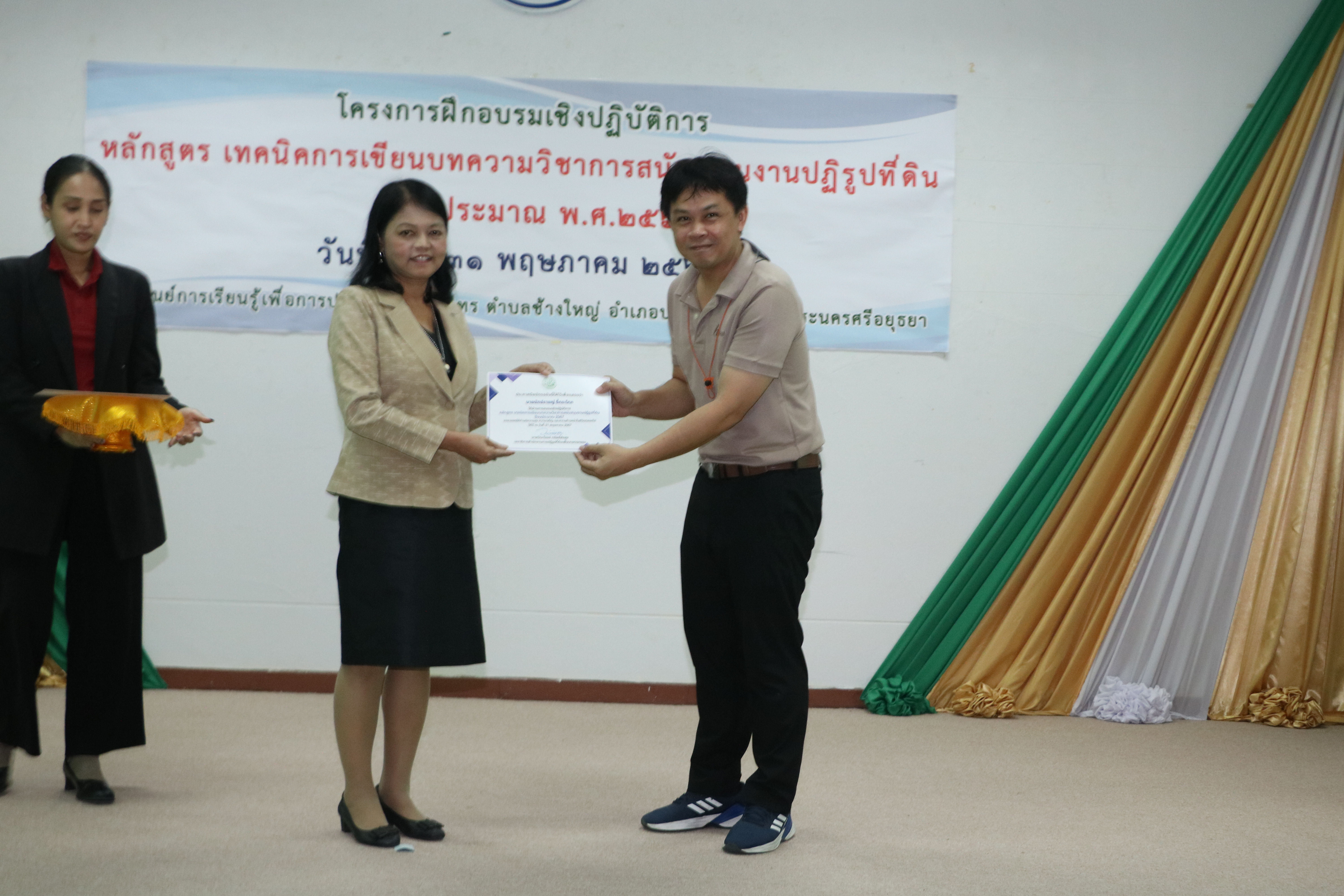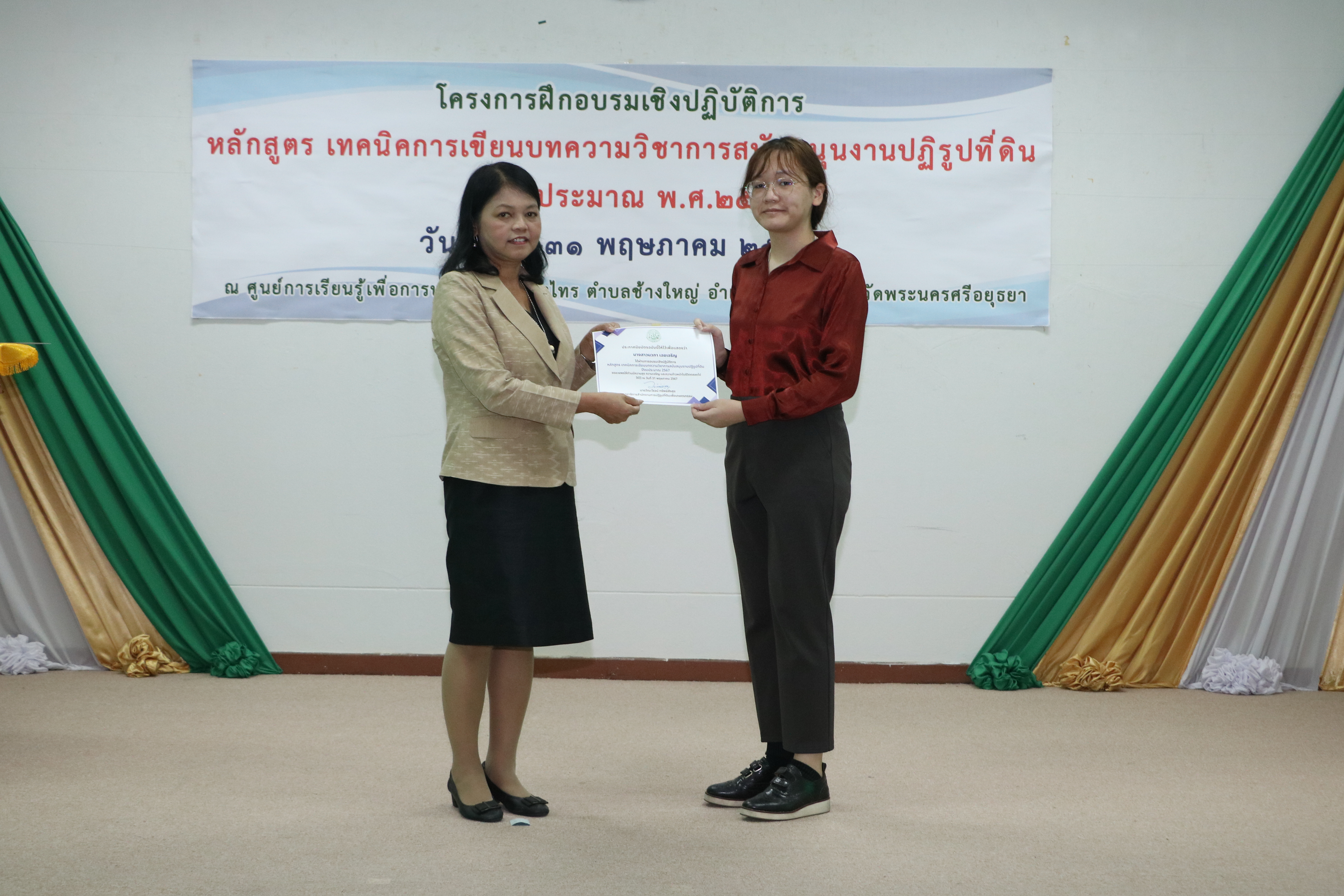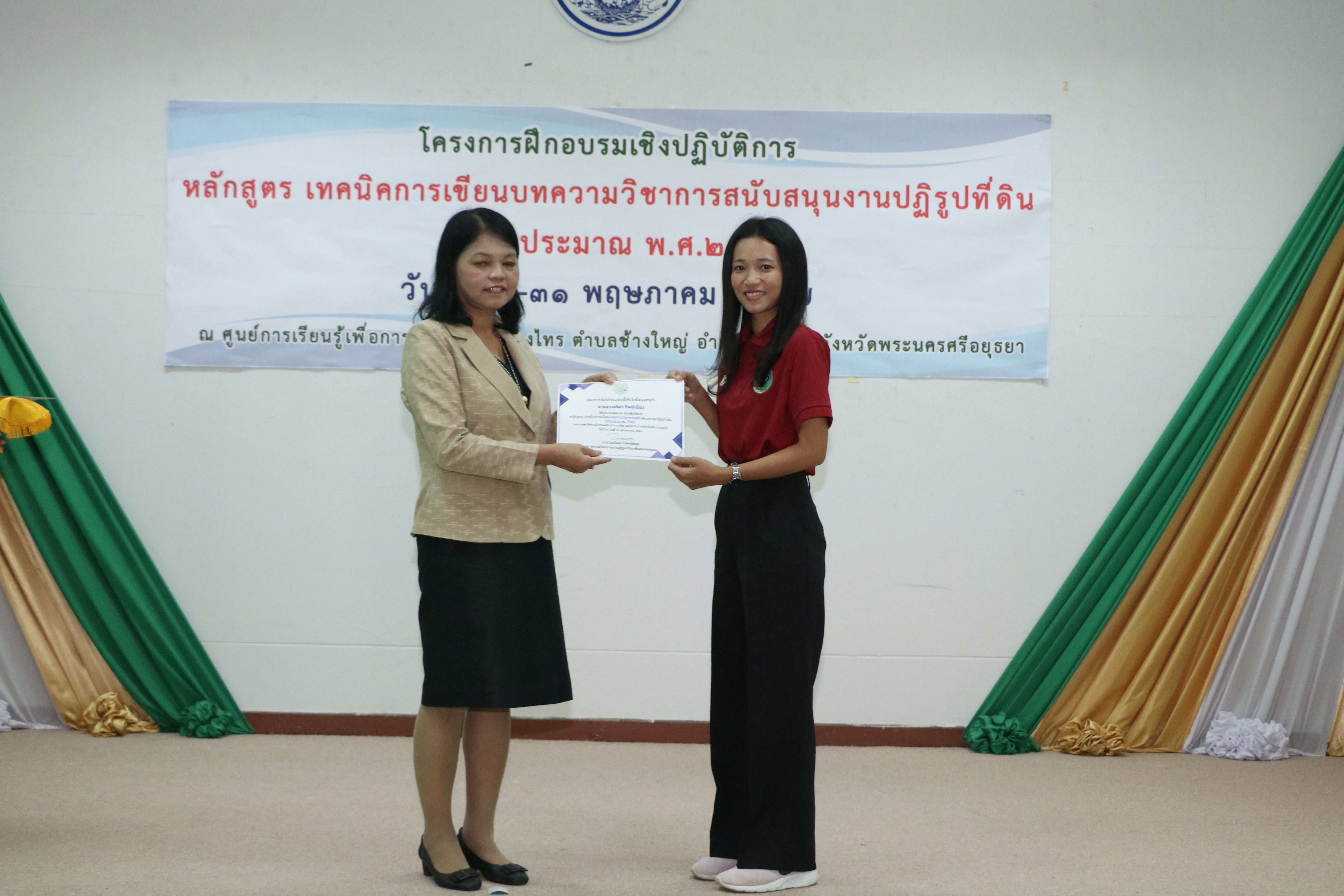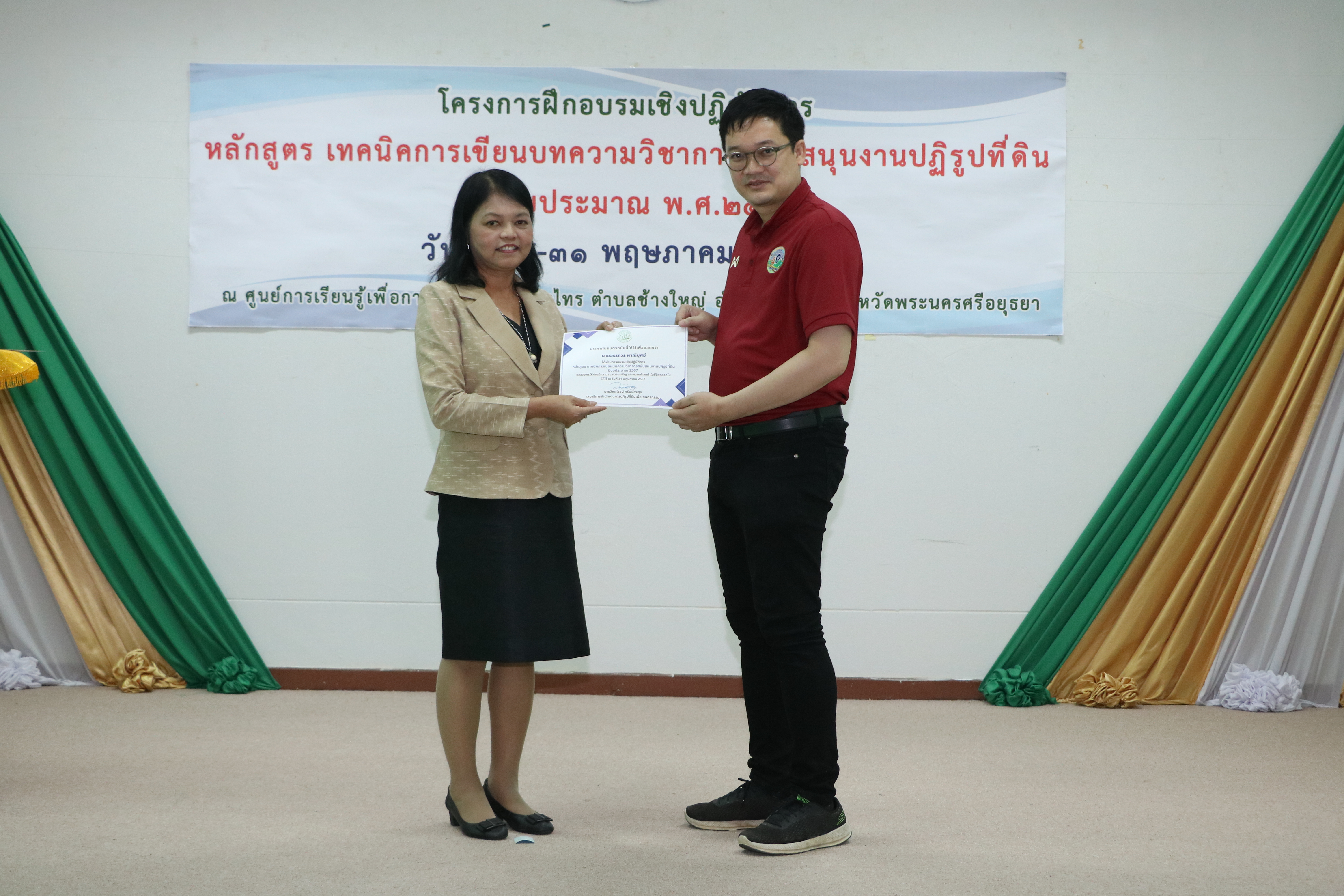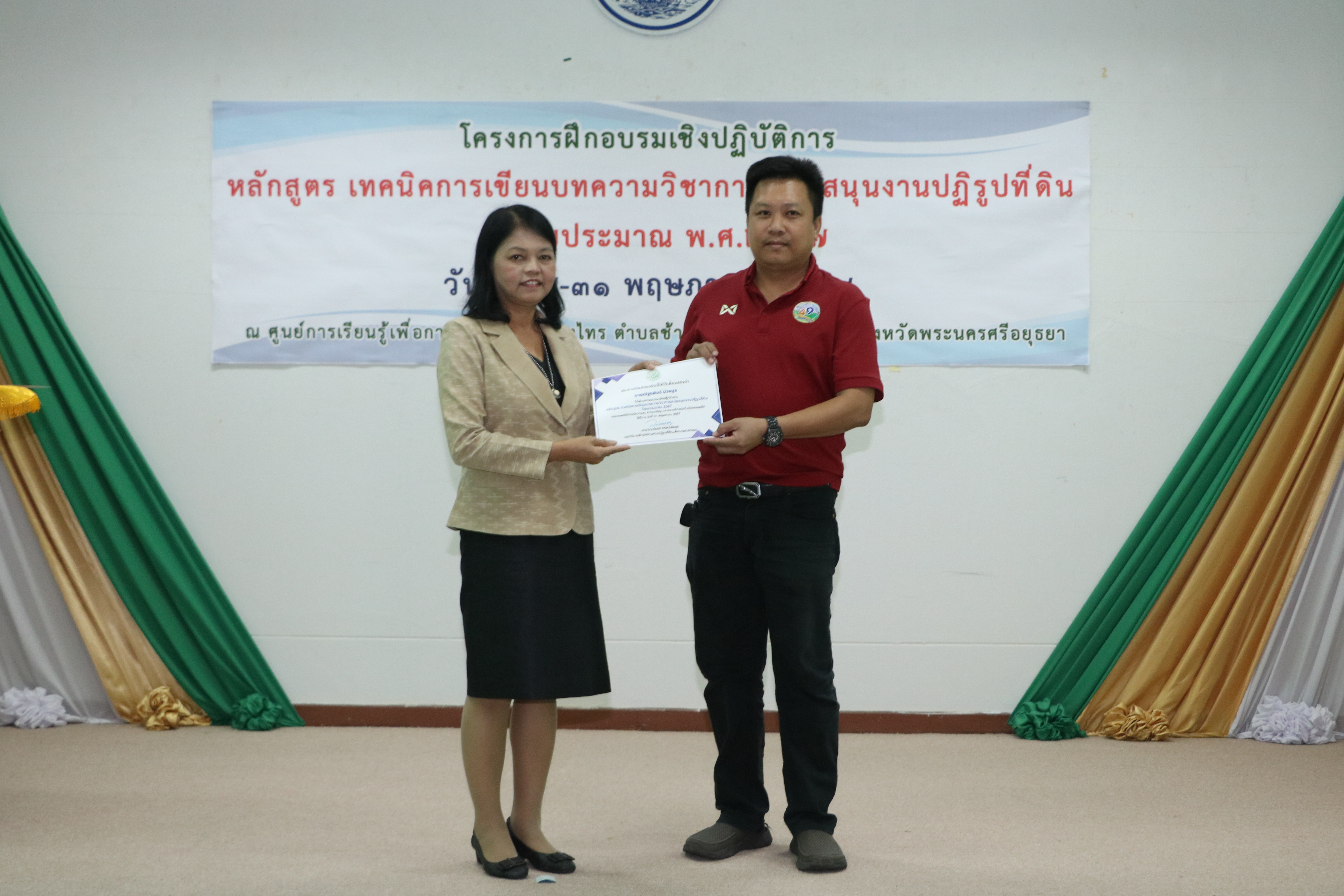 วันศุกร์ที่ 31 พฤษภาคม 2567 เวลา 15.00 น. นายวิณะโรจน์ ทรัพย์ส่งสุข เลขาธิการสำนักงานการปฏิรูปที่ดินเพื่อเกษตรกรรม (ส.ป.ก.) มอบหมายให้ นางสาวฐิภาพรรณ พึ่งไพฑูรย์ ผู้ตรวจราชการกรม เป็นประธานปิดโครงการอบรมเชิงปฏิบัติการ หลักสูตร “เทคนิคการเขียนบทความวิชาการสนับสนุนงานปฏิรูปที่ดิน ปีงบประมาณ พ.ศ. 2567” ณ ศูนย์การเรียนรู้เพื่อการปฏิรูปที่ดินบางไทร ตำบลช้างใหญ่ อำเภอบางไทร จังหวัดพระนครศรีอยุธยา ในการนี้ ประธานได้ให้คำแนะนำและให้กำลังใจแก่ผู้เข้าอบรมในการนำเสนอบทความวิชาการผ่านเวทีการประชุมวิชาการและรับผลการประเมินผล