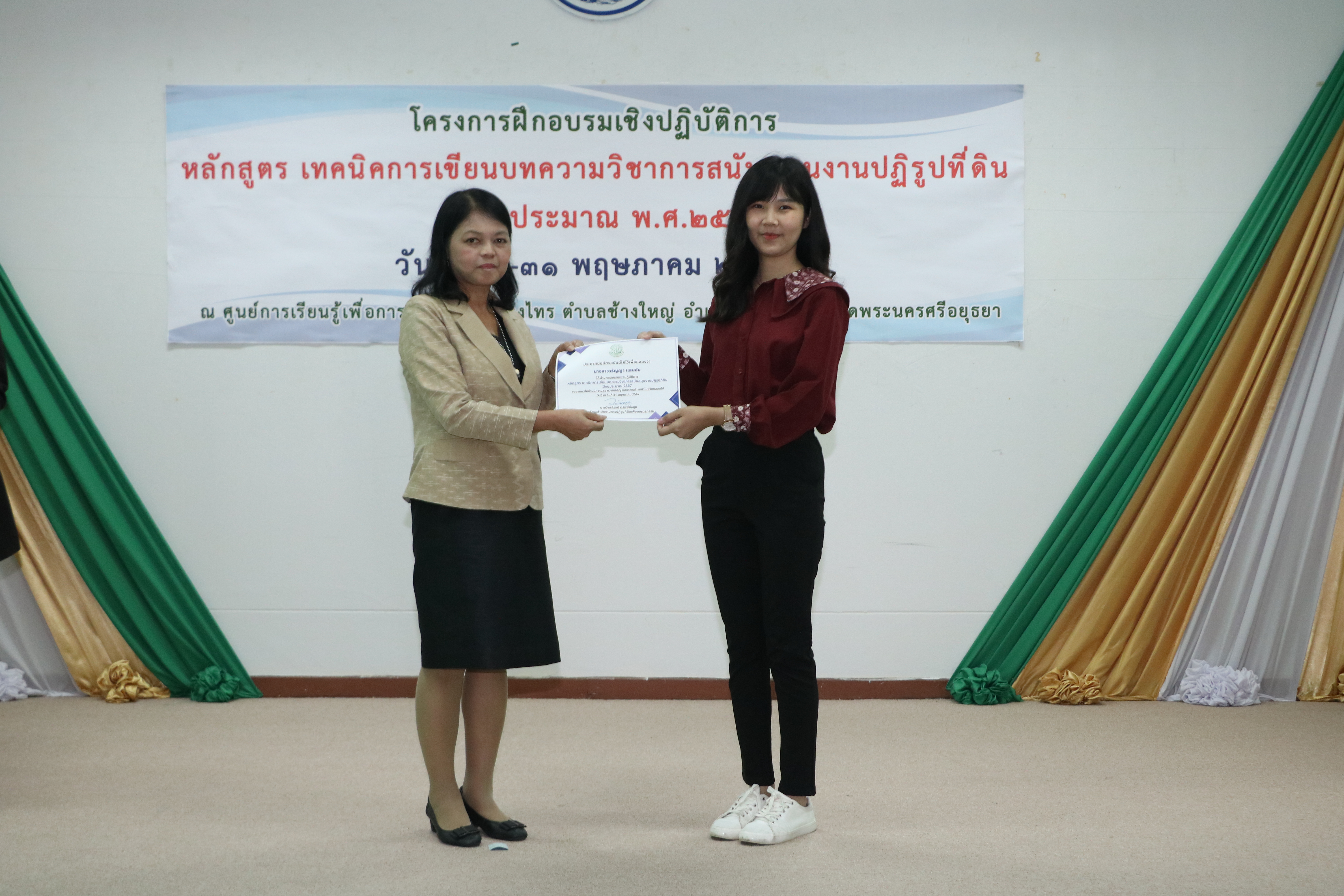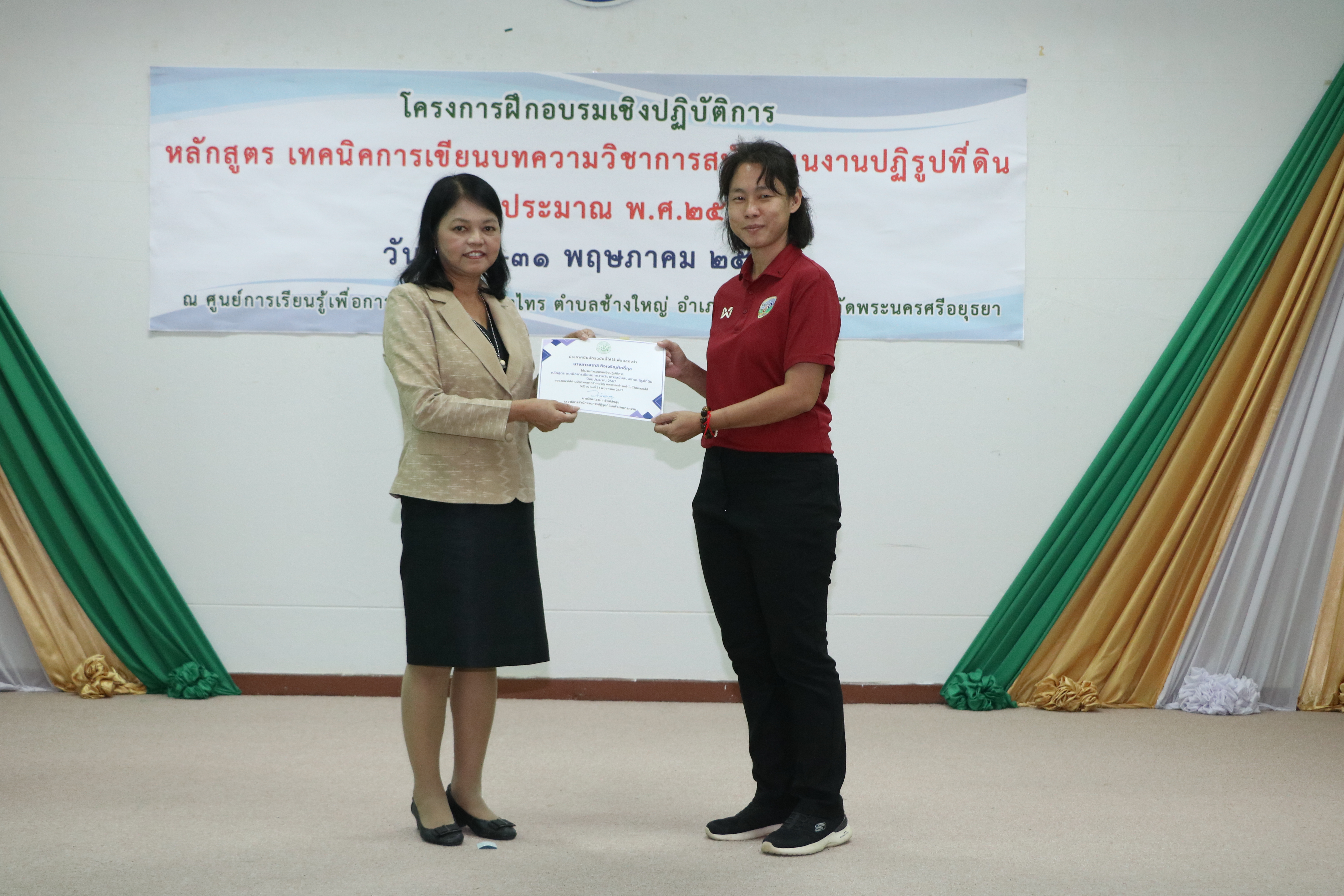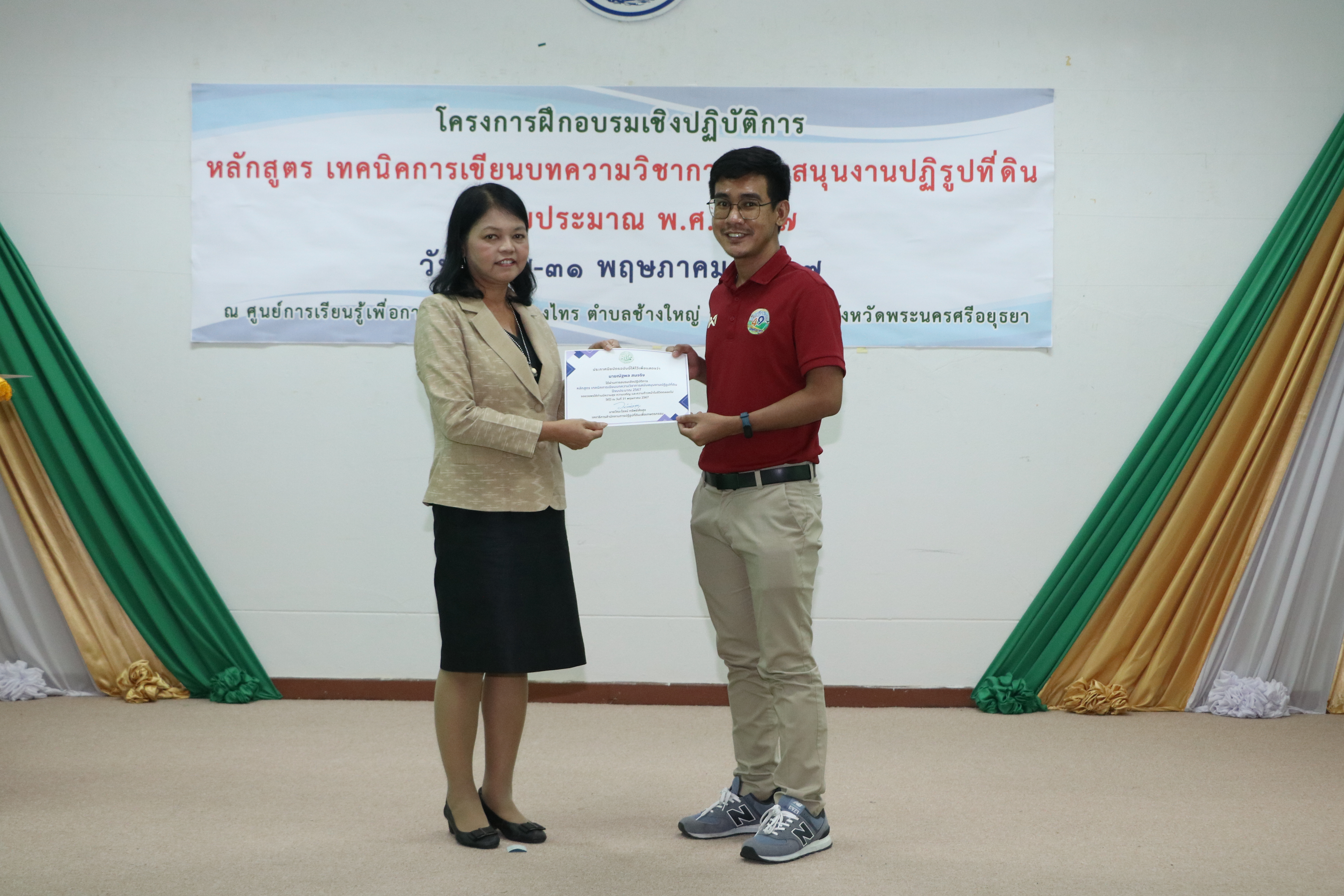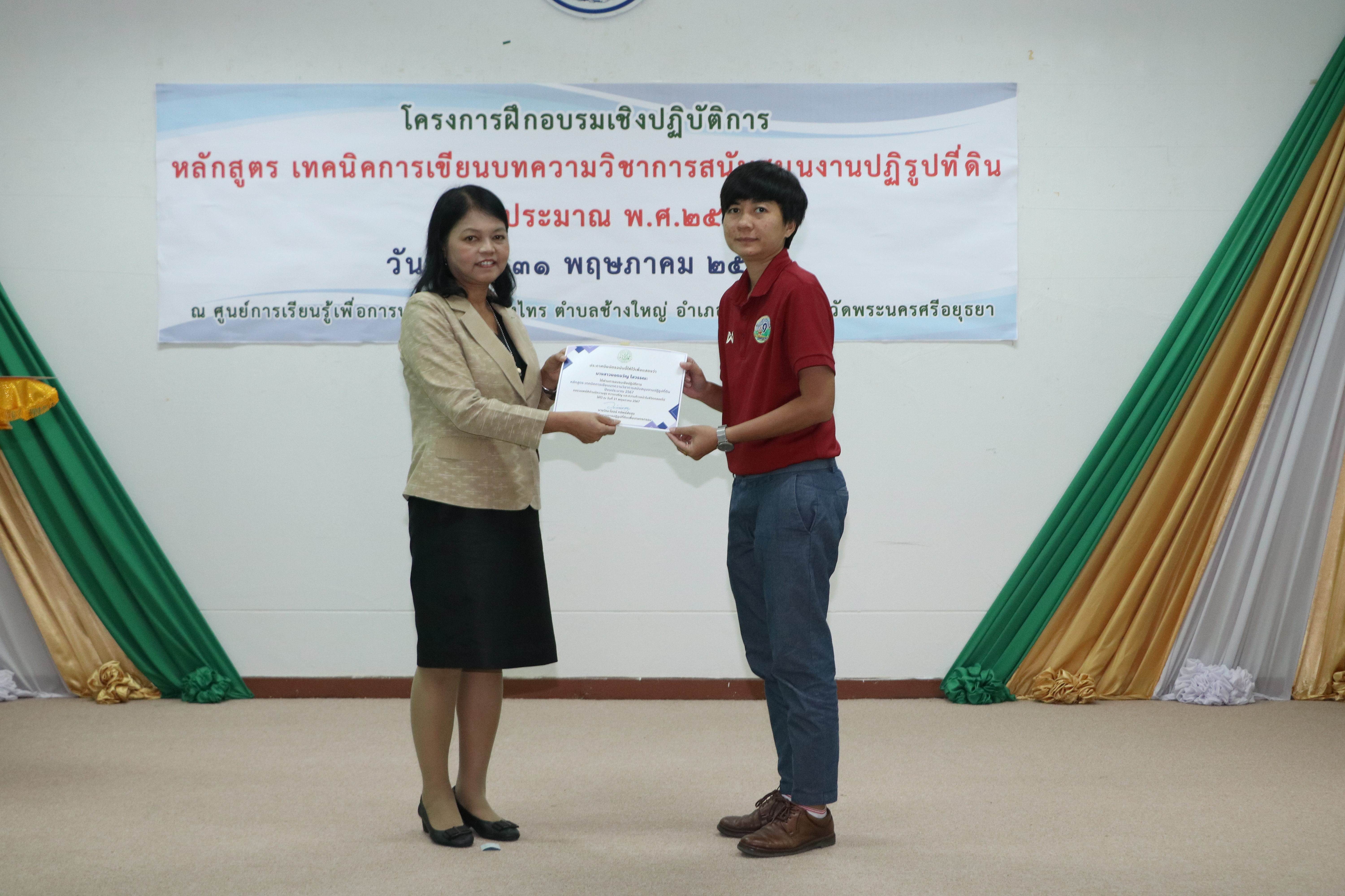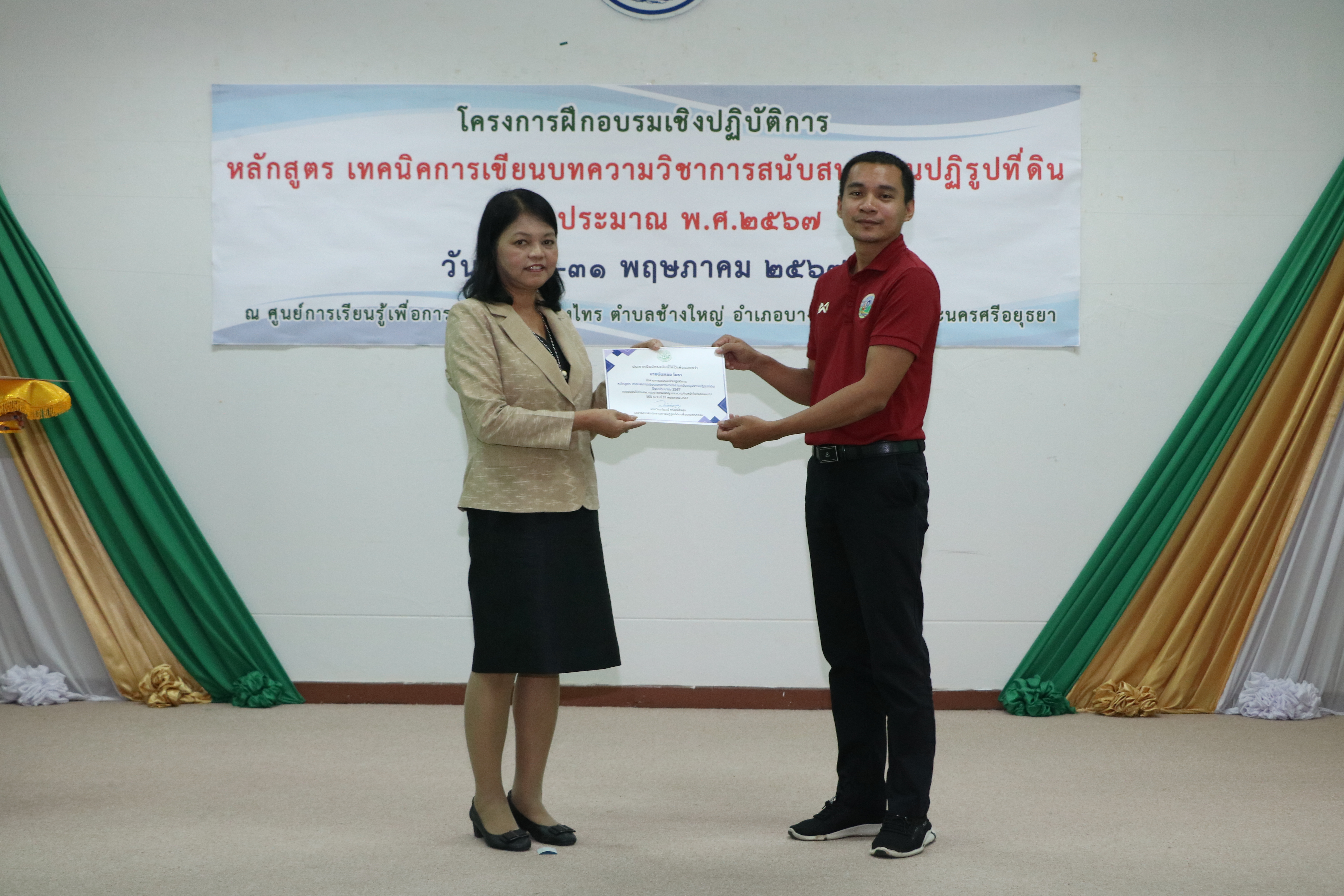 วันศุกร์ที่ 31 พฤษภาคม 2567 เวลา 15.00 น. นายวิณะโรจน์ ทรัพย์ส่งสุข เลขาธิการสำนักงานการปฏิรูปที่ดินเพื่อเกษตรกรรม (ส.ป.ก.) มอบหมายให้ นางสาวฐิภาพรรณ พึ่งไพฑูรย์ ผู้ตรวจราชการกรม เป็นประธานปิดโครงการอบรมเชิงปฏิบัติการ หลักสูตร “เทคนิคการเขียนบทความวิชาการสนับสนุนงานปฏิรูปที่ดิน ปีงบประมาณ พ.ศ. 2567” ณ ศูนย์การเรียนรู้เพื่อการปฏิรูปที่ดินบางไทร ตำบลช้างใหญ่ อำเภอบางไทร จังหวัดพระนครศรีอยุธยา ในการนี้ ประธานได้ให้คำแนะนำและให้กำลังใจแก่ผู้เข้าอบรมในการนำเสนอบทความวิชาการผ่านเวทีการประชุมวิชาการและรับผลการประเมินผล