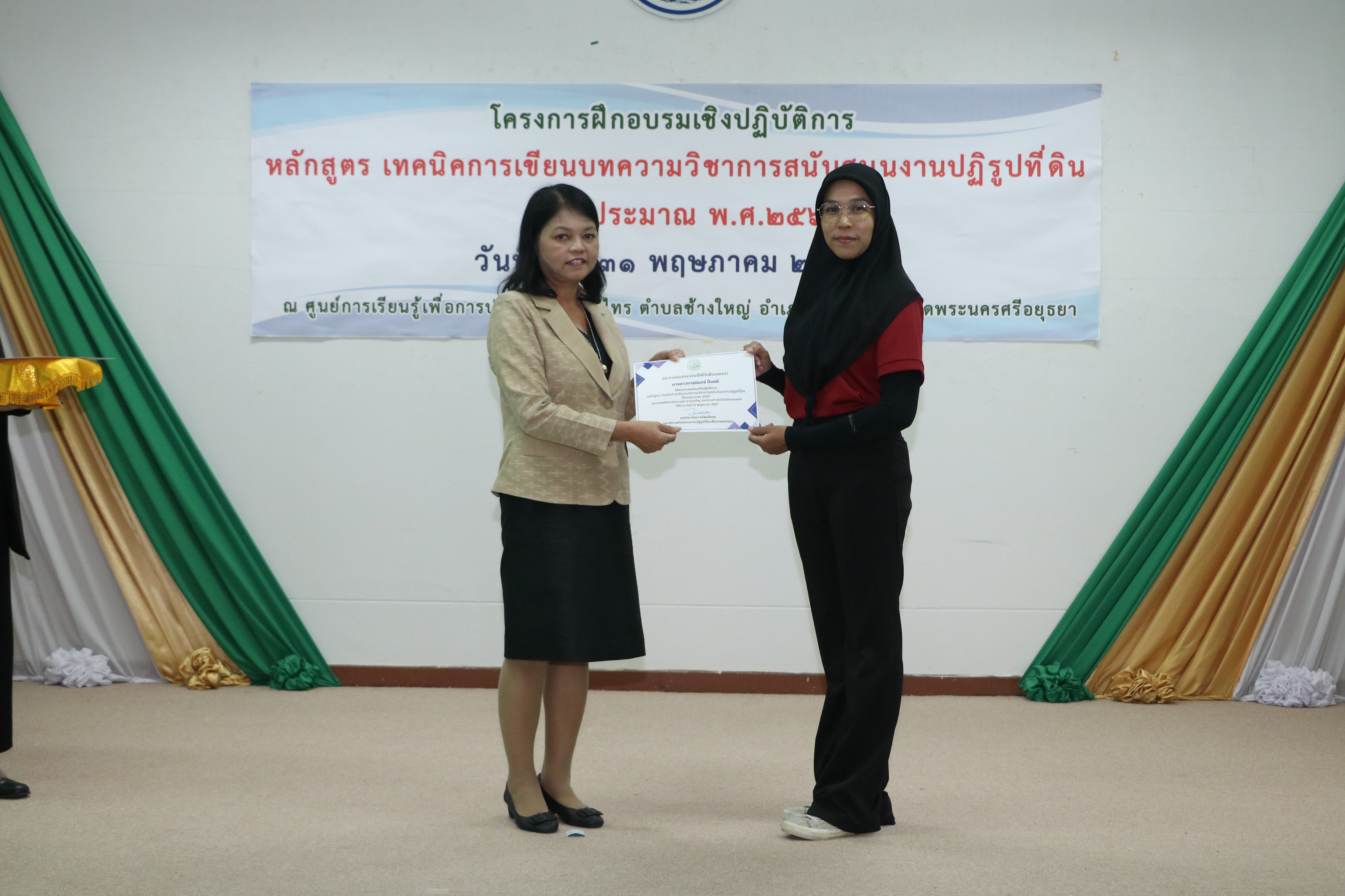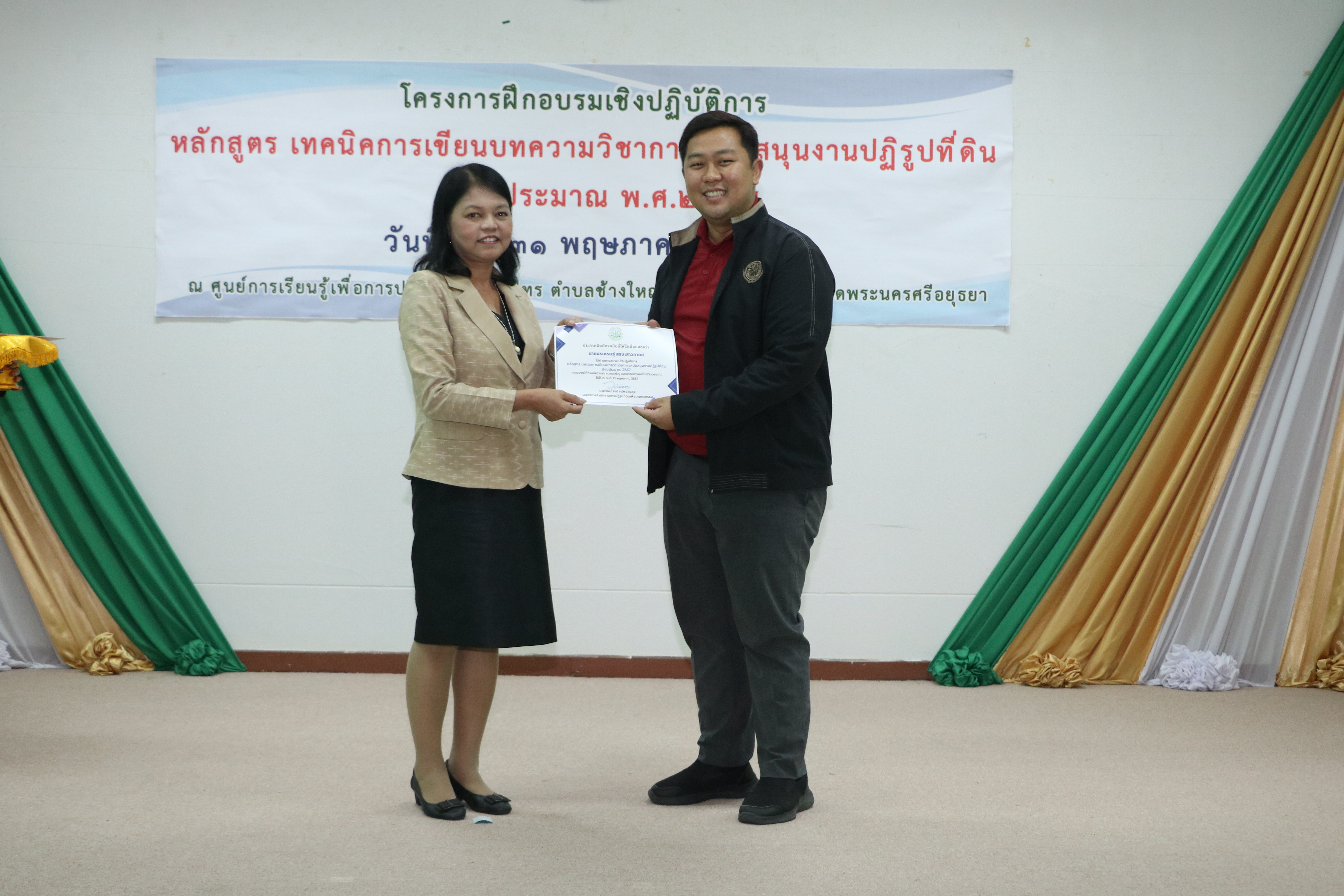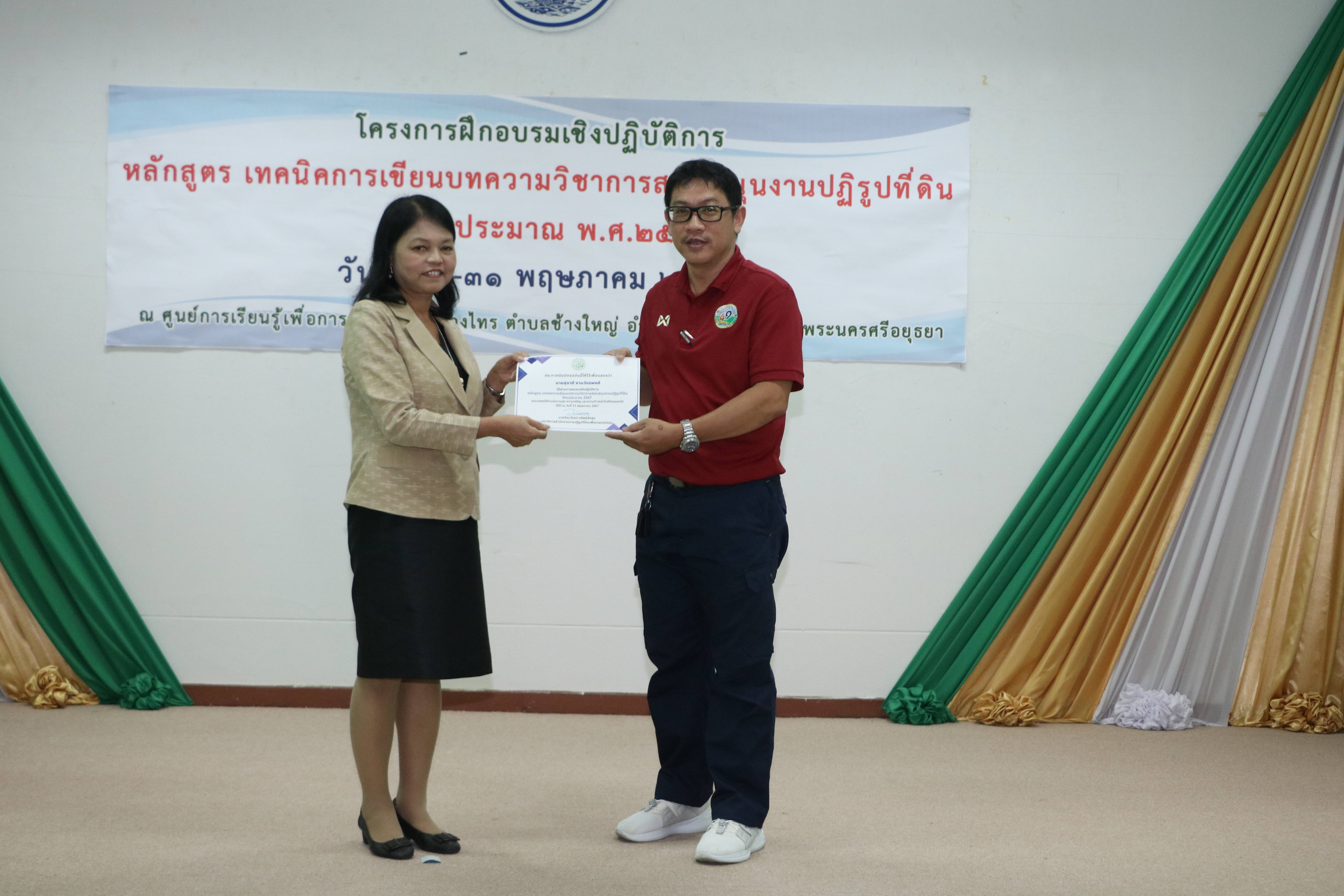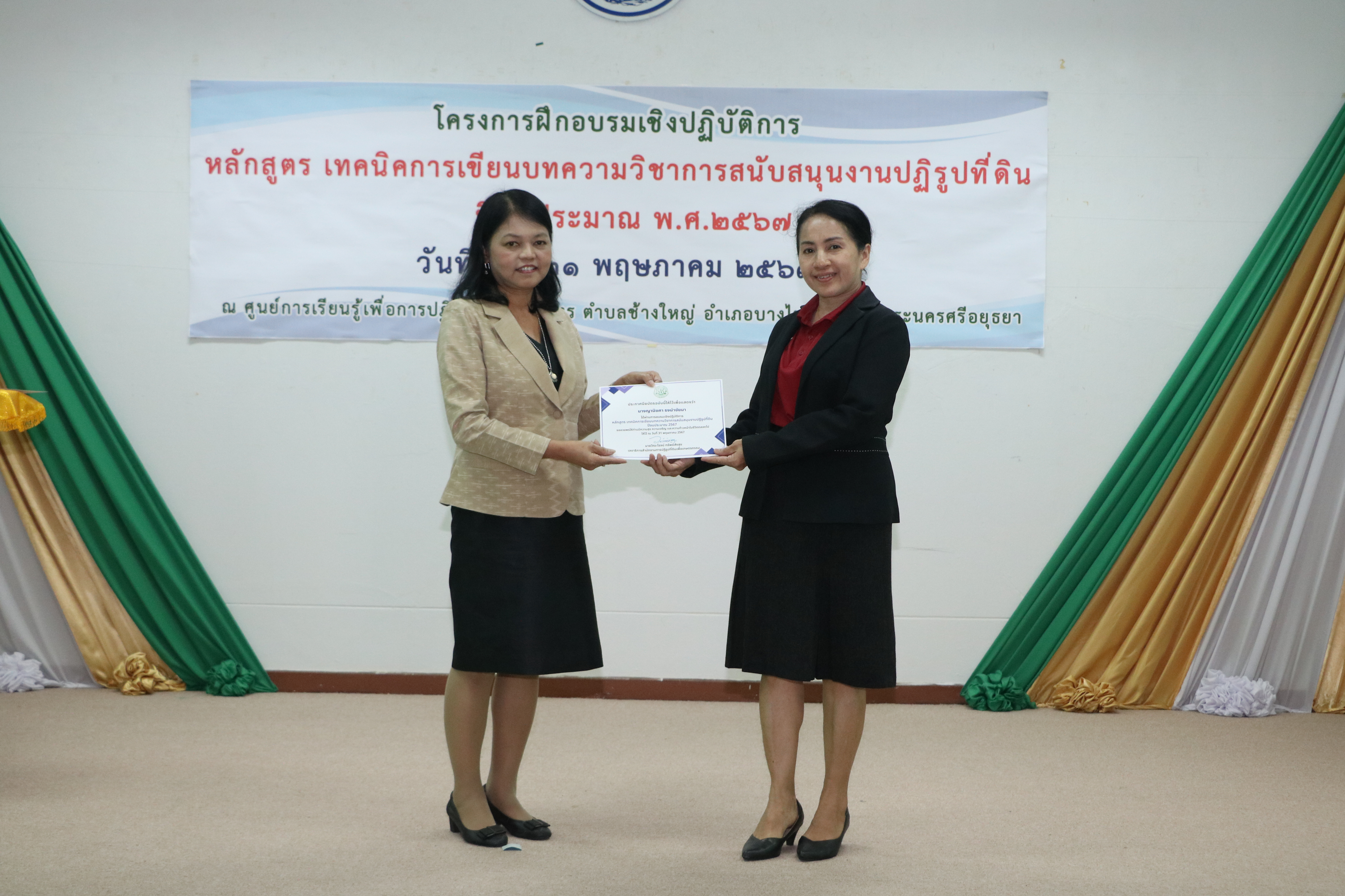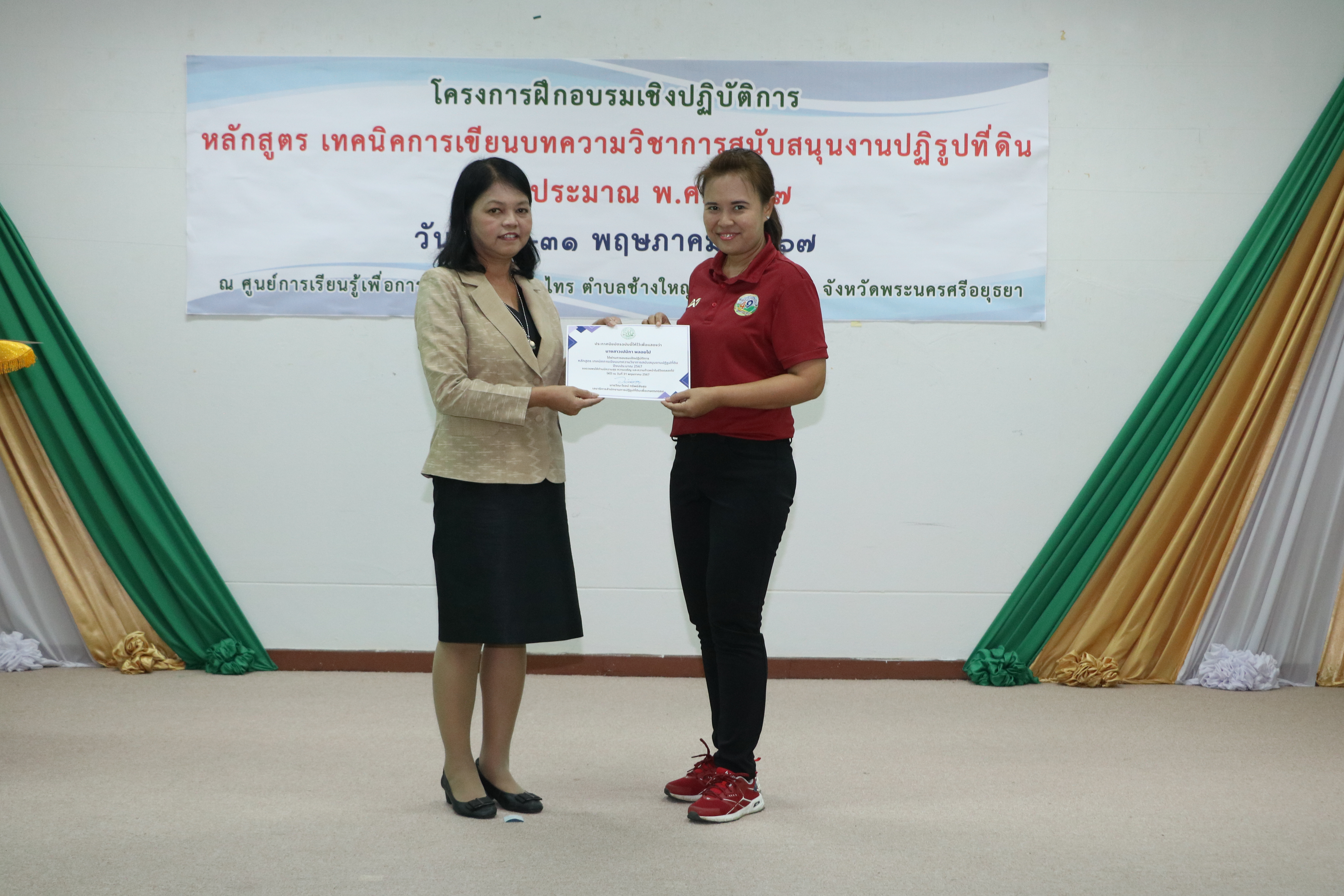 วันศุกร์ที่ 31 พฤษภาคม 2567 เวลา 15.00 น. นายวิณะโรจน์ ทรัพย์ส่งสุข เลขาธิการสำนักงานการปฏิรูปที่ดินเพื่อเกษตรกรรม (ส.ป.ก.) มอบหมายให้ นางสาวฐิภาพรรณ พึ่งไพฑูรย์ ผู้ตรวจราชการกรม เป็นประธานปิดโครงการอบรมเชิงปฏิบัติการ หลักสูตร “เทคนิคการเขียนบทความวิชาการสนับสนุนงานปฏิรูปที่ดิน ปีงบประมาณ พ.ศ. 2567” ณ ศูนย์การเรียนรู้เพื่อการปฏิรูปที่ดินบางไทร ตำบลช้างใหญ่ อำเภอบางไทร จังหวัดพระนครศรีอยุธยา ในการนี้ ประธานได้ให้คำแนะนำและให้กำลังใจแก่ผู้เข้าอบรมในการนำเสนอบทความวิชาการผ่านเวทีการประชุมวิชาการและรับผลการประเมินผล