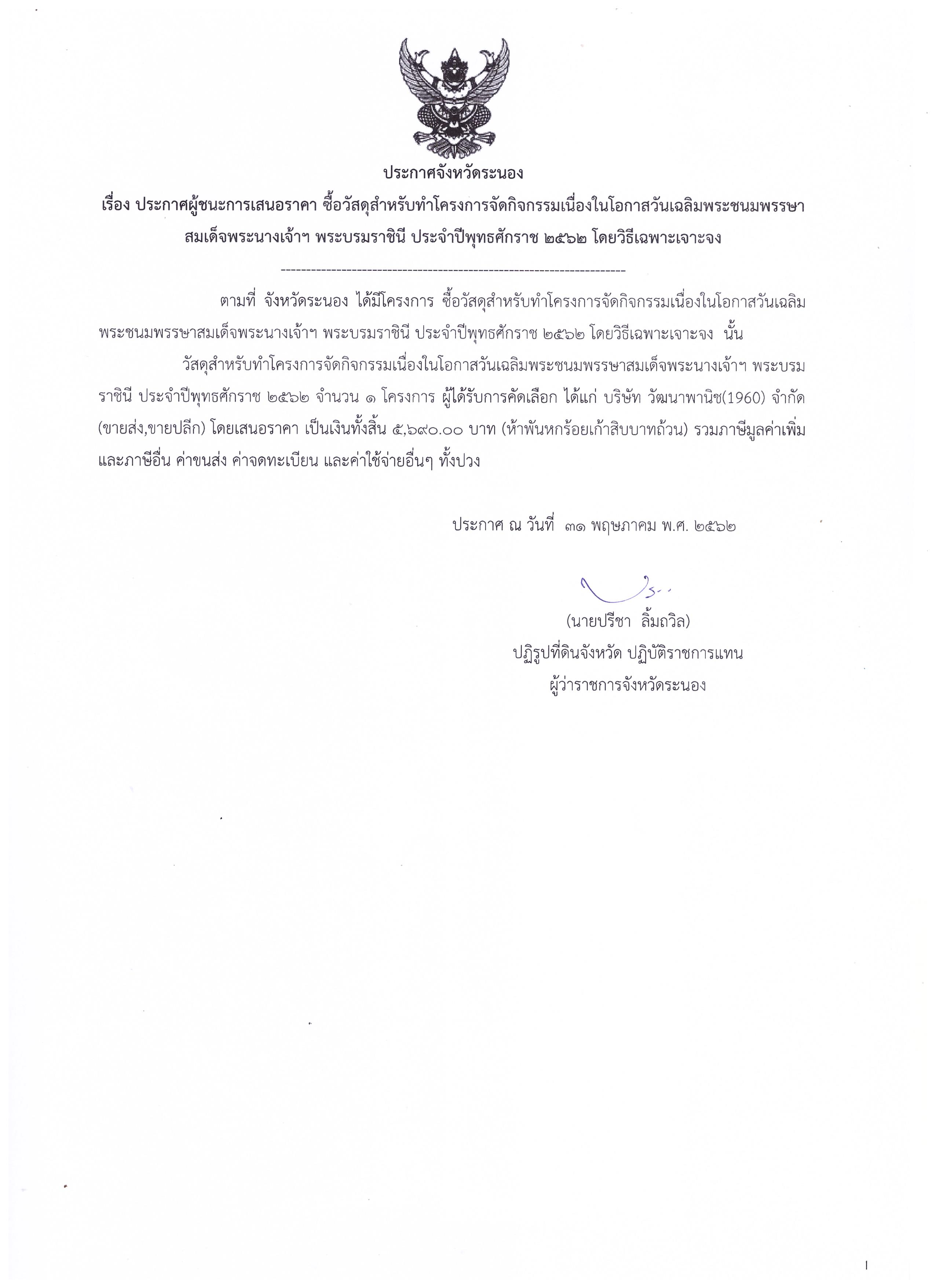 ประกาศจังหวัดระนอง เรื่อง ประกาศผู้ชนะการเสนอราคาซื้อวัสดุสำหรับทำโครงการจัดกิจกรรมเนื่องในโอกาสวันเฉลิมพระชนมพรรษาสมเด็จพระนางเจ้าฯ พระบรมราชินี ประจำปีพุทธศักราช 2562 โดยวิธีเฉพาะเจาะจง