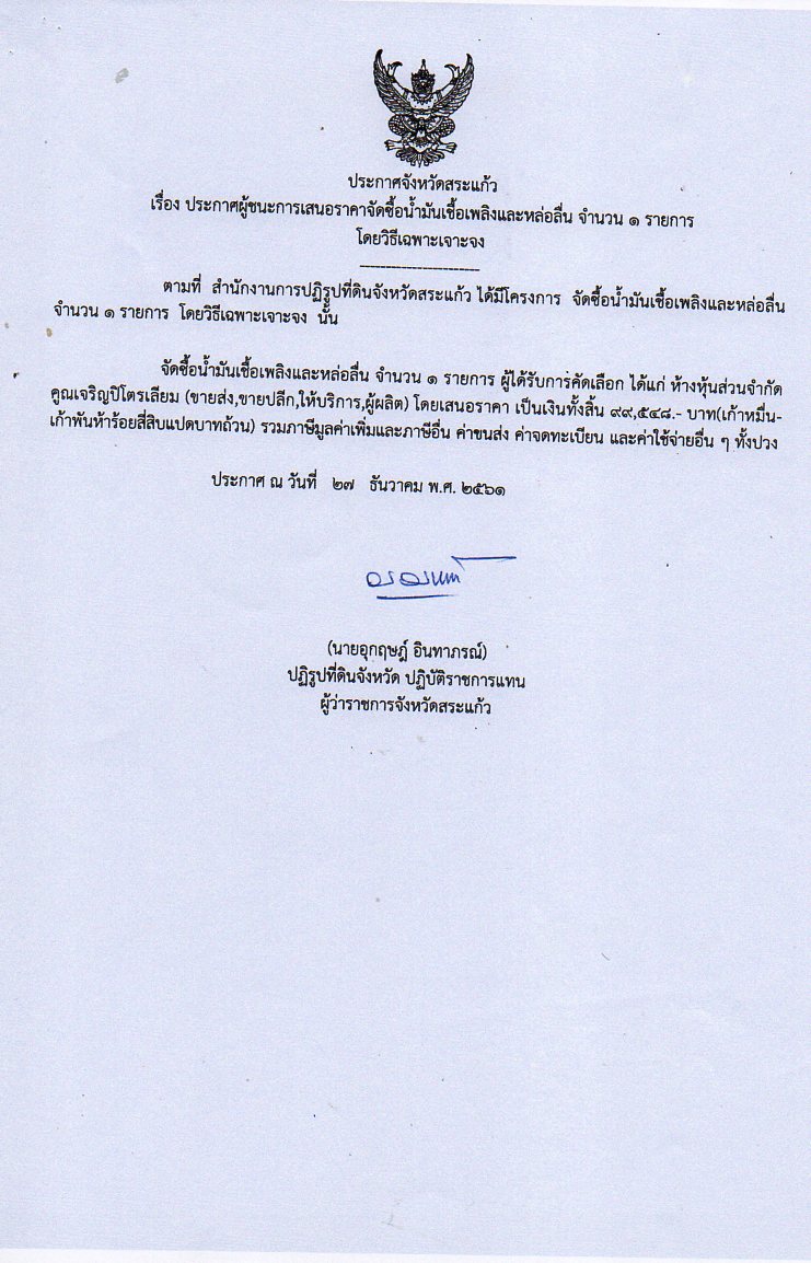 ประกาศจังหวัดสระแก้ว เรื่อง ประกาศผู้ชนะการเสนอราคาจัดซื้อน้ำมันเชื้อเพลิงและหล่อลื่น จำนวน 1 รายการ โดยวิธีเฉพาะเจาะจง