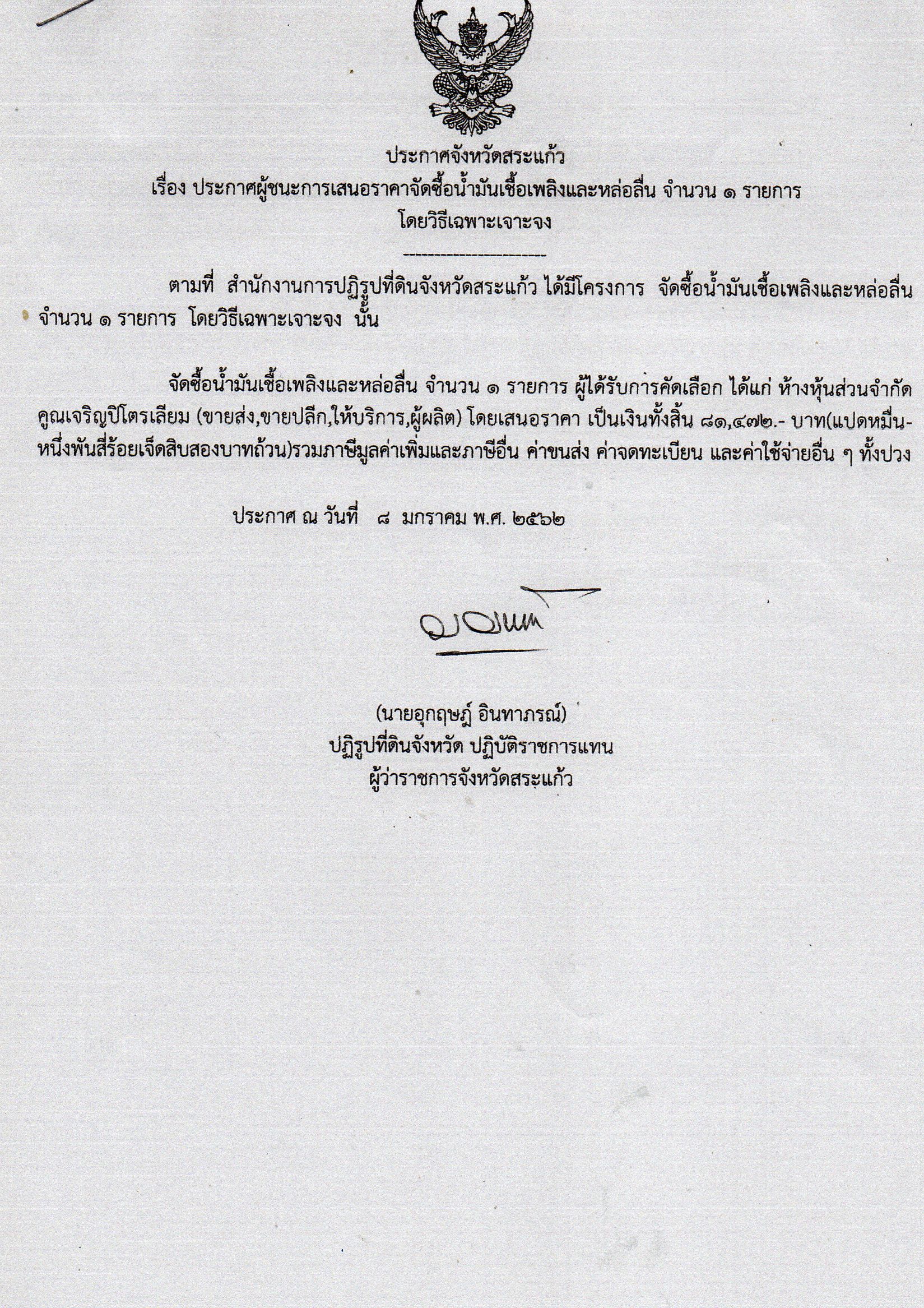 ประกาศจังหวัดสระแก้ว เรื่อง ประกาศผู้ชนะการเสนอราคาจัดซื้อน้ำมันเชื้อเพลิงและหล่อลื่น จำนวน 1 รายการ โดยวิธีเฉพาะเจาะจง