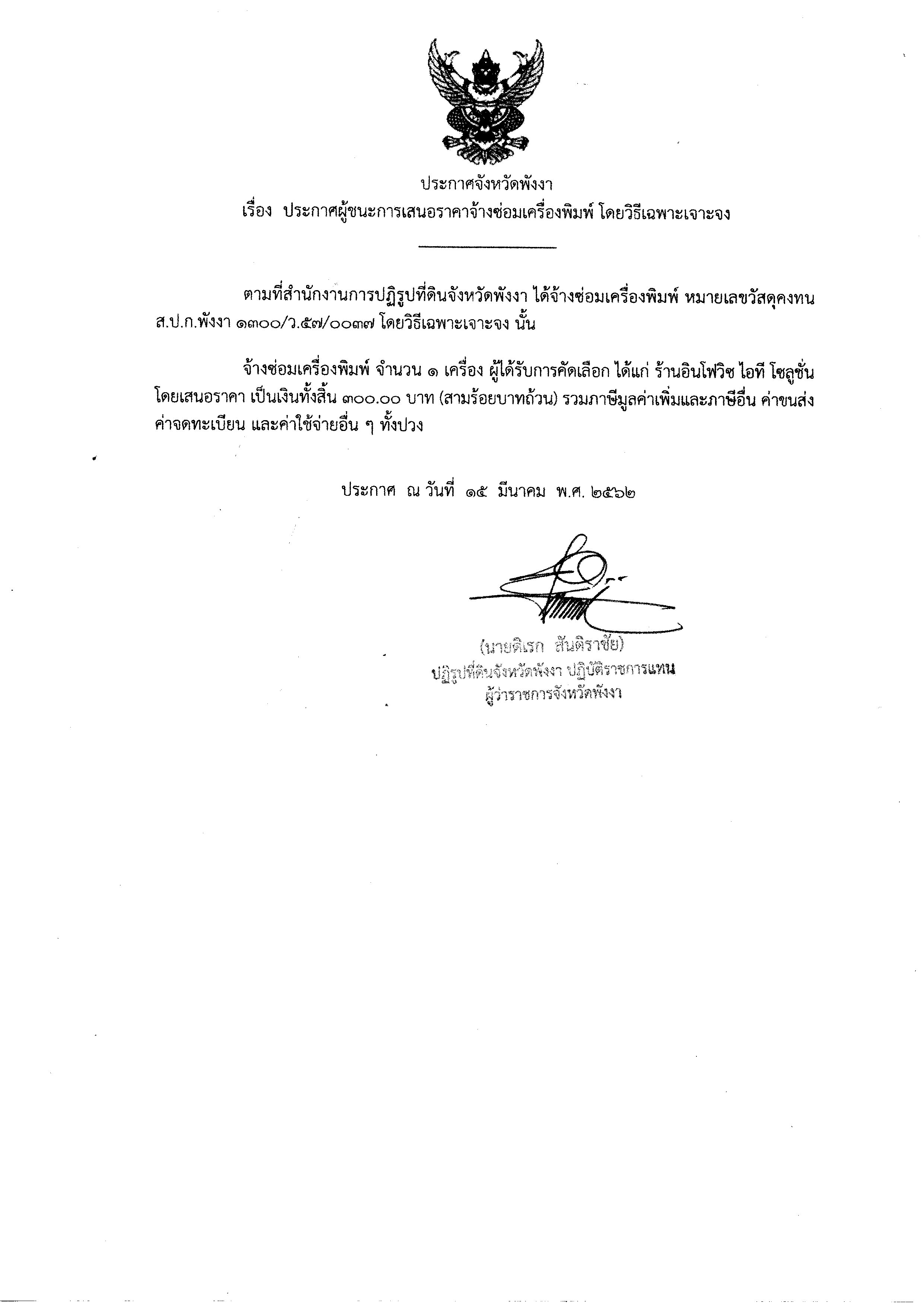 ประกาศผู้ชนะการเสนอราคาจ้างซ่อมเครื่องพิมพ์ โดยวิธีเฉพาะเจาะจง จำนวน 1 เครื่อง