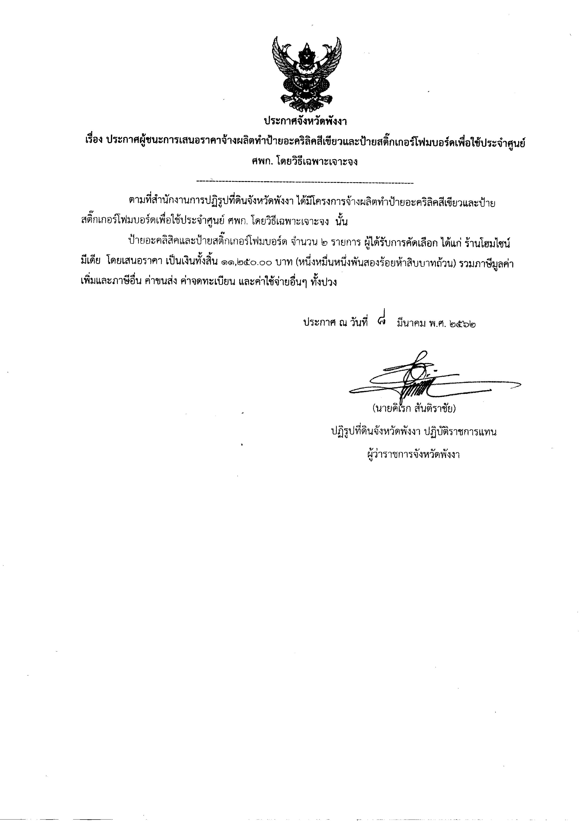 ประกาศผู้ชนะการเสนอราคาจ้างผลิตทำป้ายอะคริลิคสีเขียวและป้ายสติ้กเกอร์โฟมบอร์ดเพื่อใช้ประจำศูนย์ ศพก. โดยวิธีเฉพาะเจาะจง
