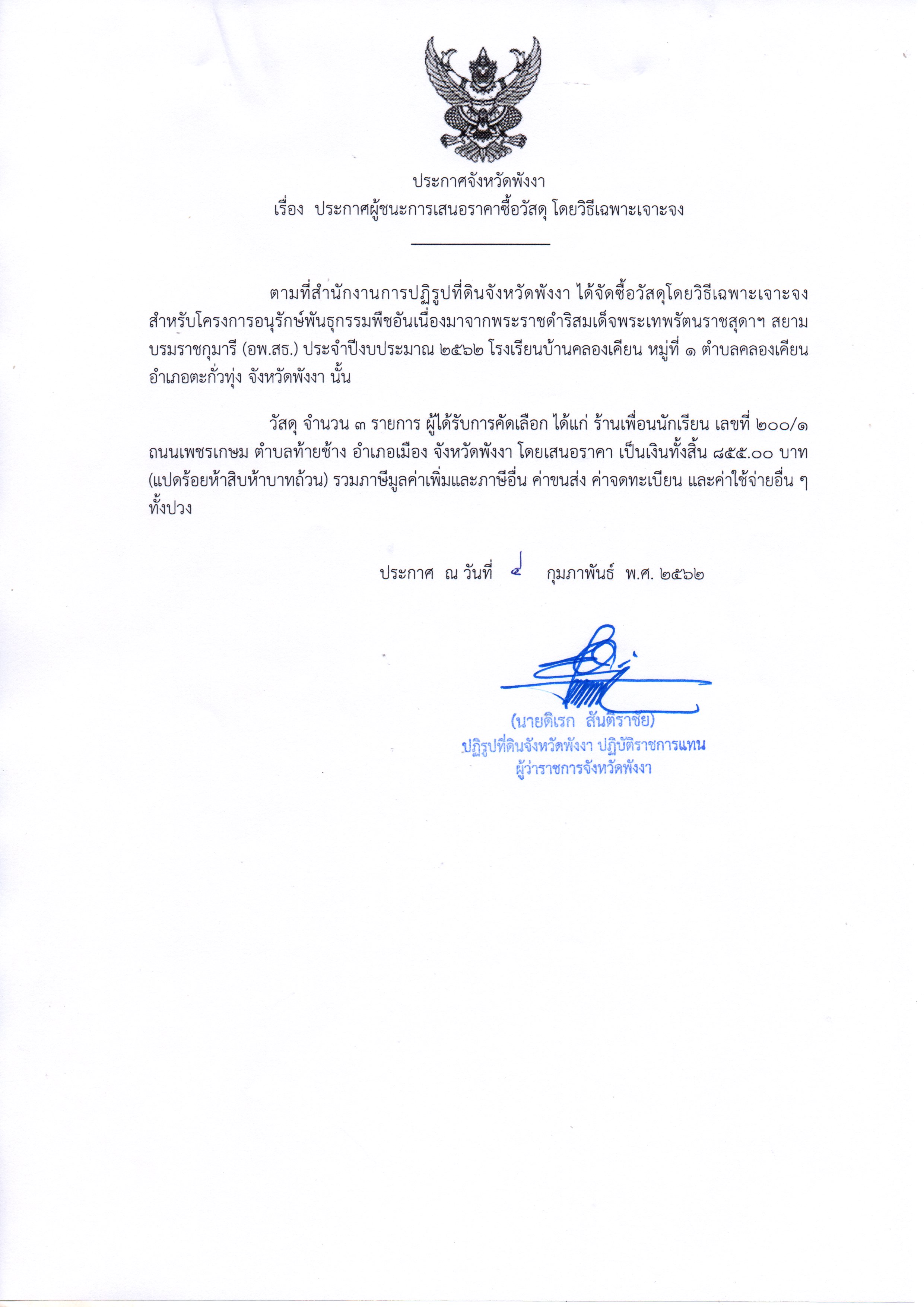 ประกาศผู้ชนะการเสนอราคาซื้อวัสดุ โดยวิธีเฉพาะเจาะจง โครงการอนุรักษ์พันธุกรรมพืชอันเนื่องมาจากพระราชดำริสมเด็จพระเทพรัตนราชสุดาฯ สยามบรมราชกุมารี (อพ.สธ.) ประจำปีงบประมาณ 2562 วัสดุ จำนวน 3 รายการ