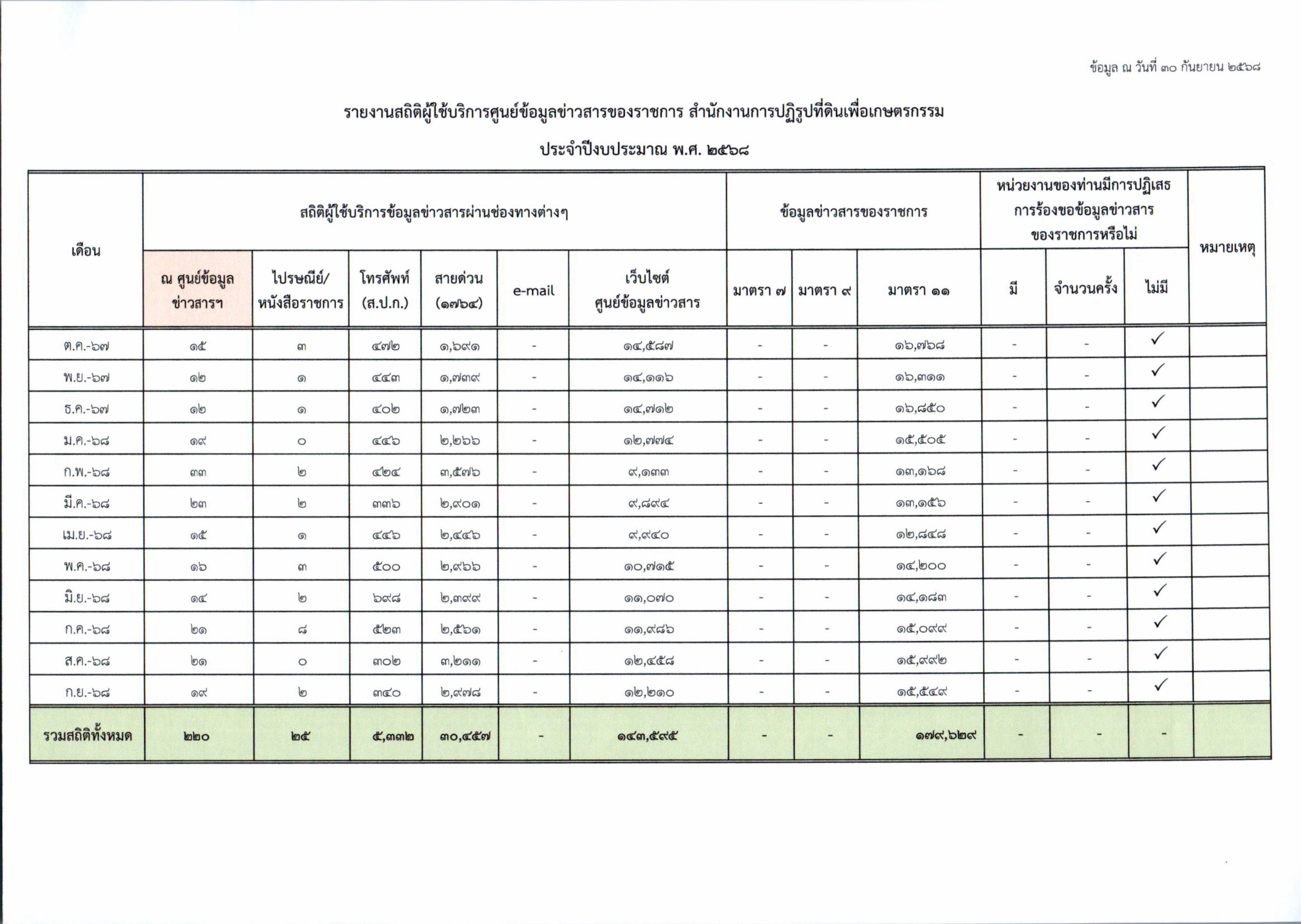 รายงานสถิติผู้ใช้บริการศูนย์ข้อมูลข่าวสารของราชการของ ส.ป.ก. ประจำปีงบประมาณ พ.ศ. 2568