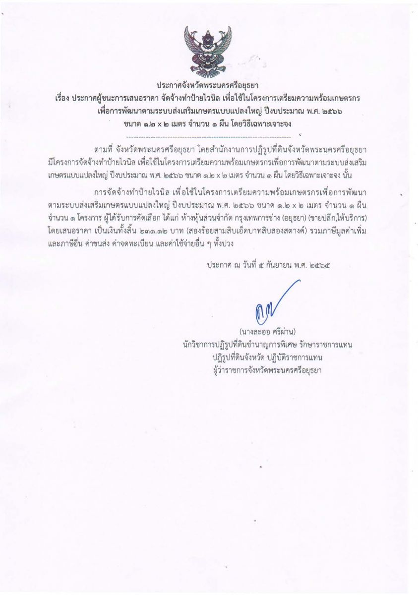 ประกาศจังหวัดพระนครศรีอยุธยา เรื่อง ประกาศผู้ชนะการเสนอราคาจัดจ้างทำป้ายไวนิล เพื่อใช้ในโครงการเตรียมความพร้อมเกษตรกรเพื่อการพัฒนาตามระบบส่งเสริมเกษตรแบบแปลงใหญ่ ปีงบประมาณ พ.ศ. 2566 ขนาด 1.2 x 2 เมตร จำนวน 1 ผืน โดยวิธีเฉพาะเจาะจง