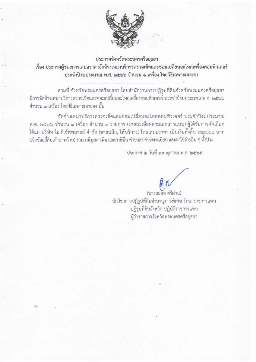 ประกาศจังหวัดพระนครศรีอยุธยา เรื่อง ประกาศผู้ชนะการเสนอราคาจัดจ้างเหมาบริการตรวจเช็คและซ่อมเปลี่ยนอะไหล่เครื่องคอมพิวเตอร์ ประจำปีงบประมาณ พ.ศ. 2566 จำนวน 1 เครื่อง โดยวิธีเฉพาะเจาะจง