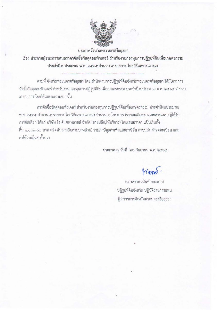 ประกาศจังหวัดพระนครศรีอยุธยา เรื่อง ประกาศผู้ชนะการเสนอราคาจัดซื้อวัสดุคอมพิวเตอร์ สำหรับงานกองทุนการปฏิรูปที่ดินเพื่อเกษตรกรรม ประจำปีงบประมาณ พ.ศ. ๒๕๖๕ จำนวน ๔ รายการ โดยวิธีเฉพาะเจาะจง